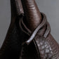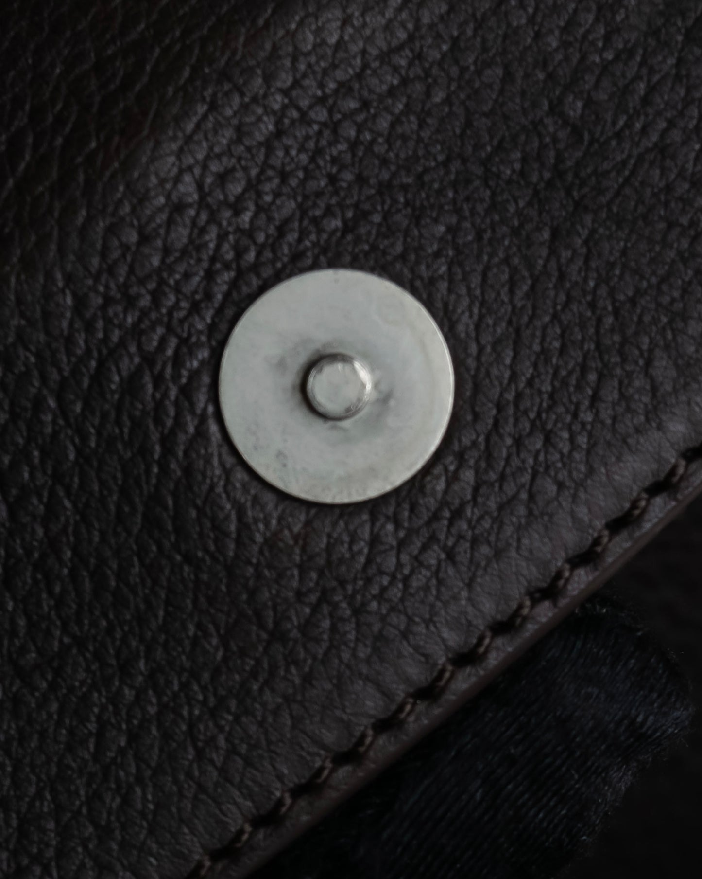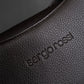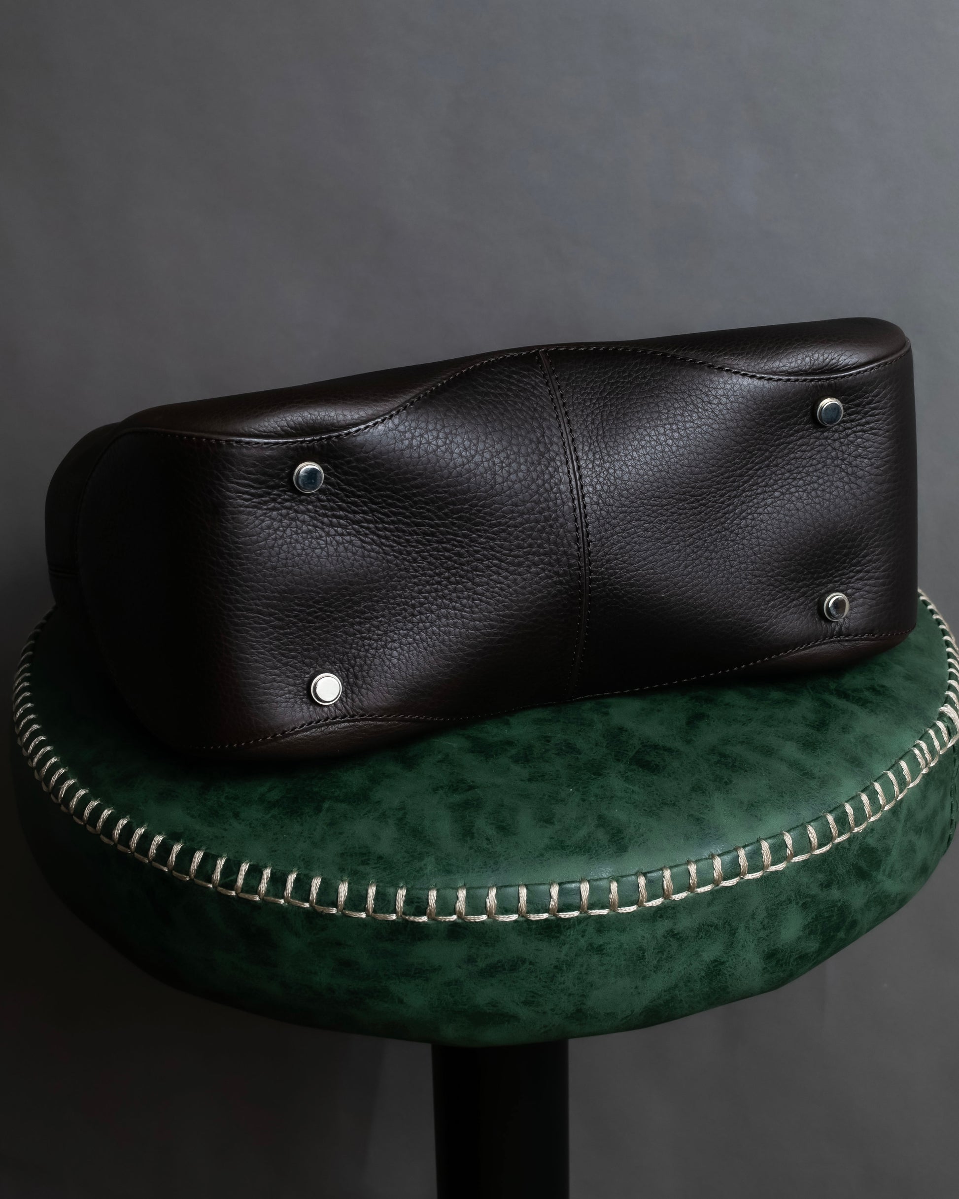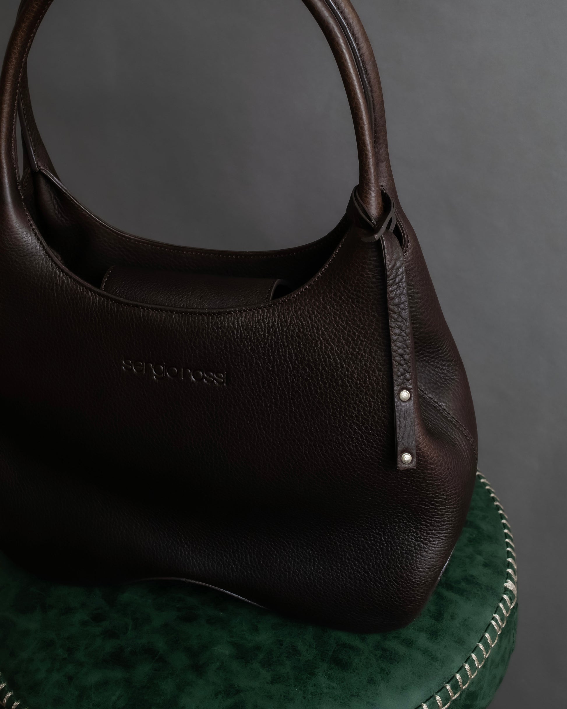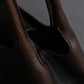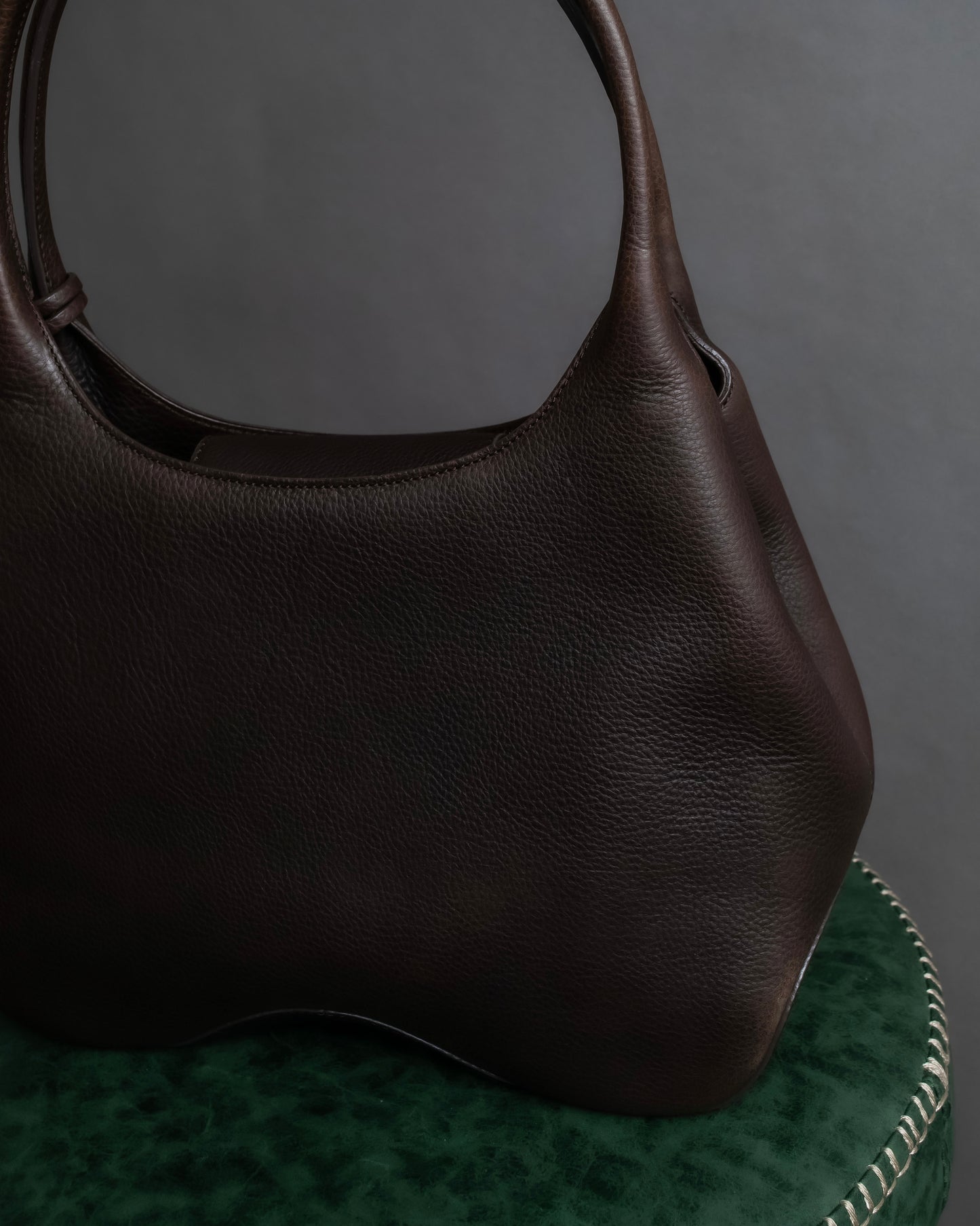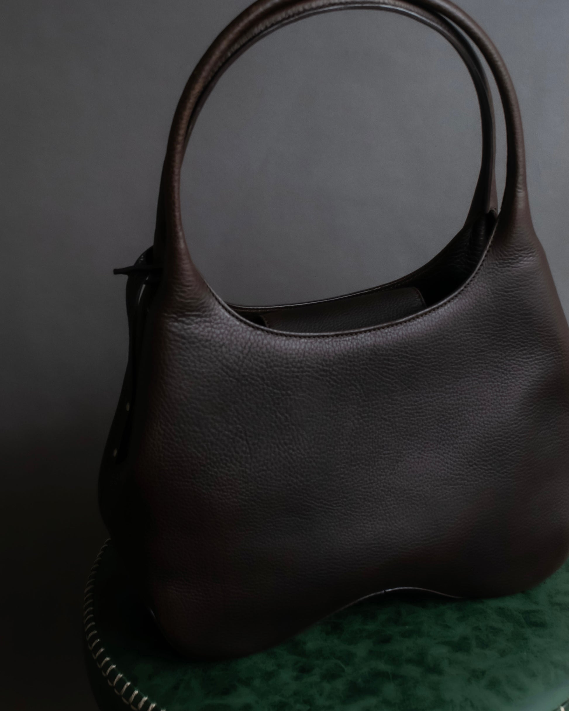 波打つように緩やかに曲線を描くボディは、イタリア製グレインレザーのしなやかさとコシのある張り感が織りなす構造美によって、道具としての機能性とファッションピースとしての彫刻性を巧みに両立させています。