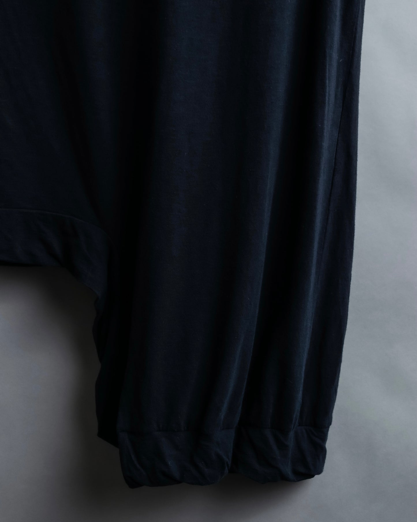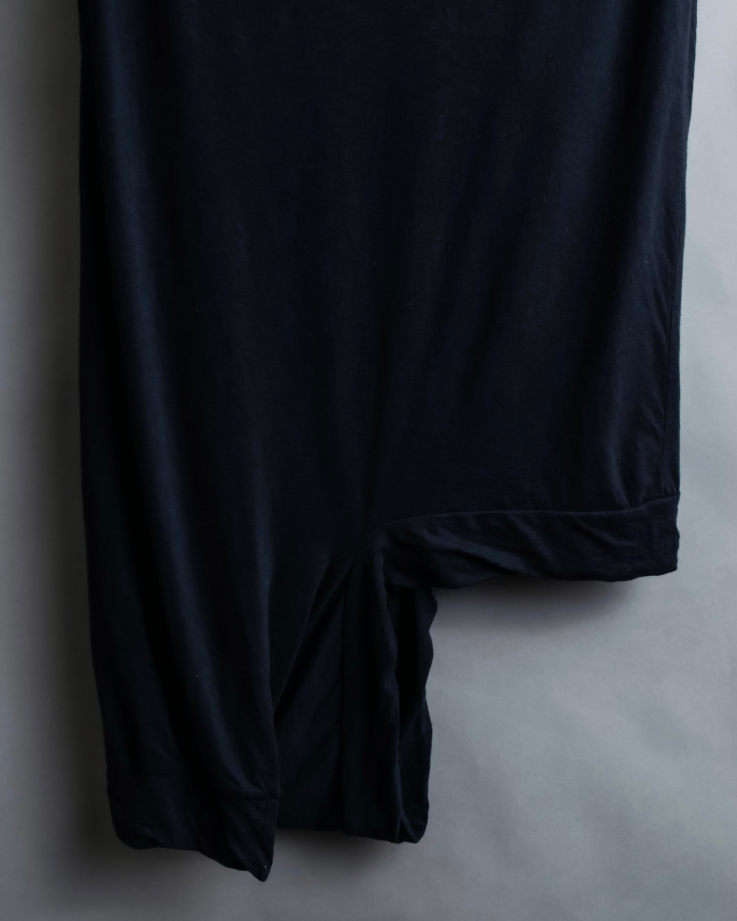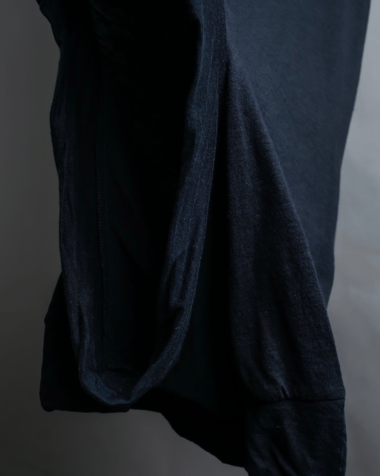 注目するべきは、アシンメトリーになった裾のデザインで、L字のラインに沿う様にボディーを縫い合わせているため、着用した際に片方側にドレープ感が偏る様な独特のシルエットが作り出されます。