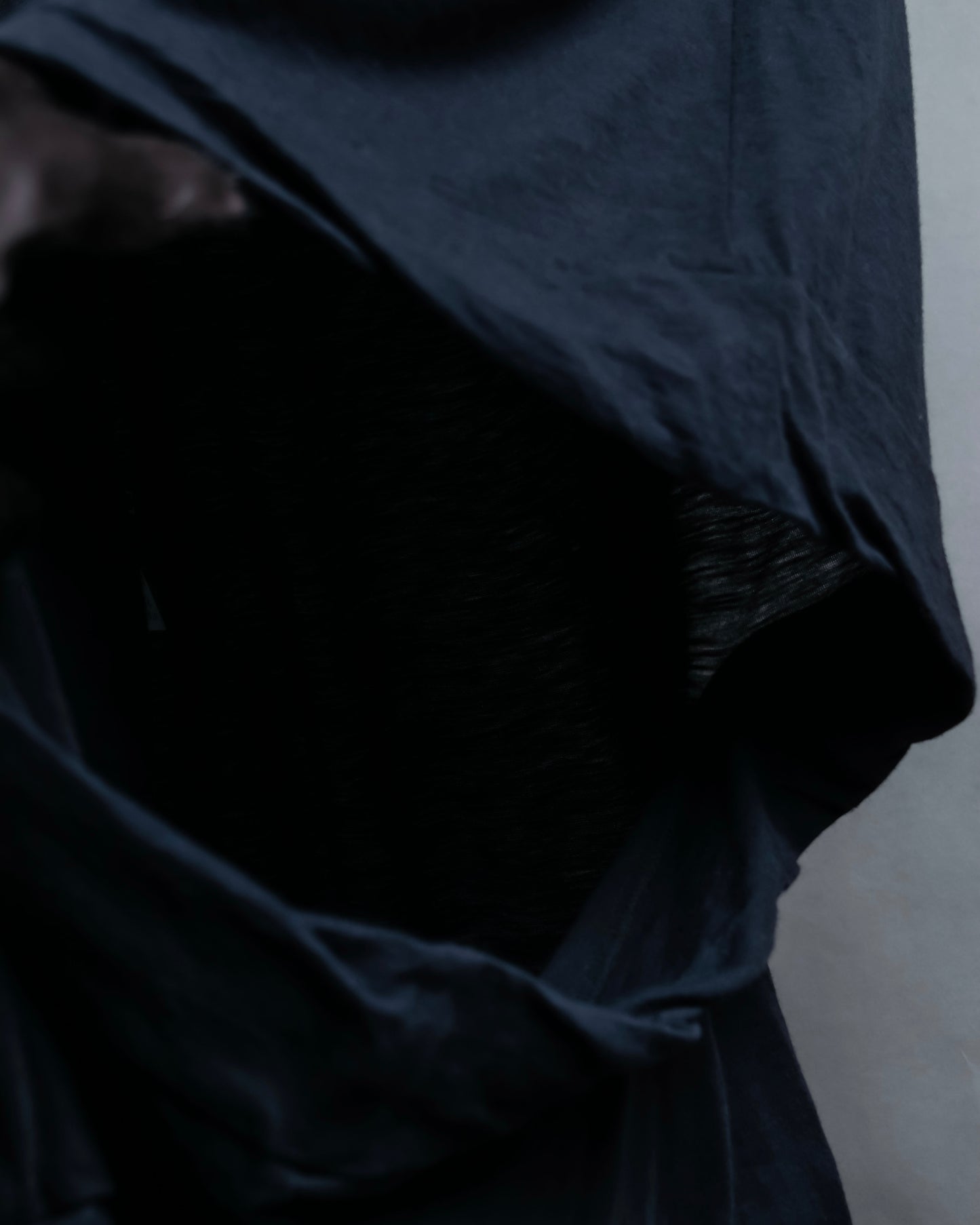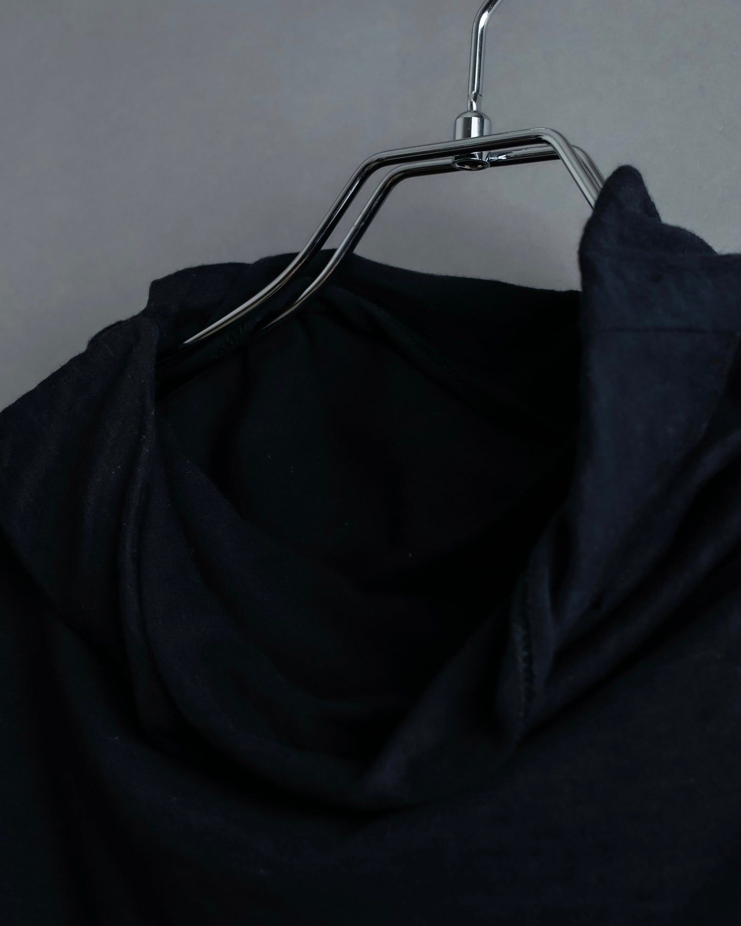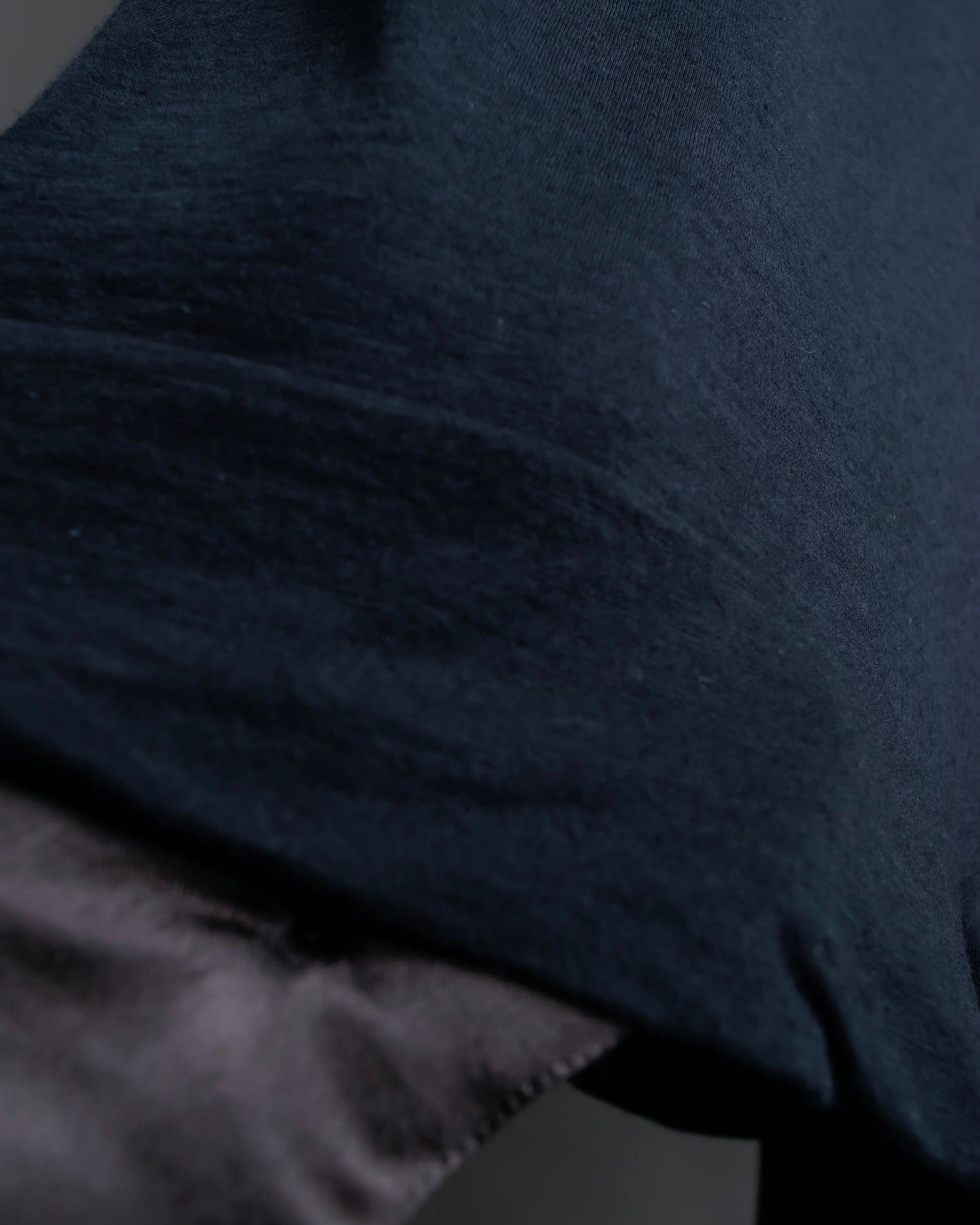 注目するべきは、アシンメトリーになった裾のデザインで、L字のラインに沿う様にボディーを縫い合わせているため、着用した際に片方側にドレープ感が偏る様な独特のシルエットが作り出されます。