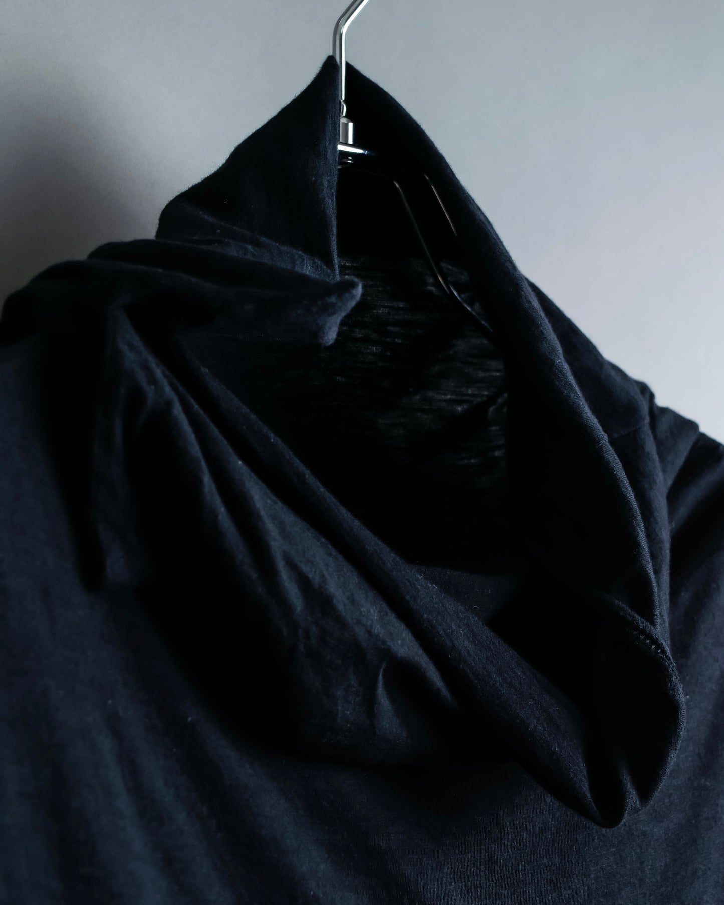 首元はゆるめになったハイネックの様な仕様で、首元がやや開いているため詰まった印象にならずにご着用頂けます。前側にネックを寄せて、ドレープ感を作りつつやや肌を見せる他、高めに溜めてハイネック感を強調してのご着用という2通りでお楽しみ頂けますね。