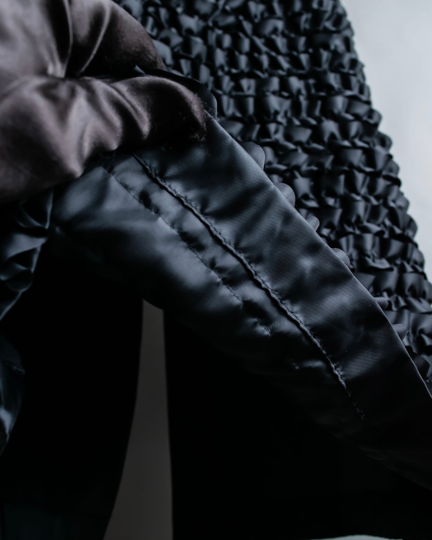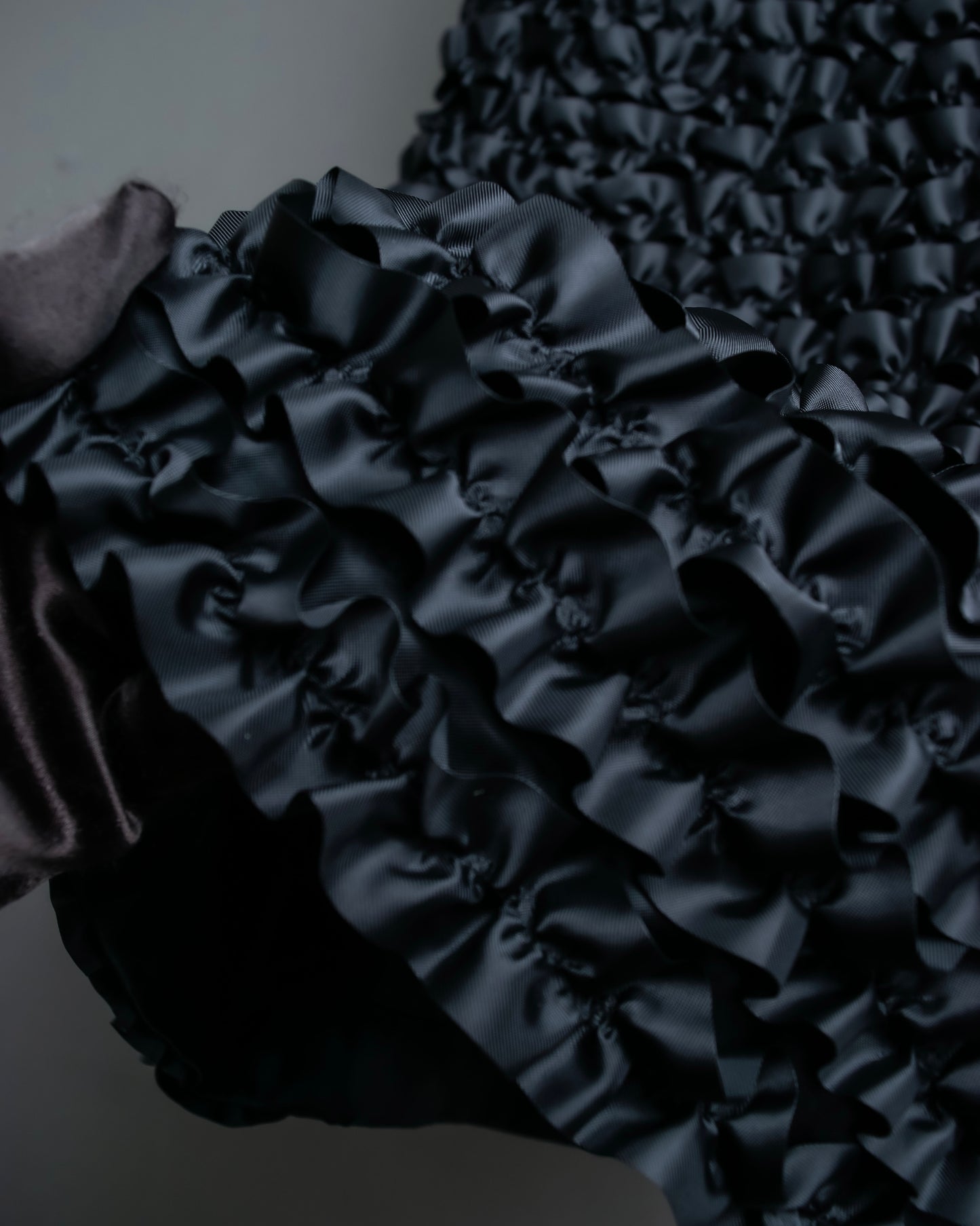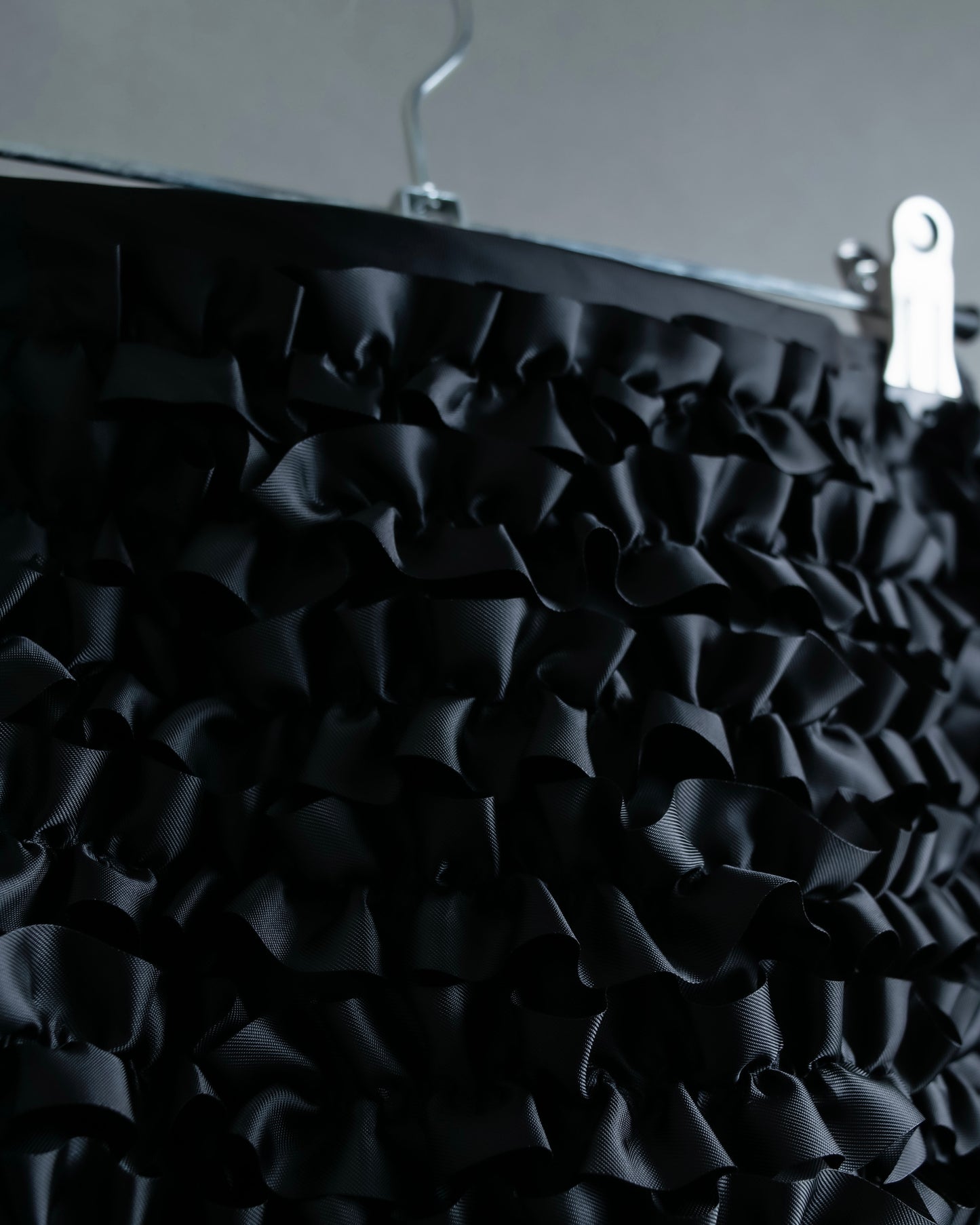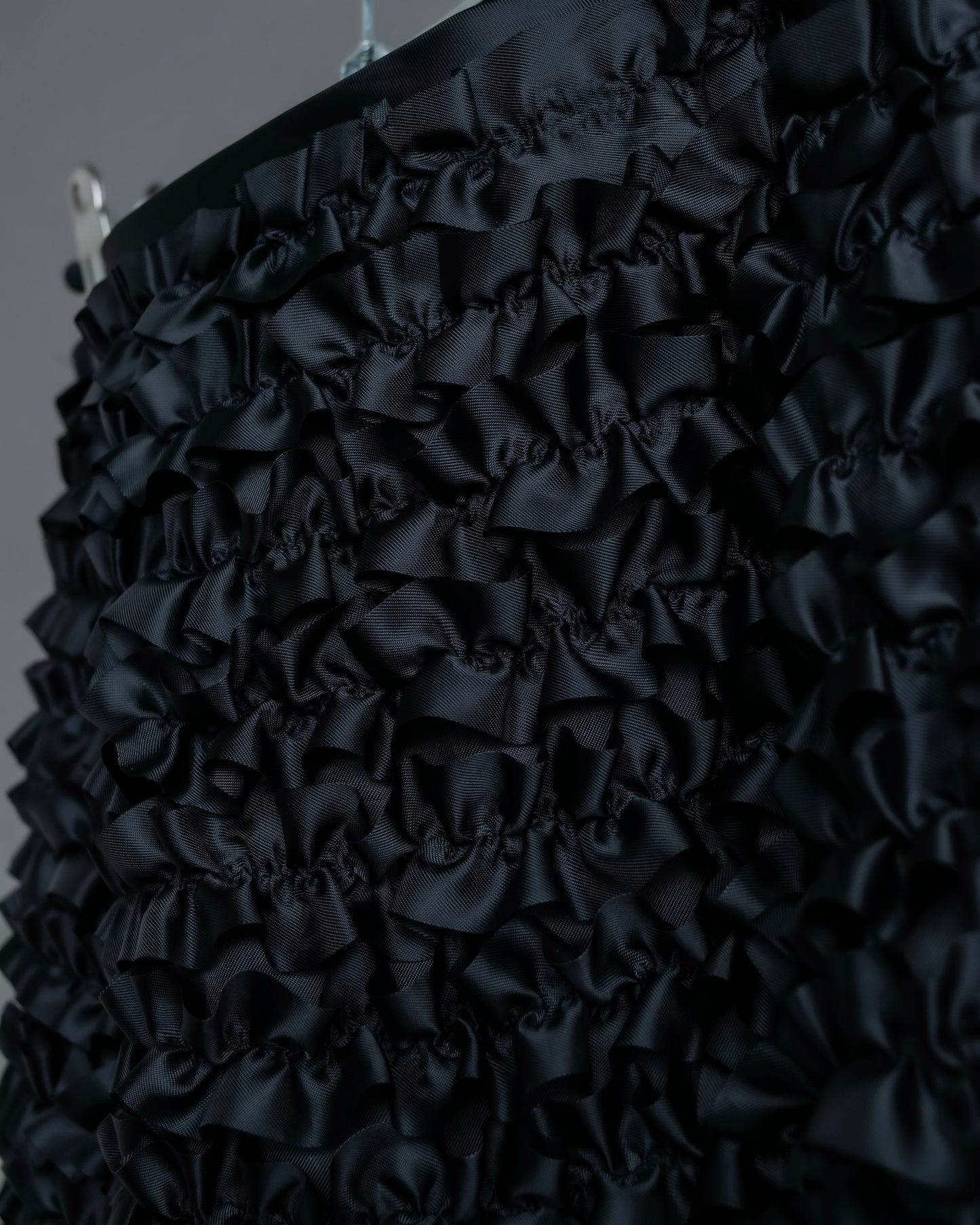 注目すべきは、前面に施されたリボンをギャザーをつけながら縫い付けたような大胆なデザイン。隙間なく並べられたリボンを丁寧に細かく取り付けた大変手の込んだデザインで、リボンの上品な印象と全体のアヴァンギャルドな雰囲気のバランスの取れた、大変ファッショナブルなアイテムとなっております。