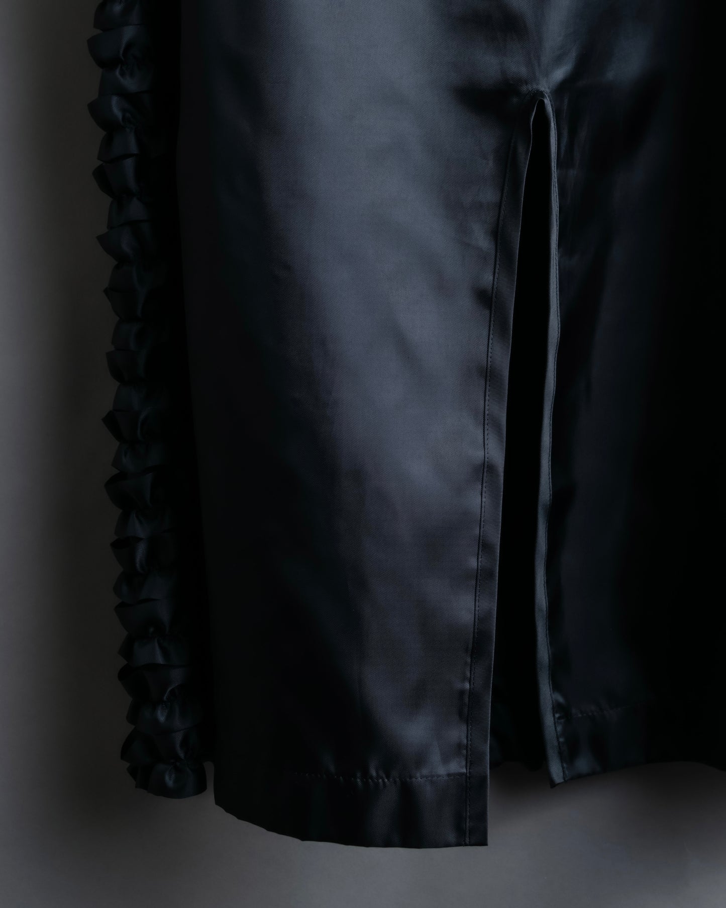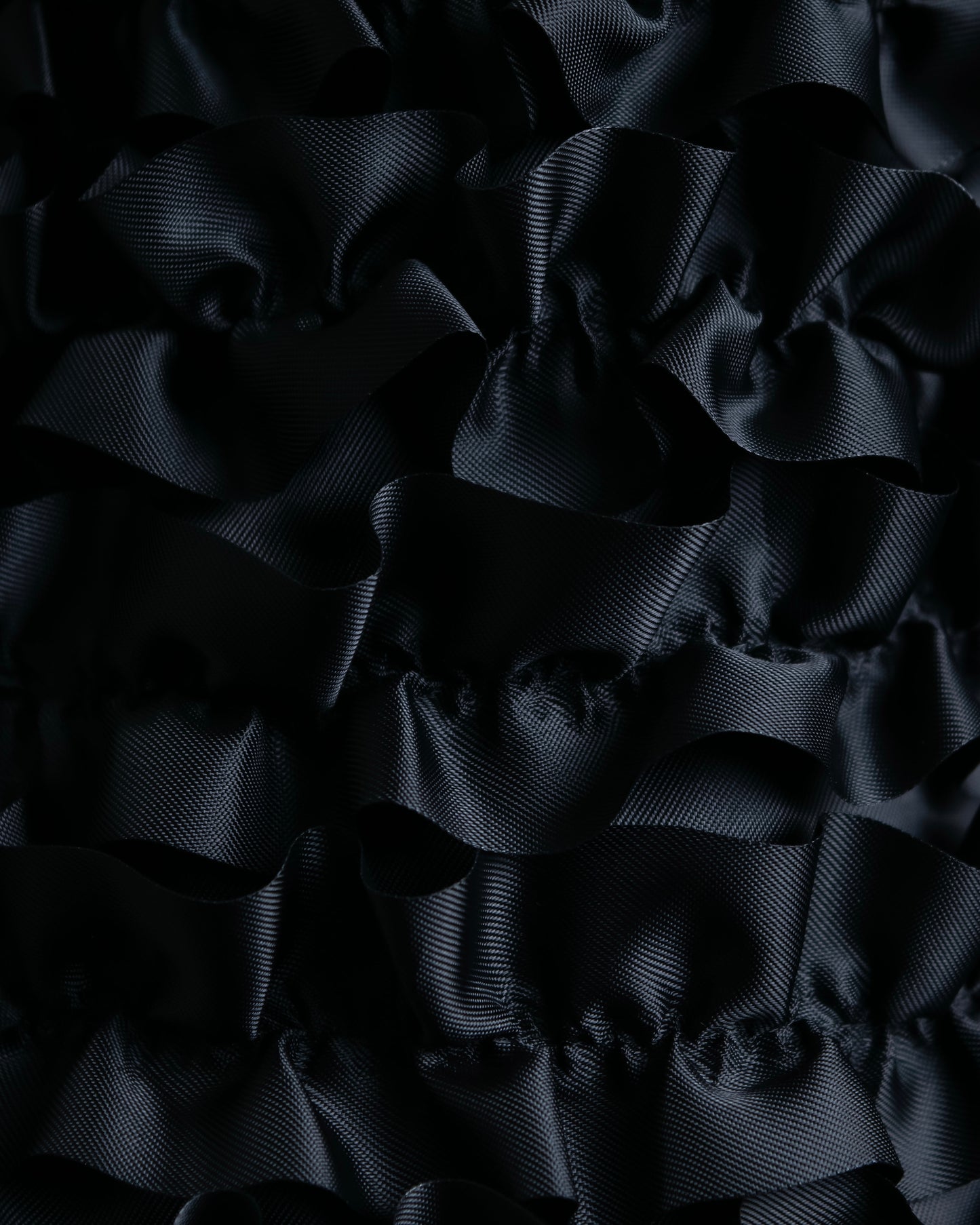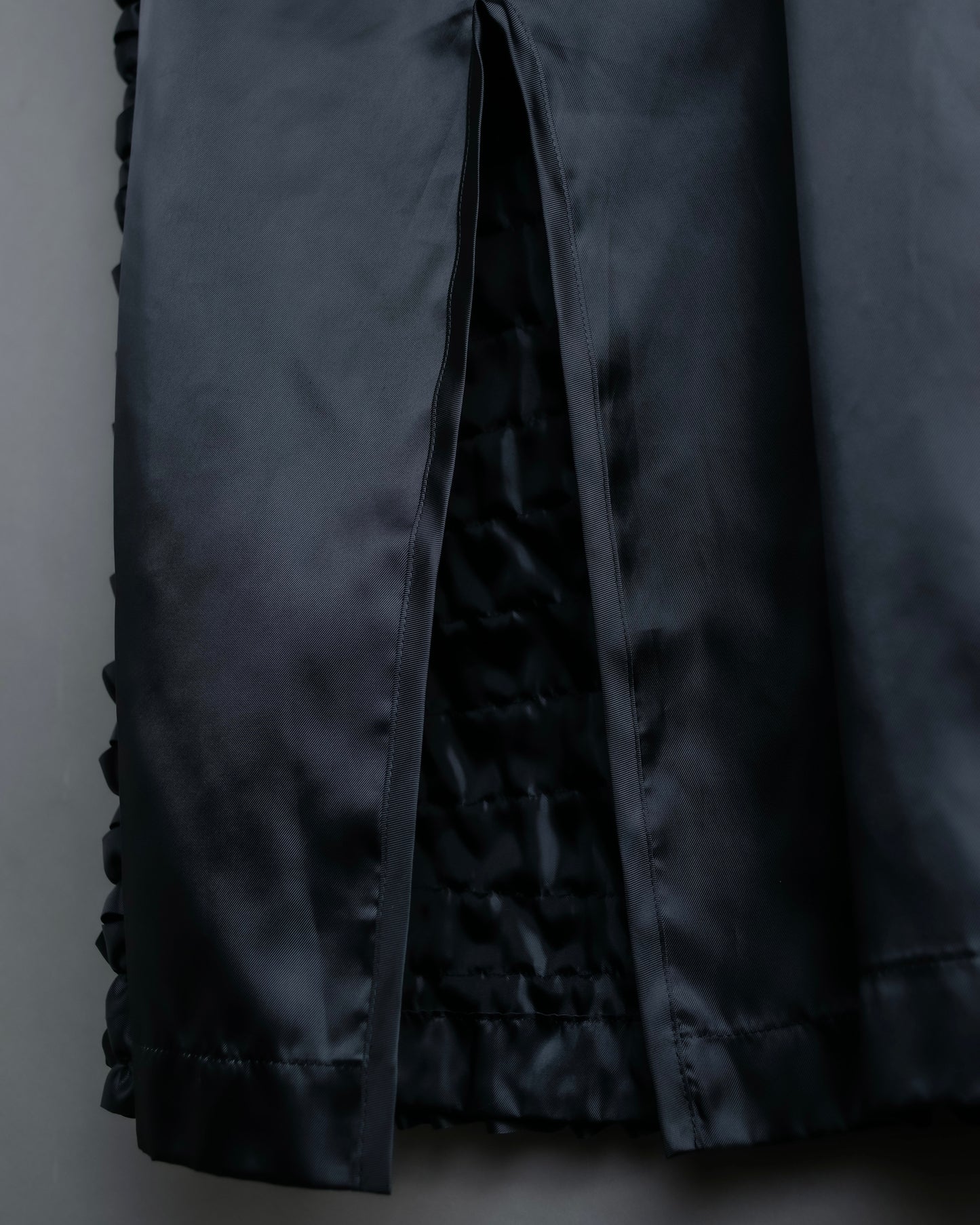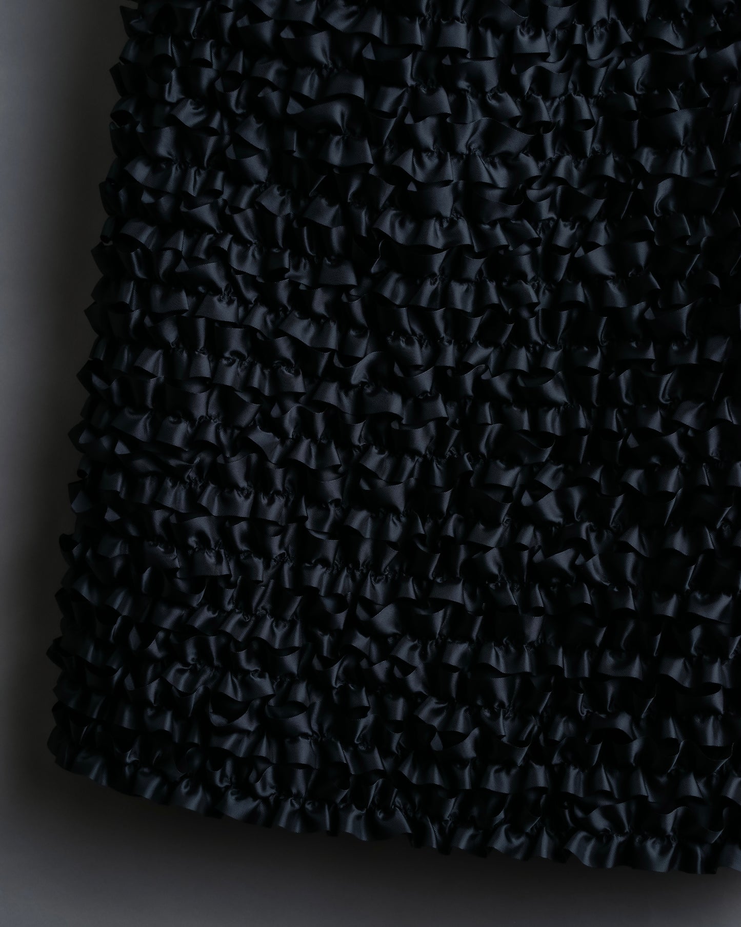 注目すべきは、前面に施されたリボンをギャザーをつけながら縫い付けたような大胆なデザイン。隙間なく並べられたリボンを丁寧に細かく取り付けた大変手の込んだデザインで、リボンの上品な印象と全体のアヴァンギャルドな雰囲気のバランスの取れた、大変ファッショナブルなアイテムとなっております。