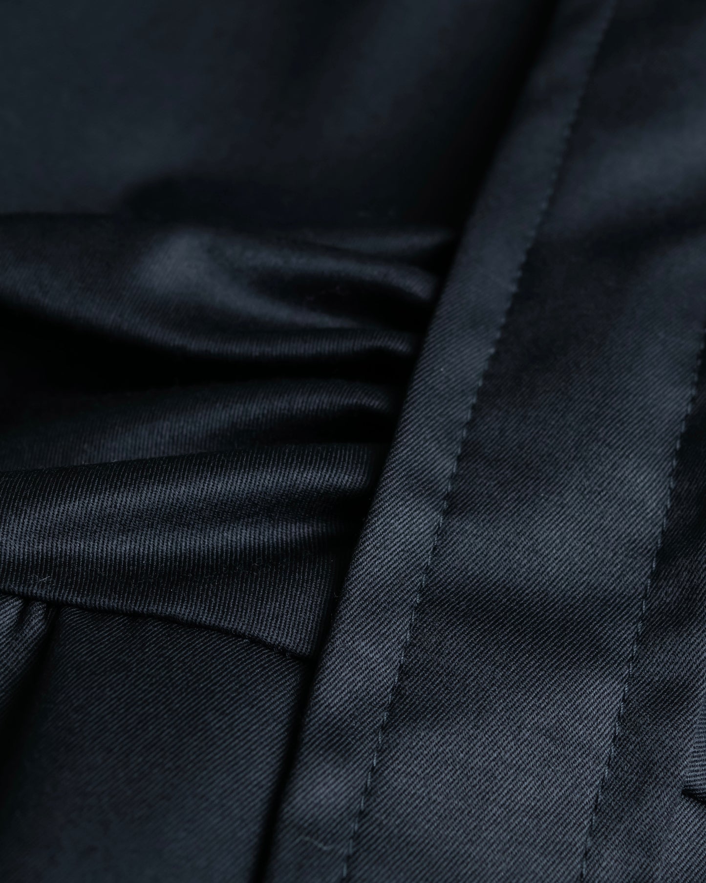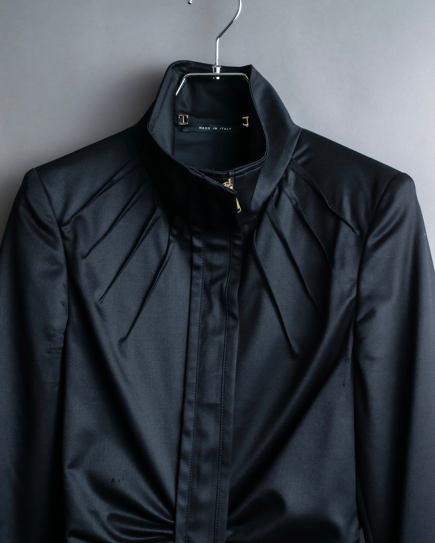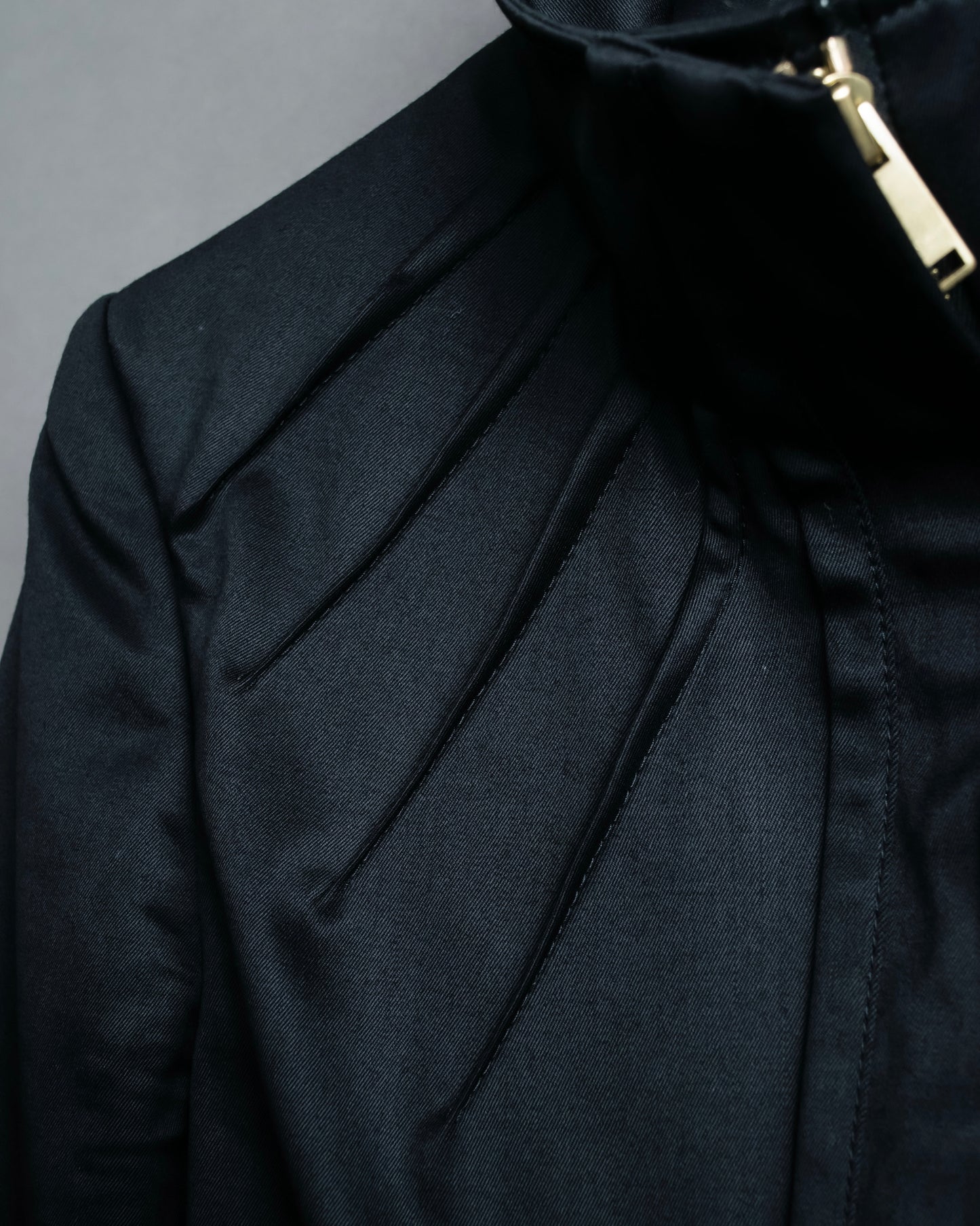 首周りが上品に仕上がるスタンドネック仕様となっている他、比翼仕立てのダブルジップになっている為、