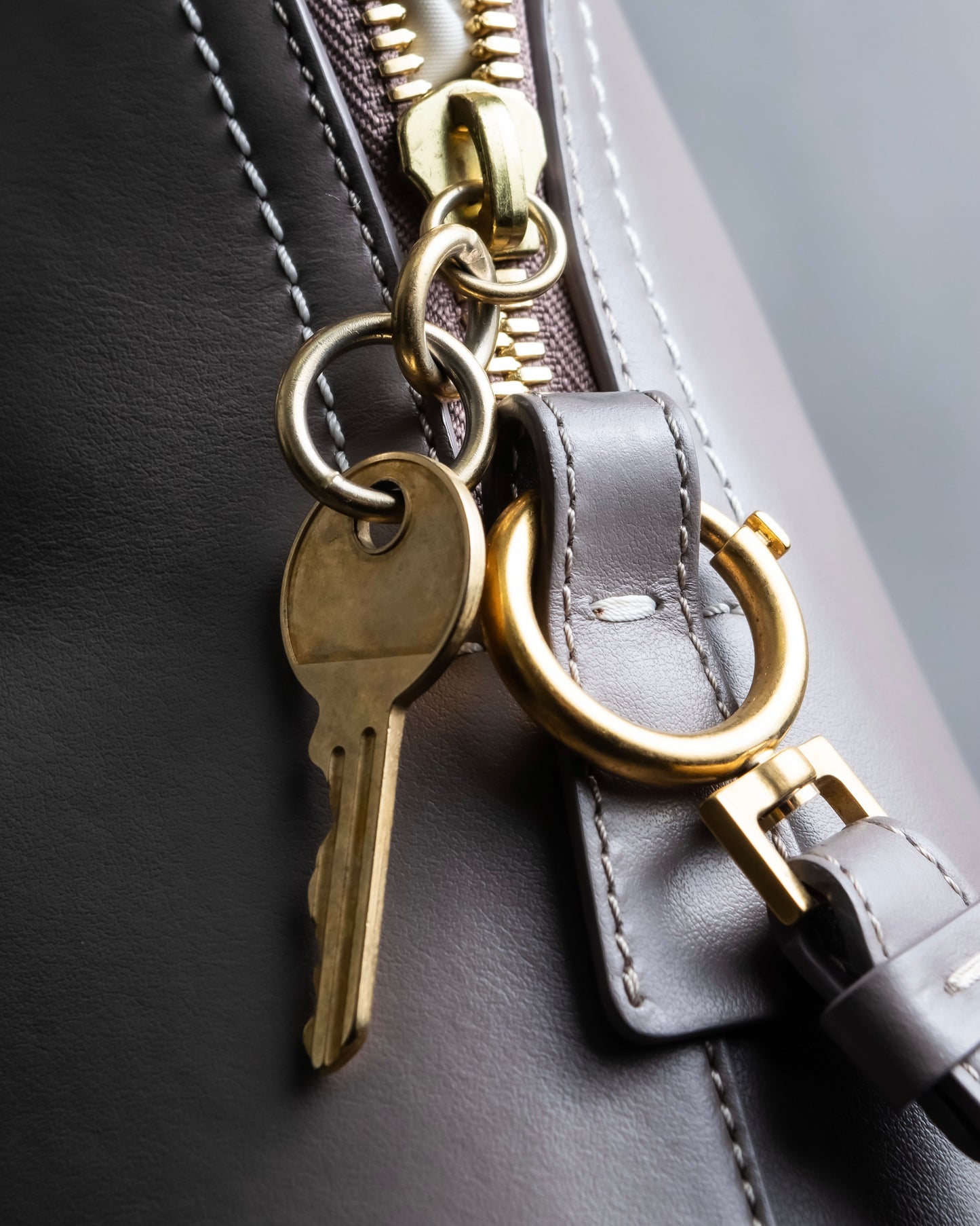 またバッグの根革付近やカシメに付属しているゴールドのチャームやメタルパーツがバッグ全台の印象を引き締めつつ、