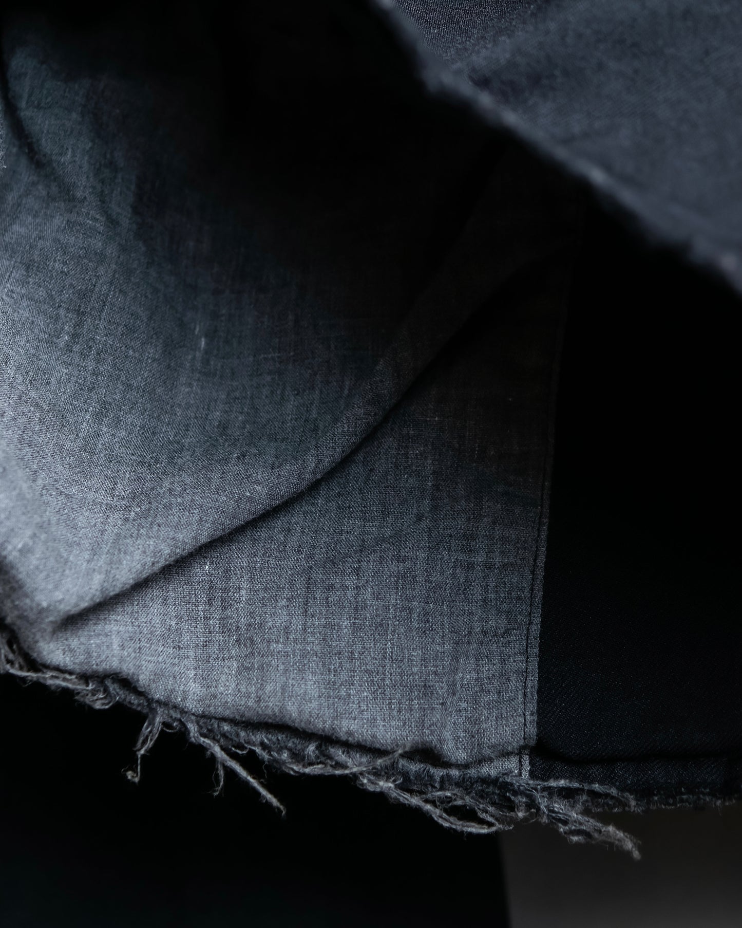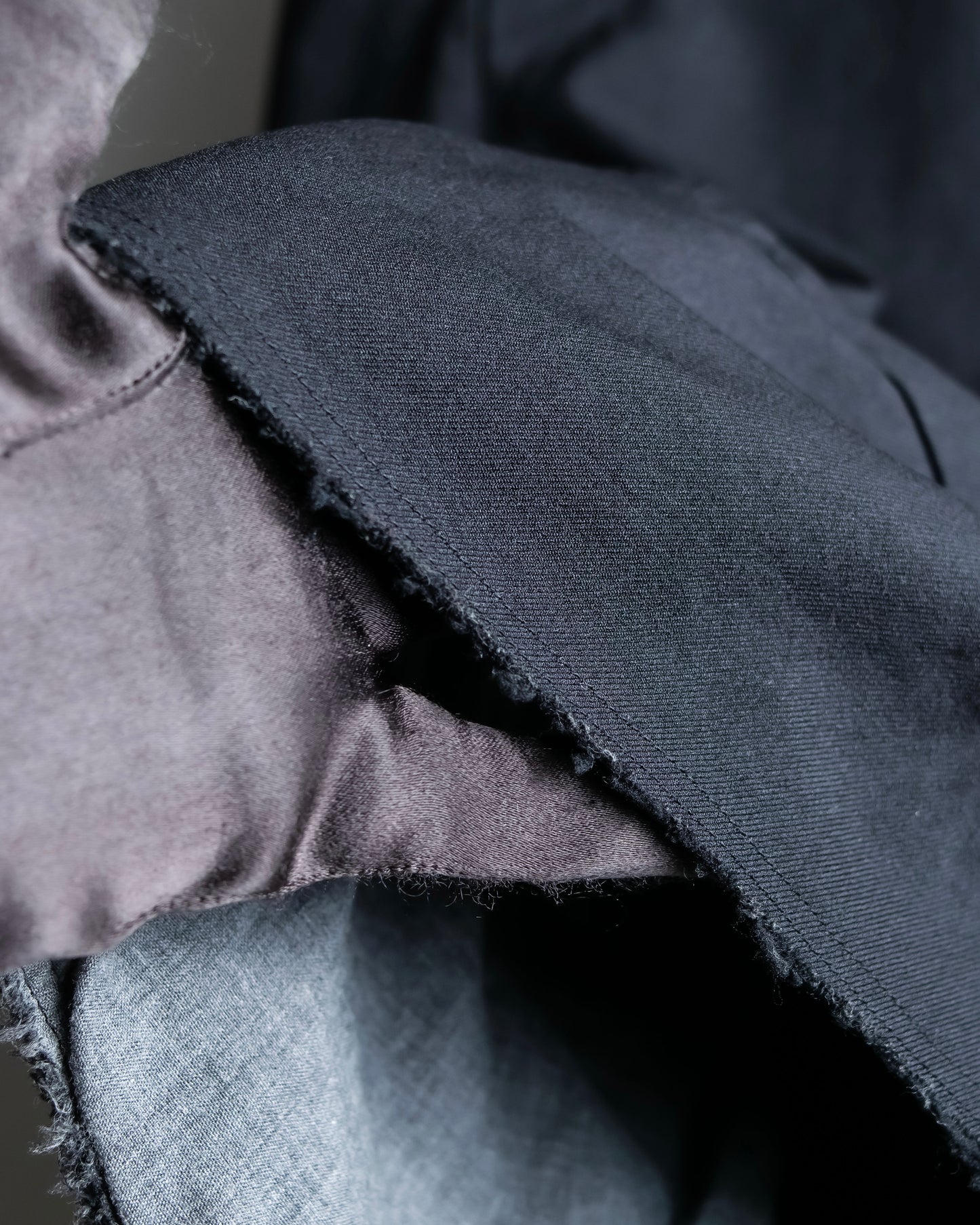 更には裾に切りっぱなしの加工がされており、ブランドのアバンギャルドさを感じるほつれたディテールが退廃的な美しさを演出しております。
