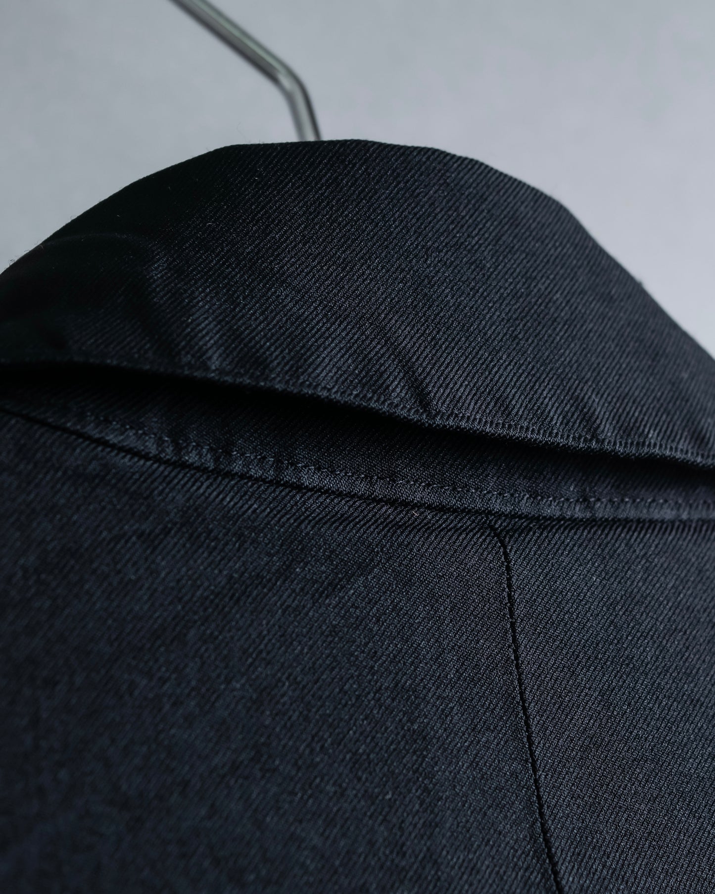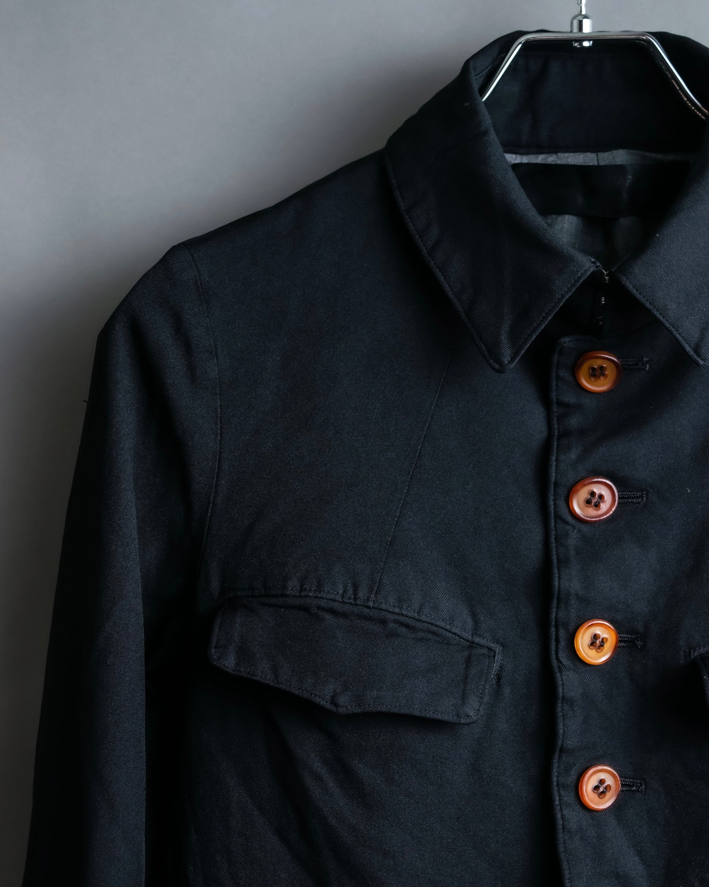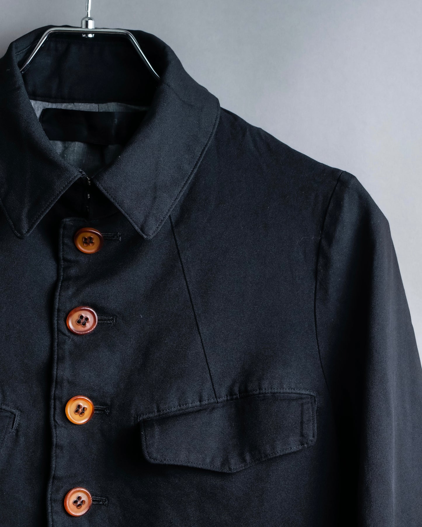 襟周りが格式高い印象を受けるスタンドカラーとなっており、コムデギャルソンといえばお馴染みの水牛ボタンがフロントに大胆に施されているのが、何とも印象的です。