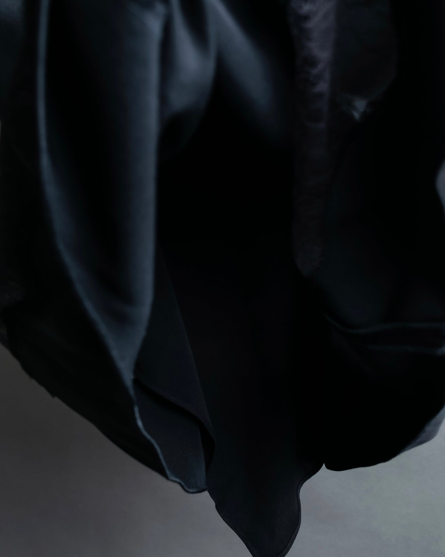 素材は高級素材であるシルクを100%使用しており、繊維断面が三角形のため光をあてるとプリズムのように光を反射し、