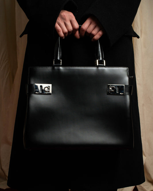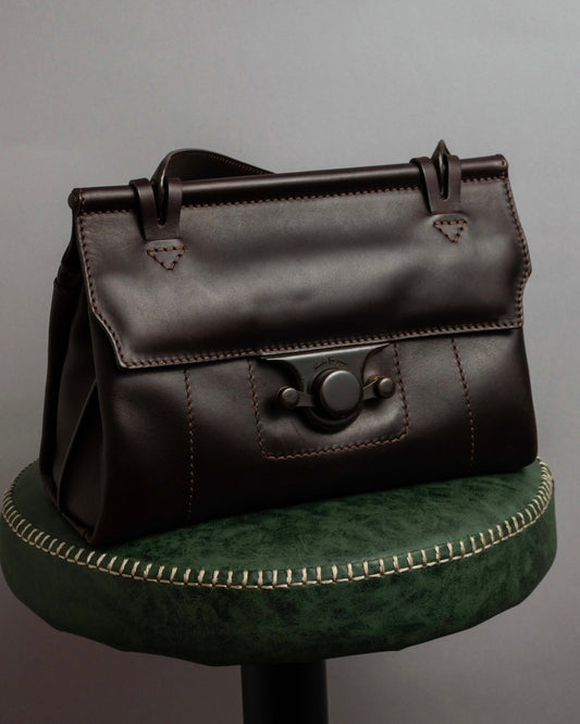 スタイリッシュな曲線美を描く台形のデザインと、無駄な装飾性を削ぎ落としたワンハンドルデザインが、レザーの持つ艶感をより一層引き立たせているクワイエットラグジュアリーを感じさせるこちらの逸品。