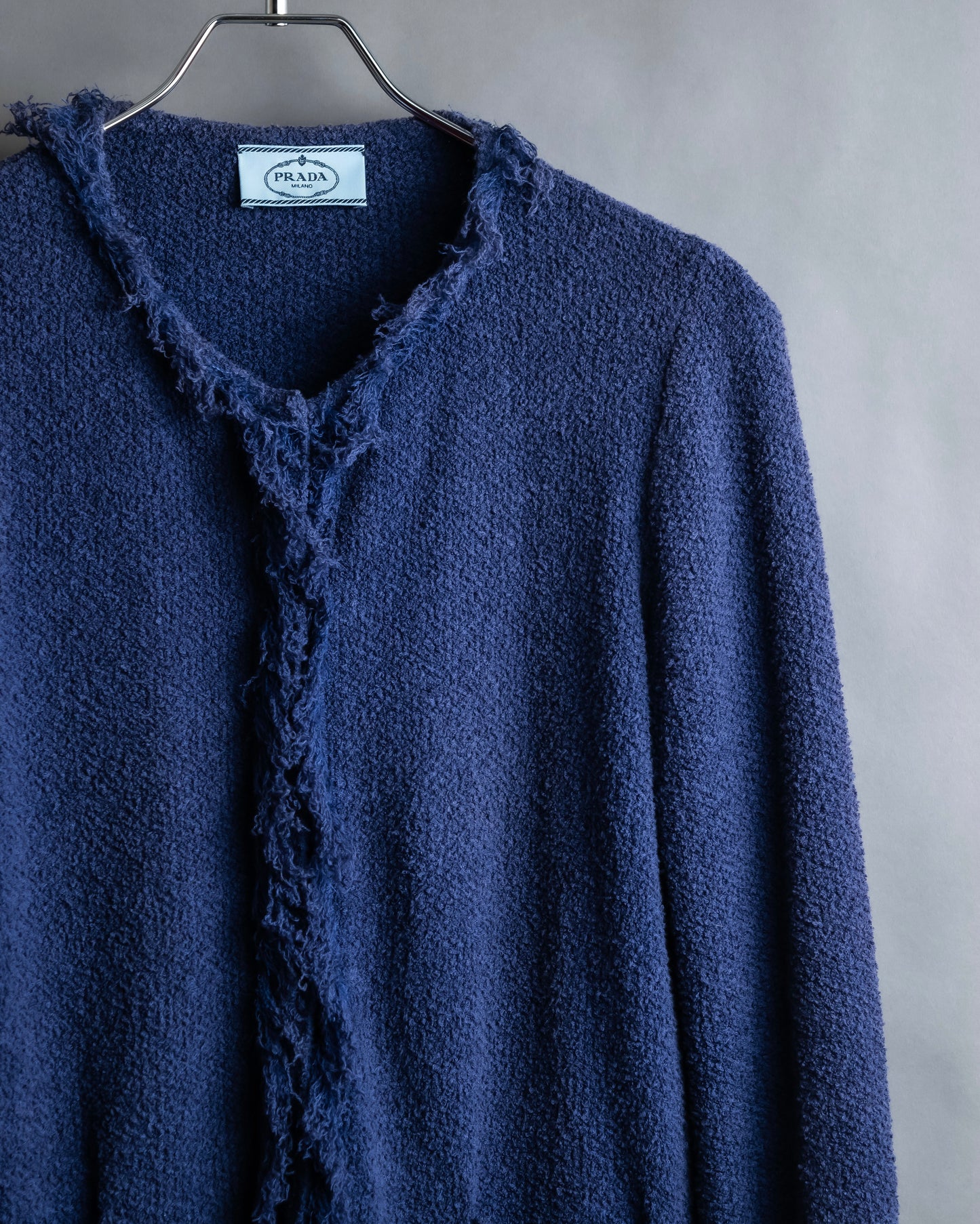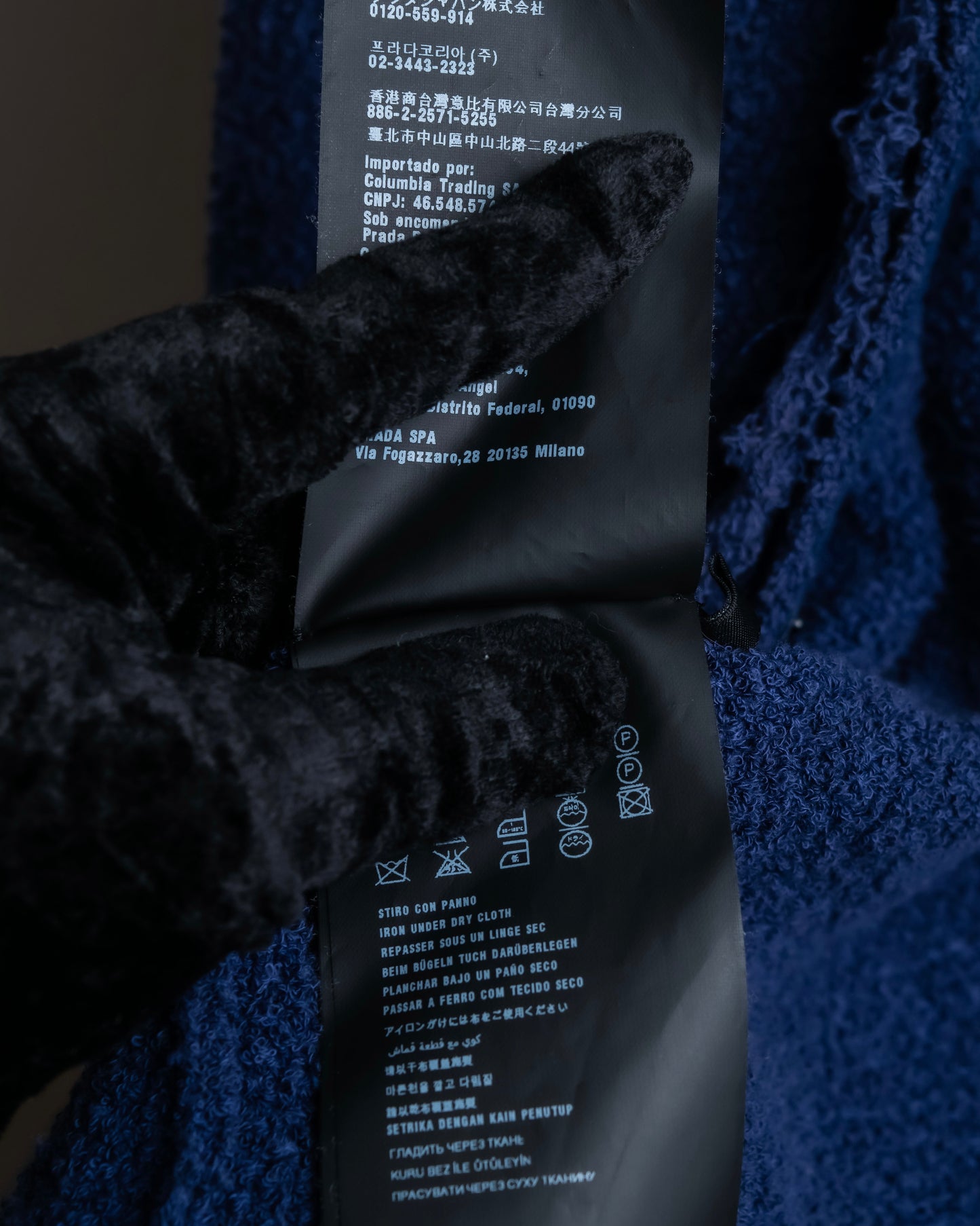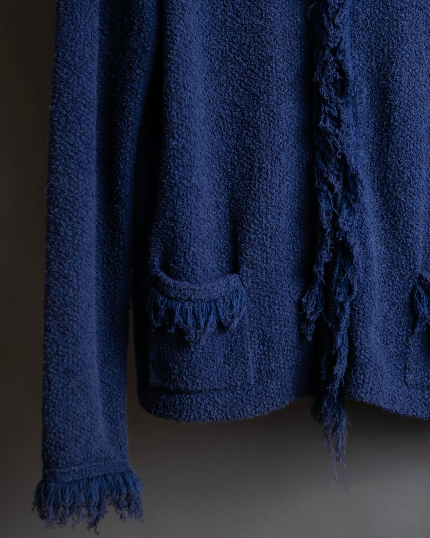 フリンジデザインとは対照的に、お色味は美しいネイビーとなっておりますので、上品に羽織って頂けるのが特徴で、プラダらしいラグジュアリー性をエッセンスに加えた対比のバランス感が魅力となっております。