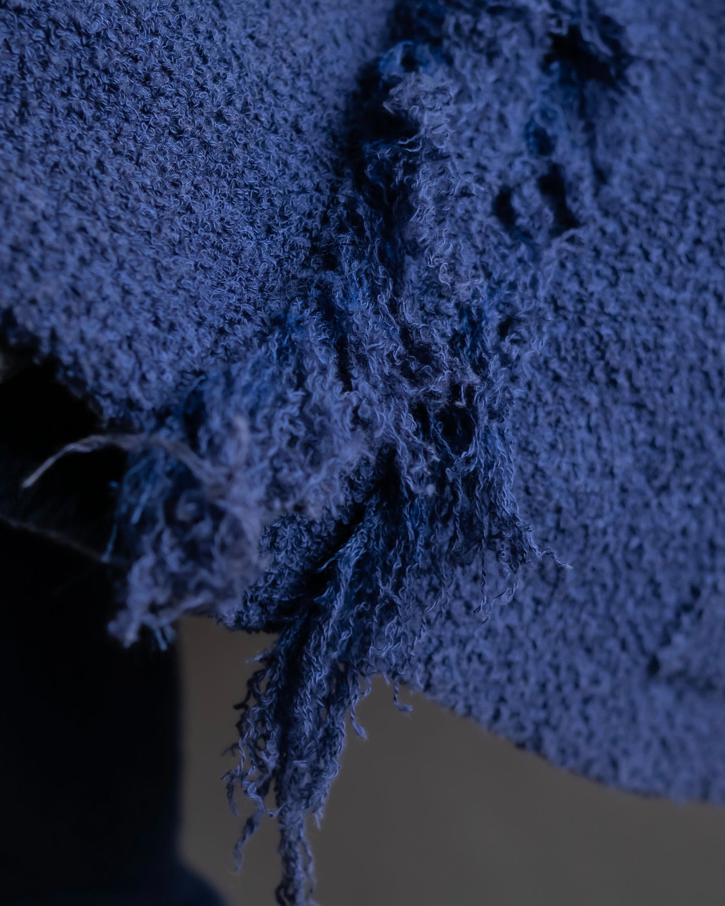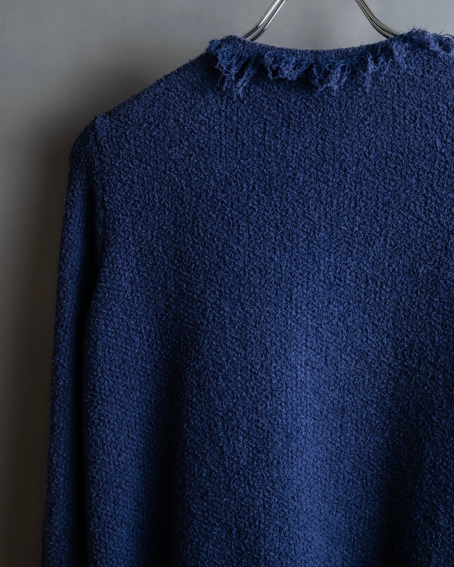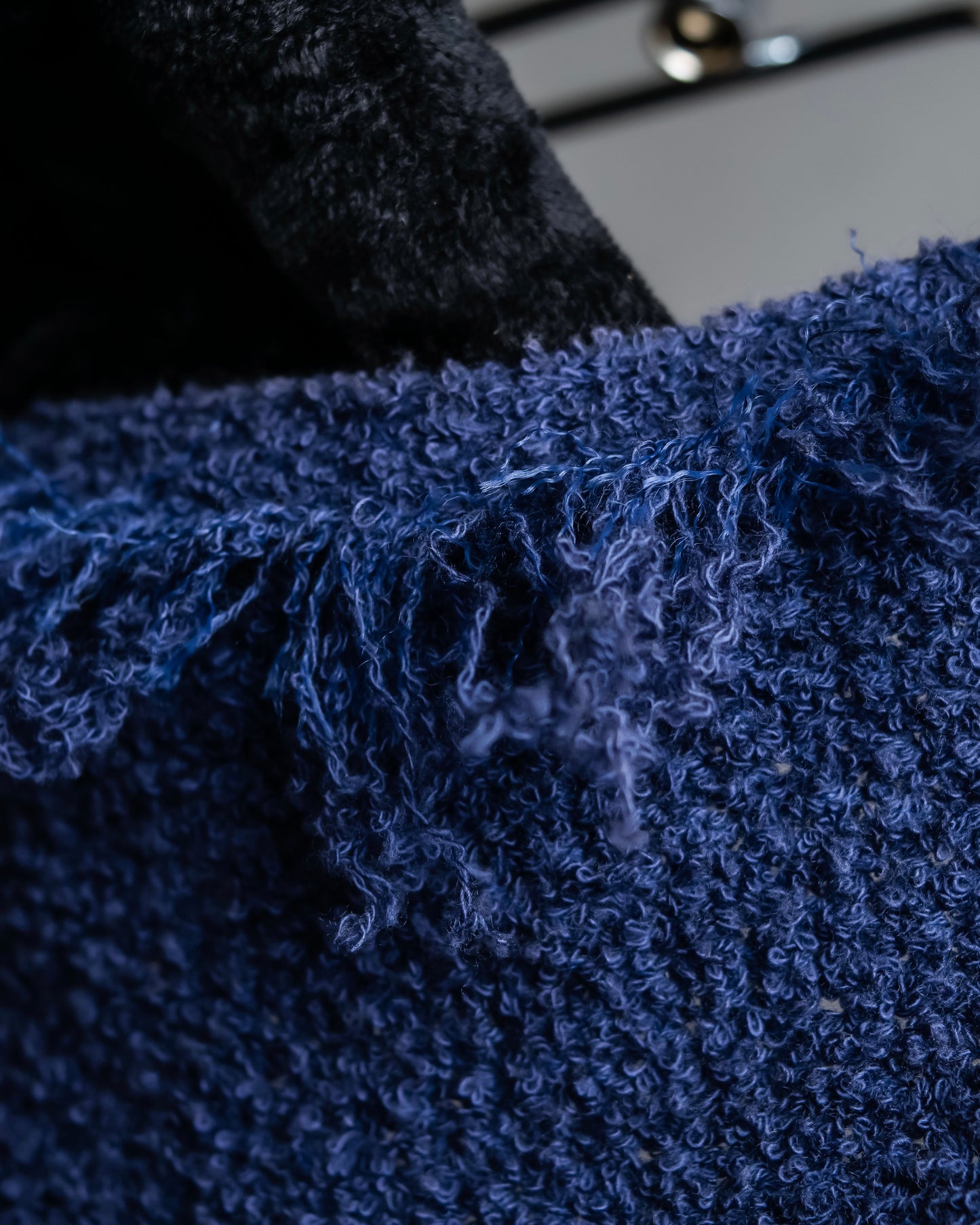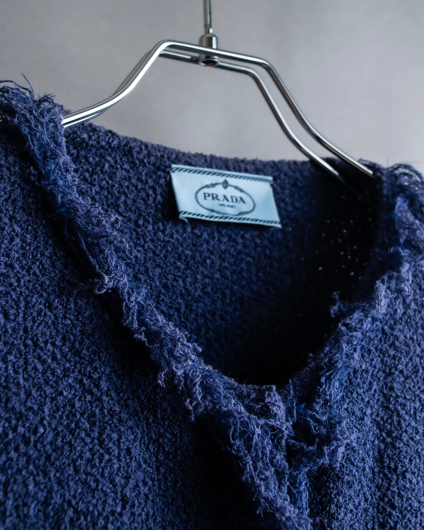 フリンジデザインとは対照的に、お色味は美しいネイビーとなっておりますので、上品に羽織って頂けるのが特徴で、プラダらしいラグジュアリー性をエッセンスに加えた対比のバランス感が魅力となっております。