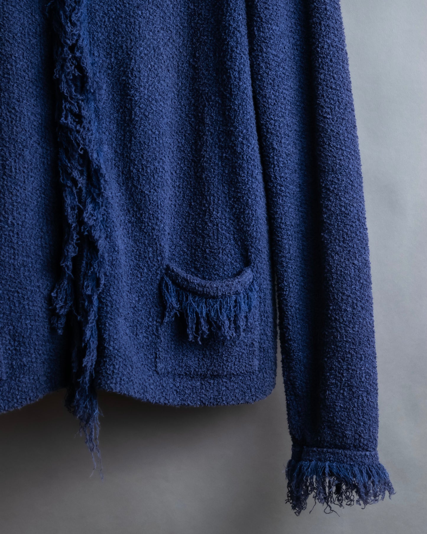 ネック回りや比翼部分、更にはポケット部分やカフス部分に大胆なフリンジ加工を施し、グランジテイストを想起させるデザイン性が特徴的なこちらの逸品。