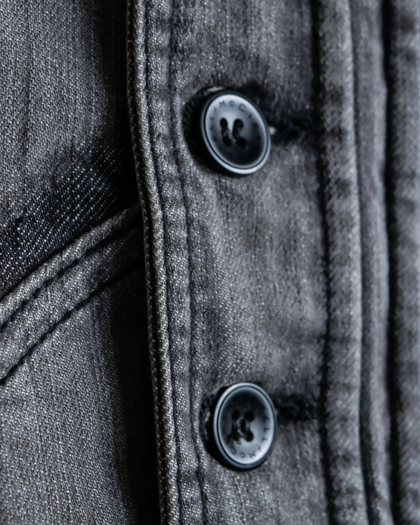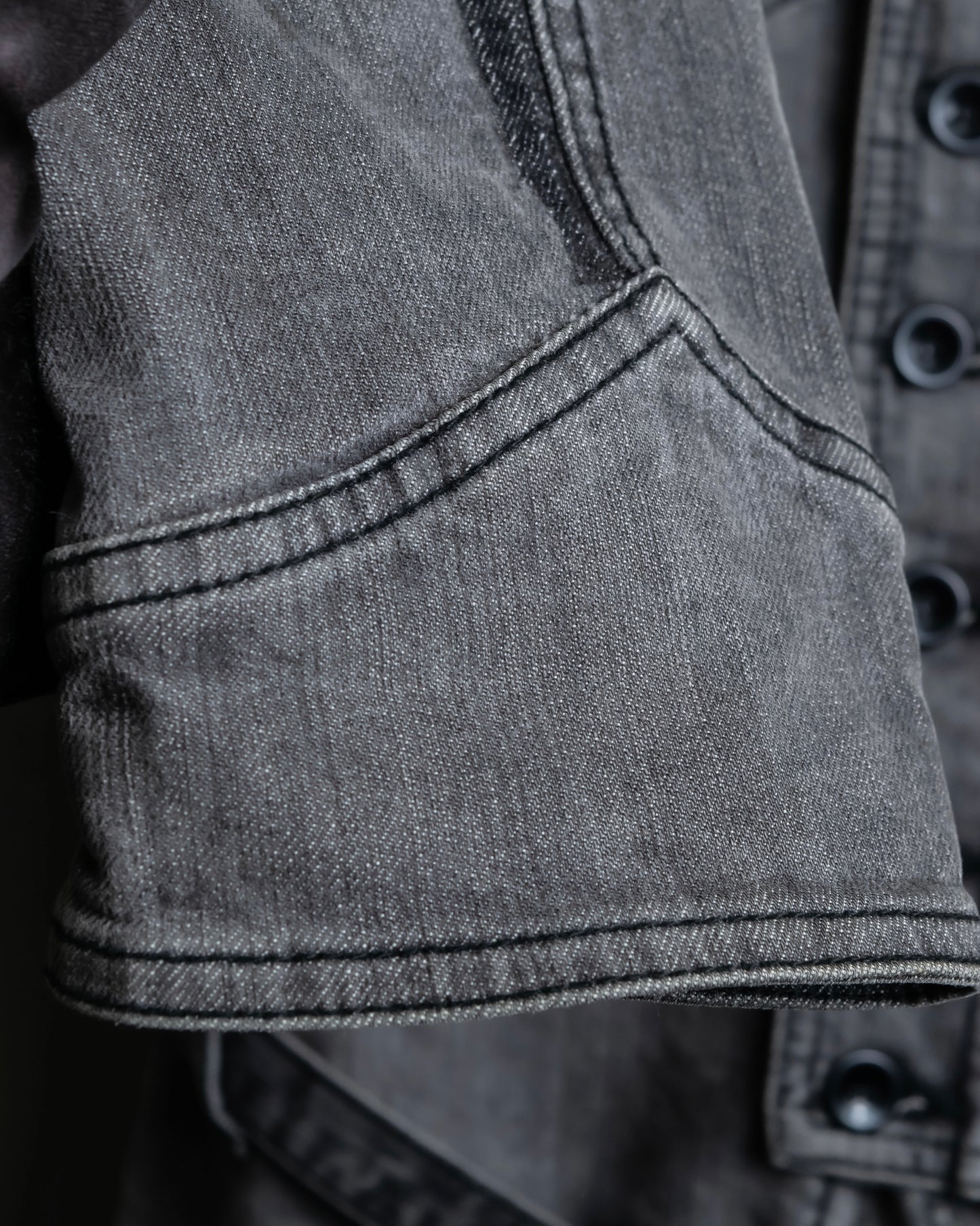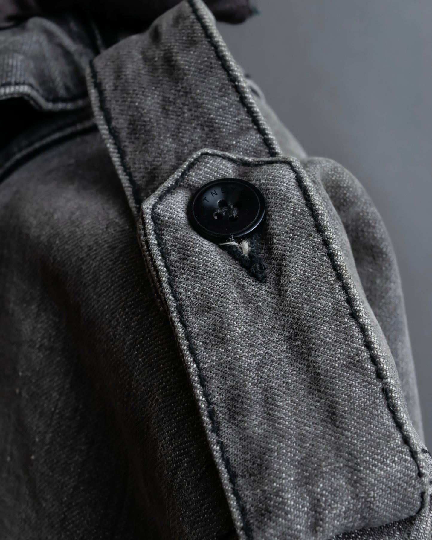 思わず目を奪われてしまうようなインパクトのあるデザインがふんだんに盛り込まれており、トレンチコートの様なスロートラッチやエポレットのミリタリーデザイン、ウエスタンシャツの様なポケットのデザイン、更にはフロントボタンに重ねた比翼仕立てのジップデザインがアクセントになっております。