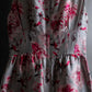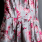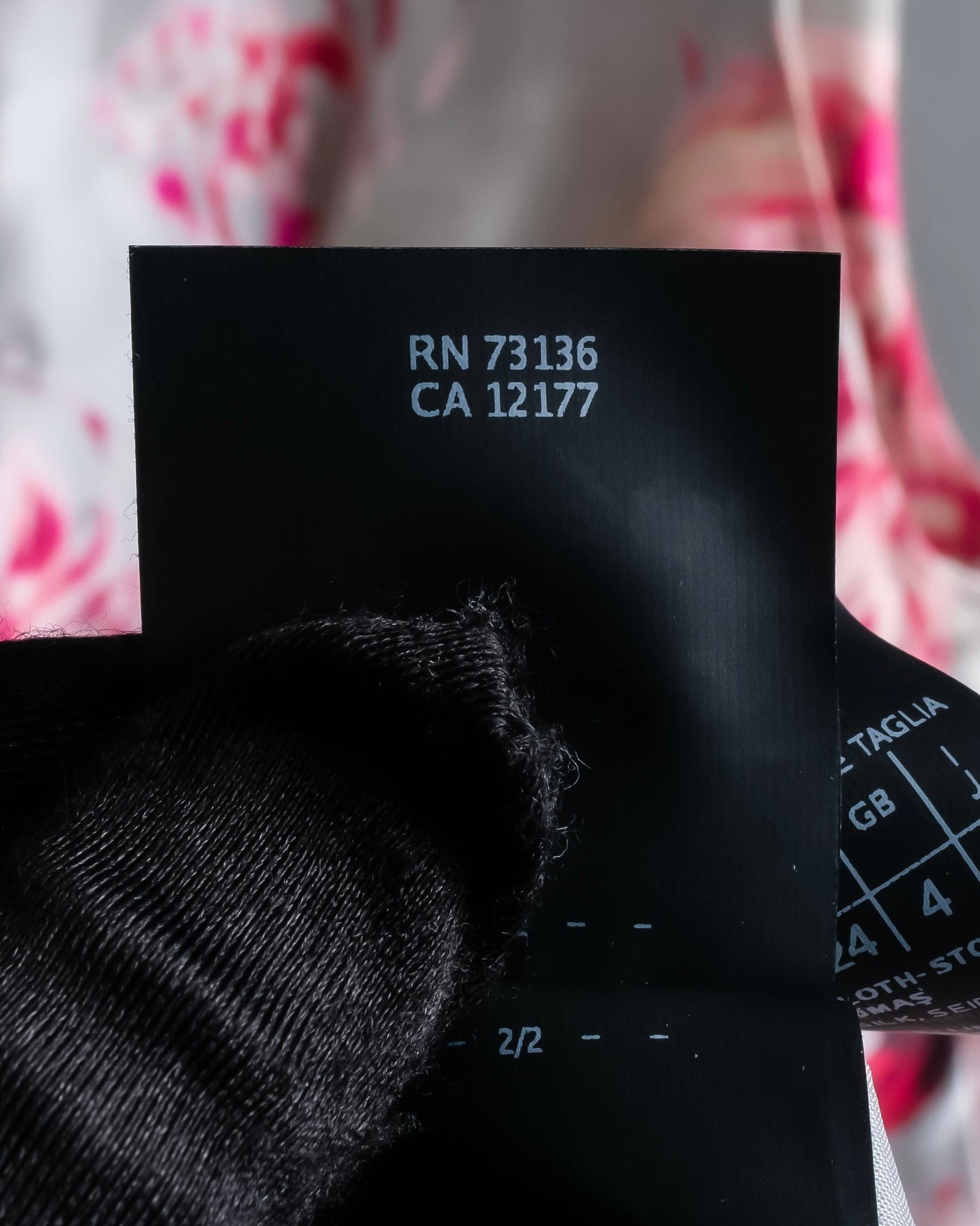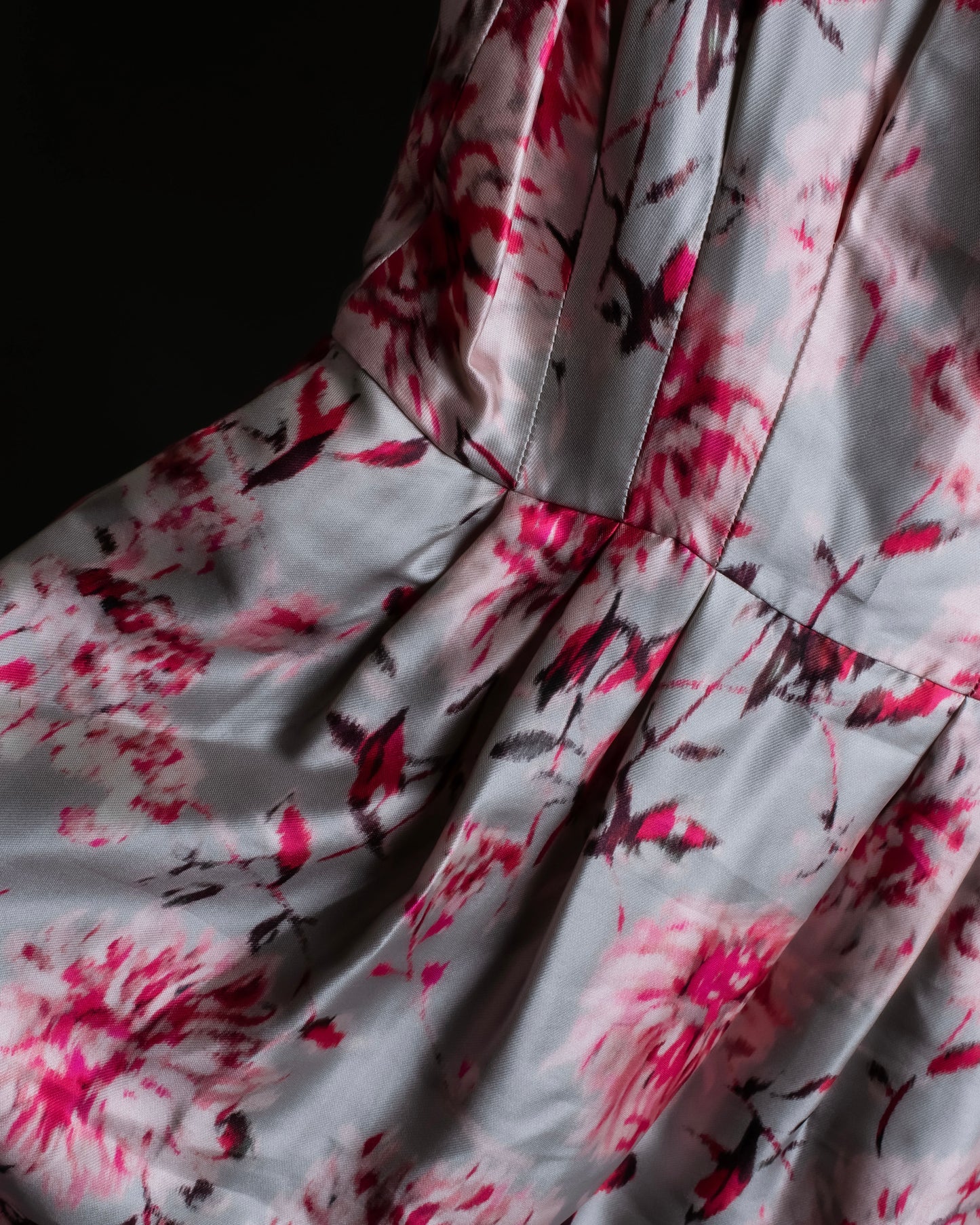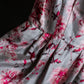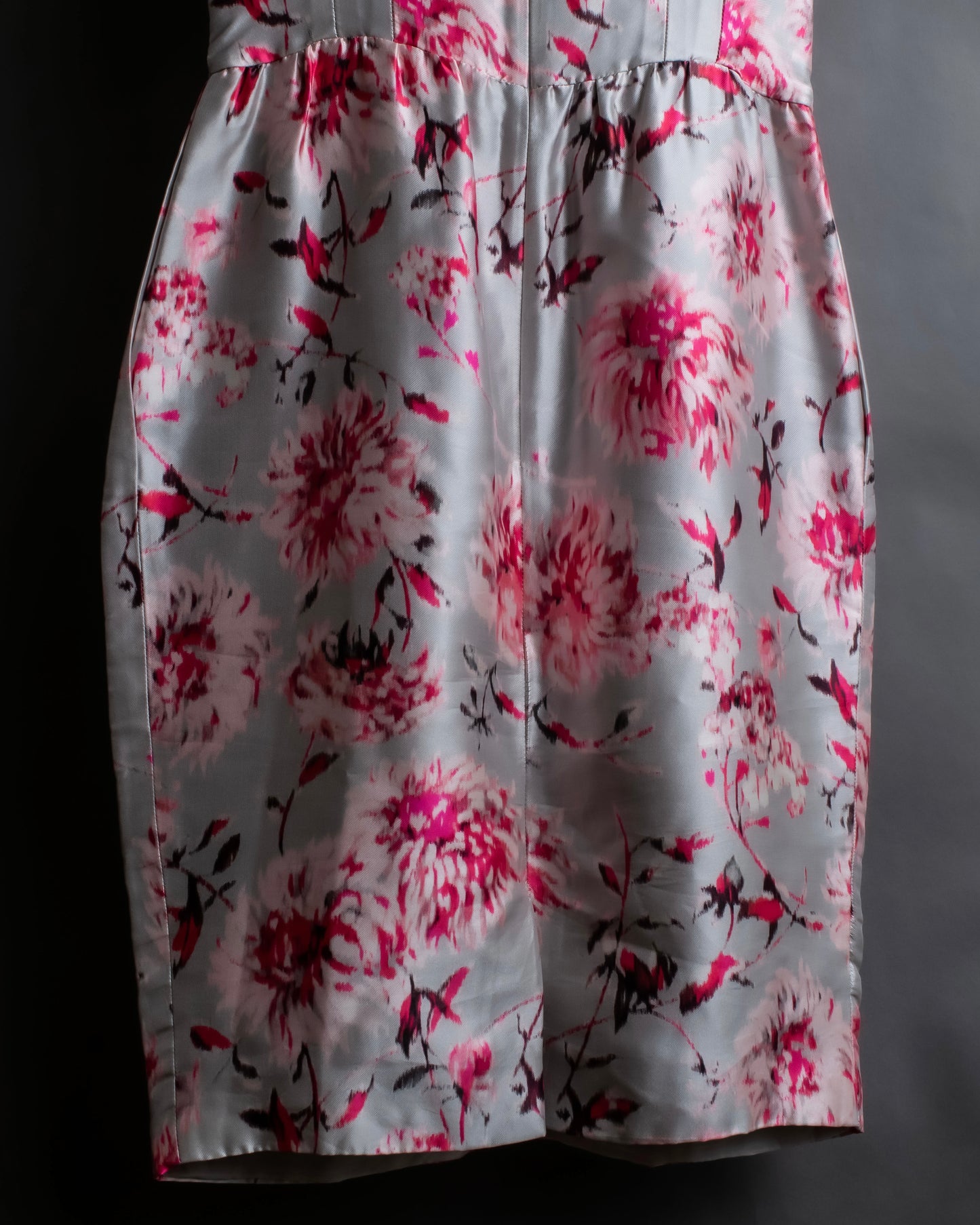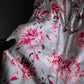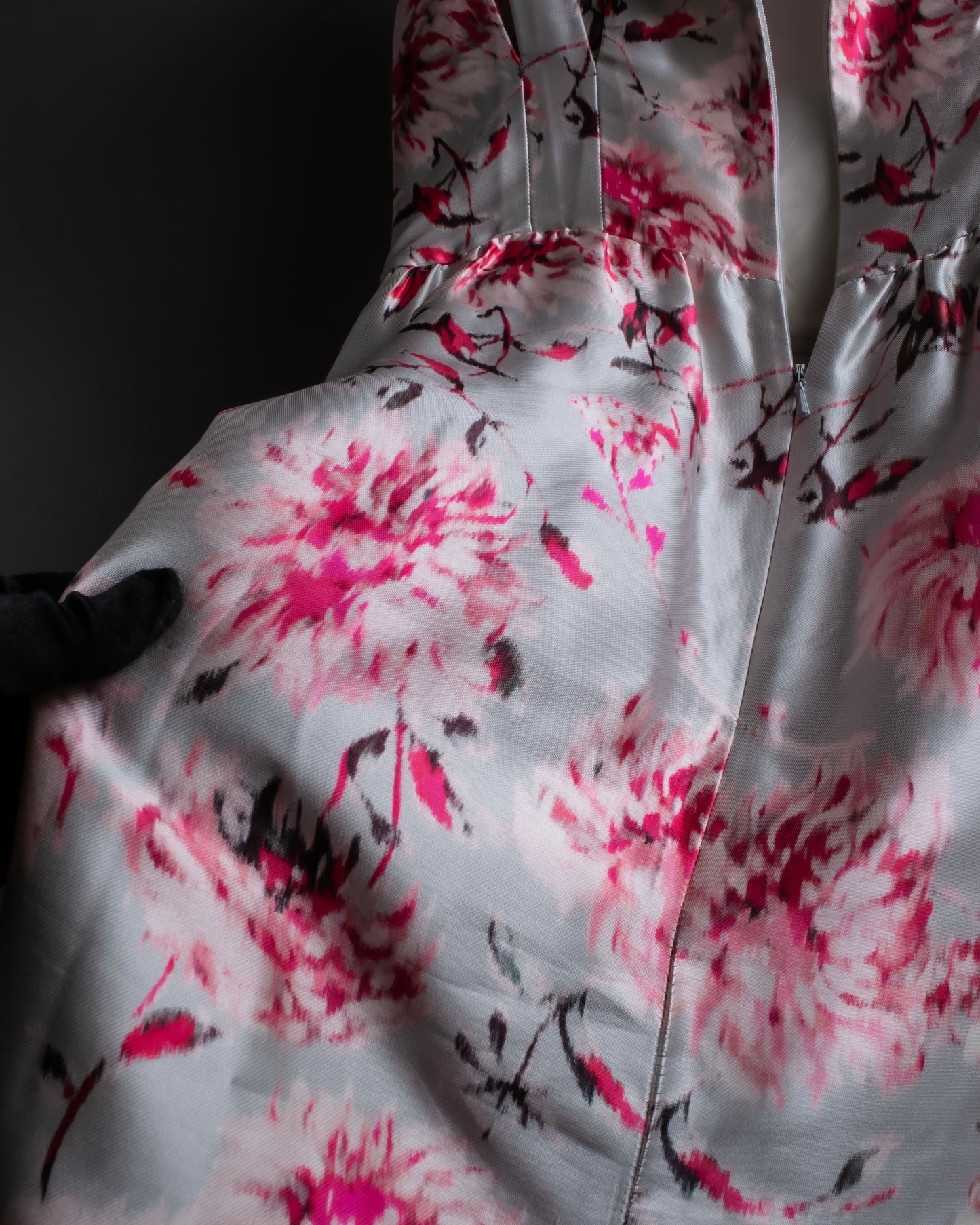 ベースとなる淡いグレーに、鮮やかなピンクのフラワープリントが施されており、まるで水彩画のように繊細でありながらも、花々の力強い筆致が華やかさを際立たせています。フラワーパターンはアーティスティックに散りばめられ、まるで自然の中で風に揺れる花々を切り取ったかのような躍動感を感じさせ、モードな感性を漂わせています。