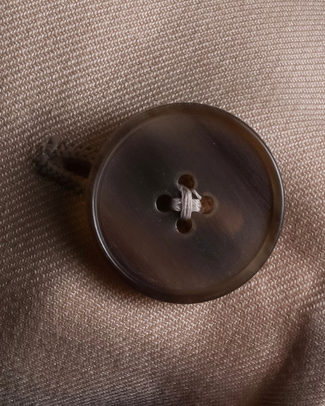 シルエットは直線的でクリーンなカッティングが特徴で、過剰な装飾を排したエフォートレスなエレガンスを体現しつつ、程よくボクシーなラインがジェンダーレスな魅力を放ちます。フロントには控えめなボタンが並び、比翼仕立てではないことでさりげないアクセントを加えながら、クラシックな佇まいを維持しつつ、アウターとしての存在感を際立たせております。