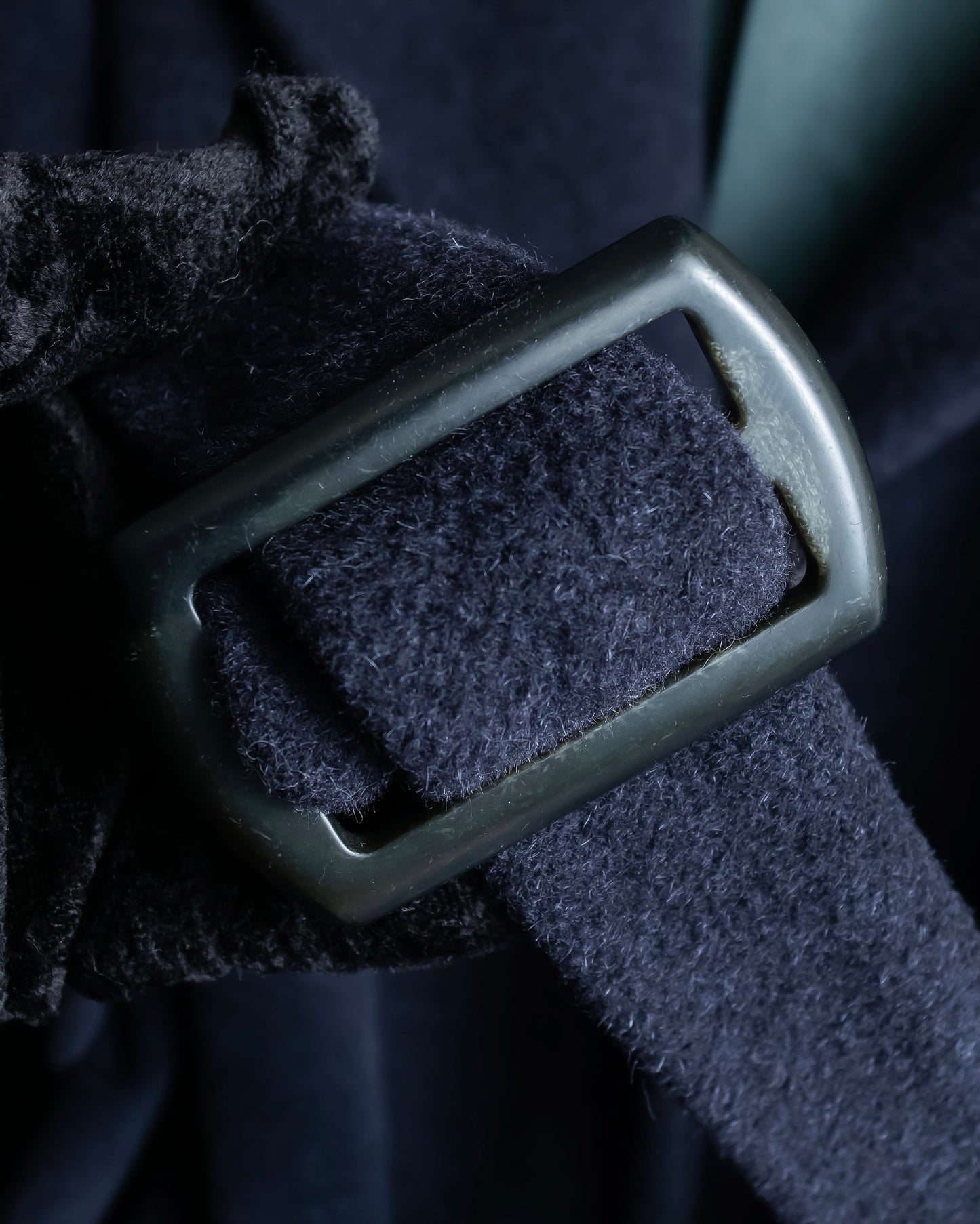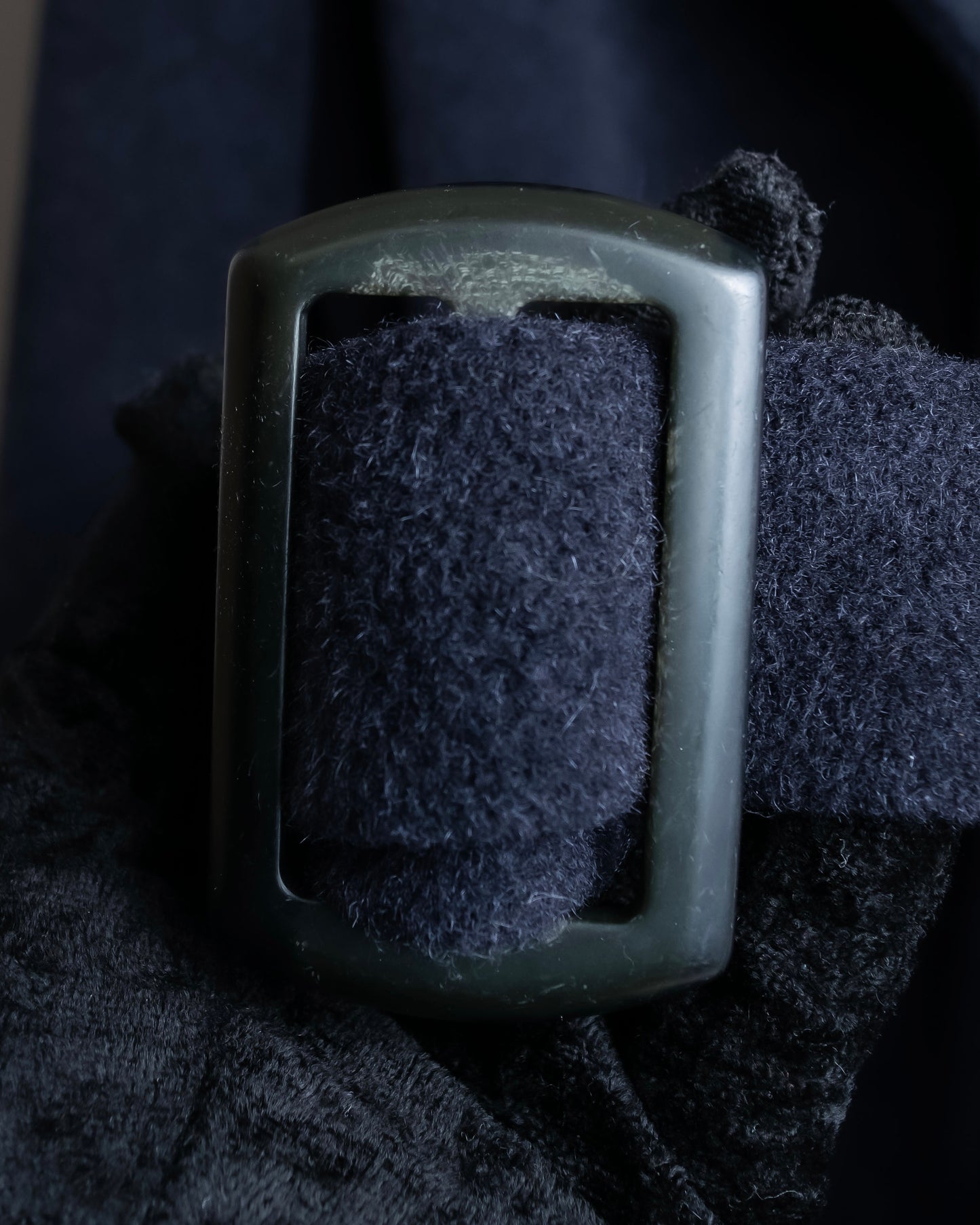 ウエスト部分にベルトが巻き付いているベルテッド仕様になっており、閉めることでウエスト部分にくびれが生まれ、気分によってシルエットを変更して頂けるギミックフルな一面を持ち合わせております。