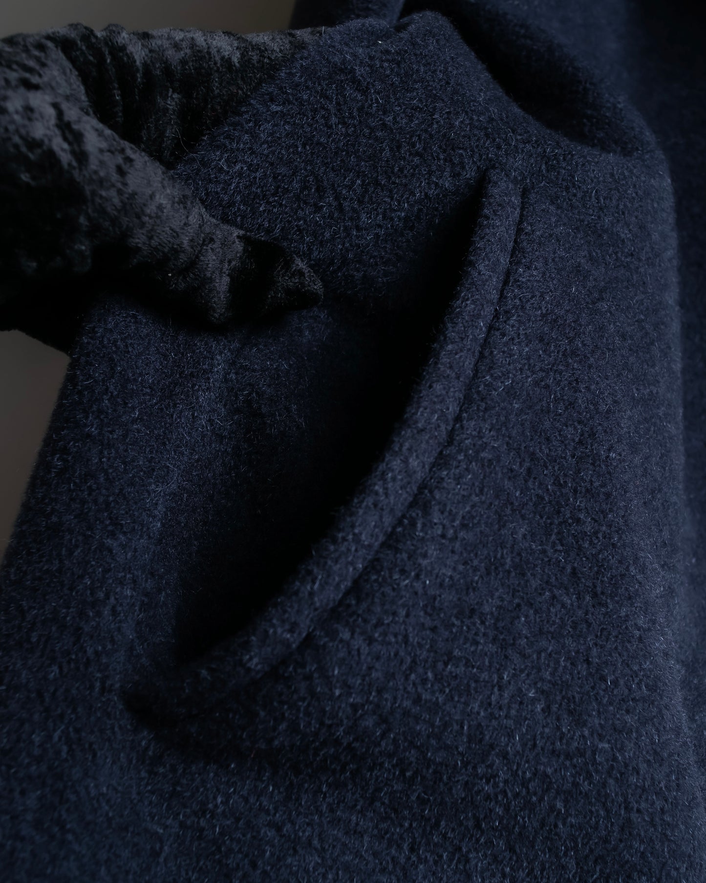ミドル丈のシルエットとなっており、ワイドラペルとの重厚感との対比が生み出され、全体のバランスが整えられた洗練されたシルエットを描いている為、どの様なスタイリングにもすんなり落とし込んで頂ける逸品と言えます。
