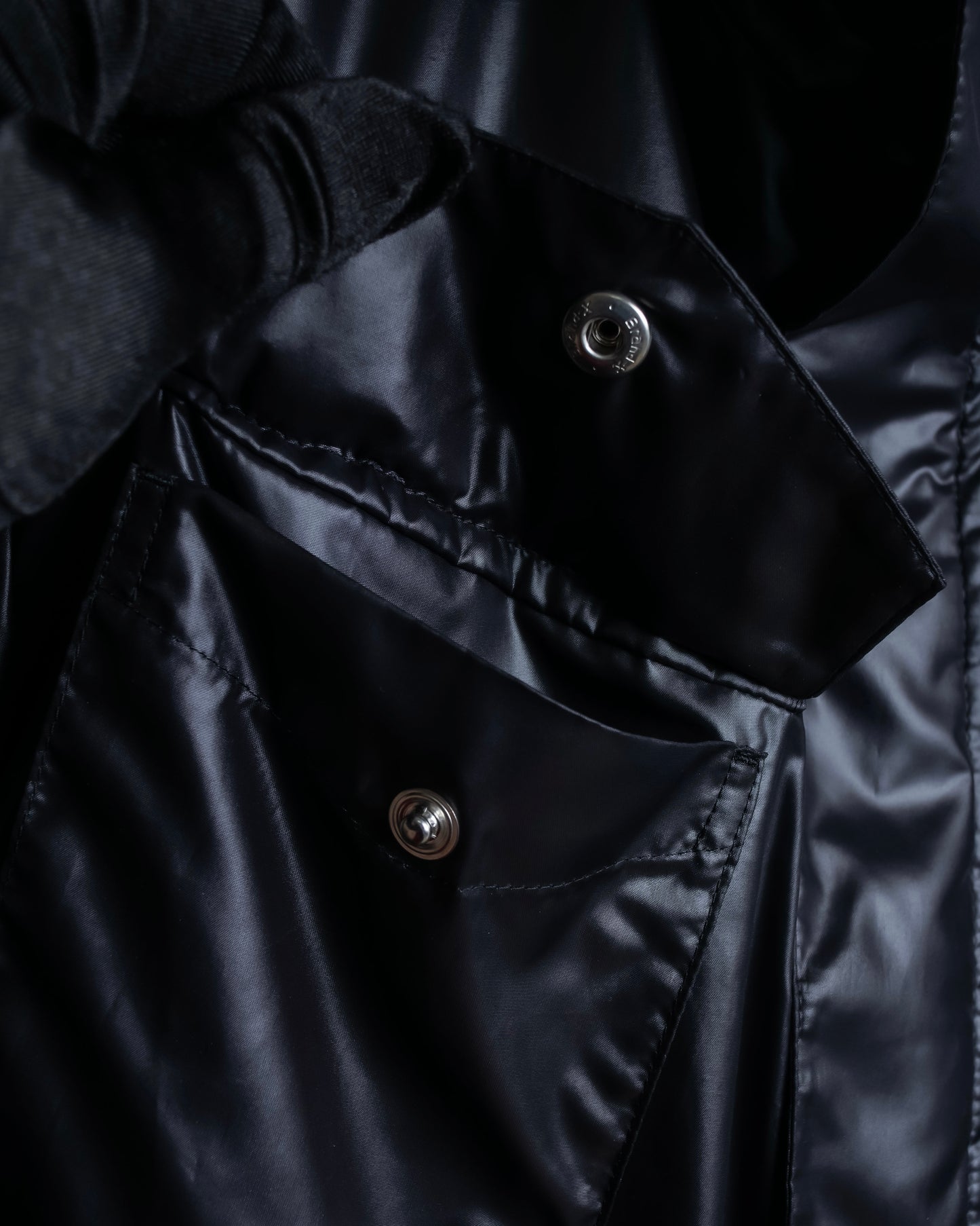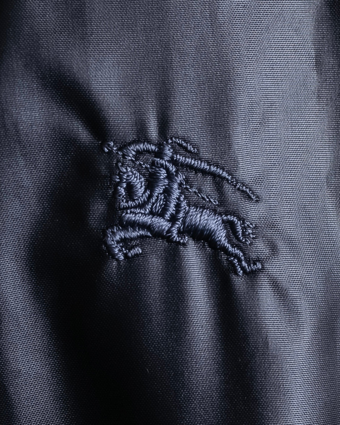 フード部分はしっかりとした立体感を持たせることで、雨風からの保護機能だけでなく、デザインとしての完成度も高めています。また、ジッパーやスナップボタンには「BURBERRYS」の刻印が施されており、ディテールにまでブランドのこだわりを感じさせるポイントとなっています。