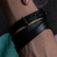 手首を優しく包み込むように設計された細幅のレザーストラップは、黒の発色が極めて美しく、手元に落ち着いた緊張感をもたらすだけでなく、巻いた瞬間に空気が凛と整うような佇まいを見せてくれます。また、トリプルラップという設計により、腕時計と重ねた際にもバランスよく存在感を保ち、単体では控えめでありながら、確かな存在性を主張できる点も魅力です。