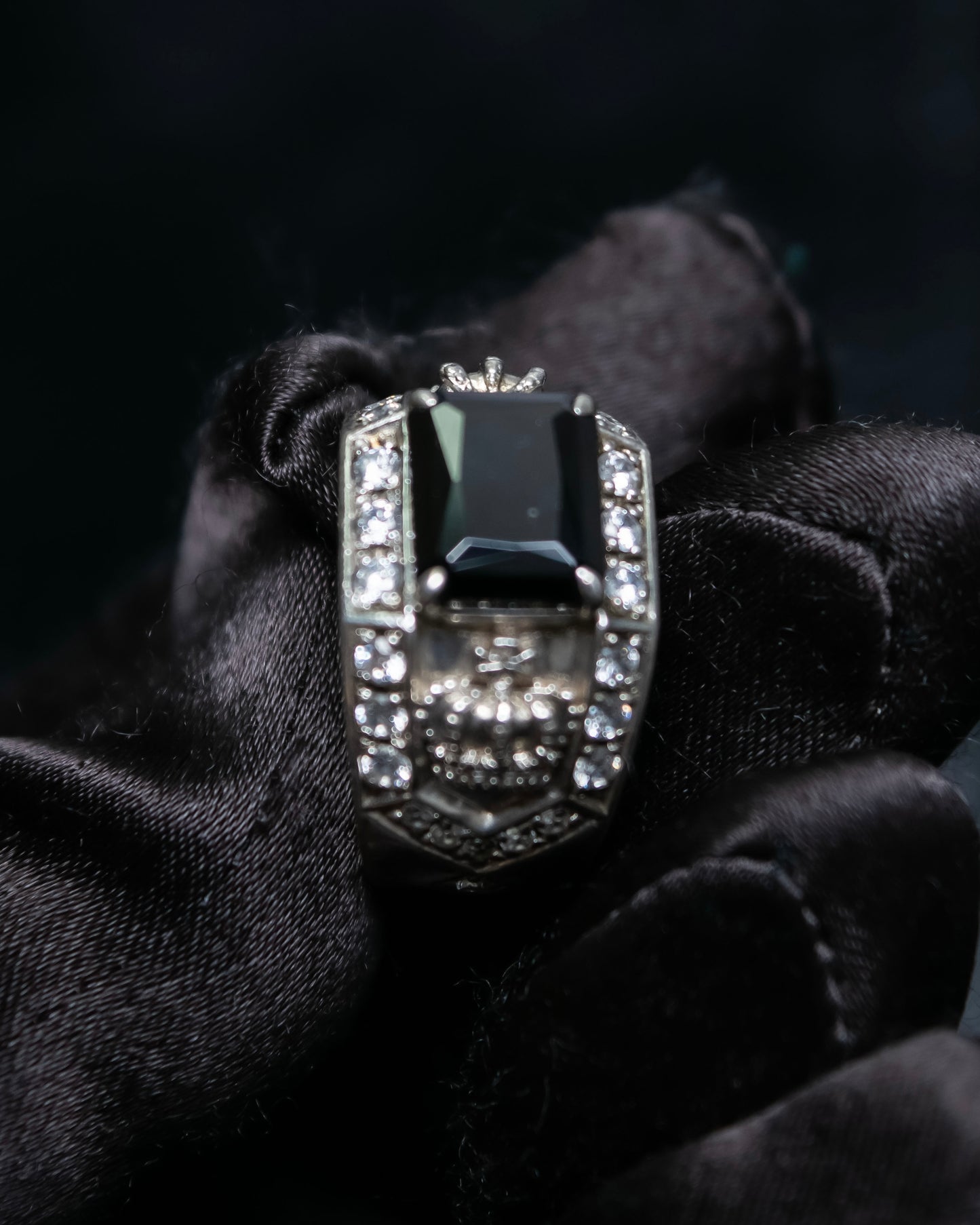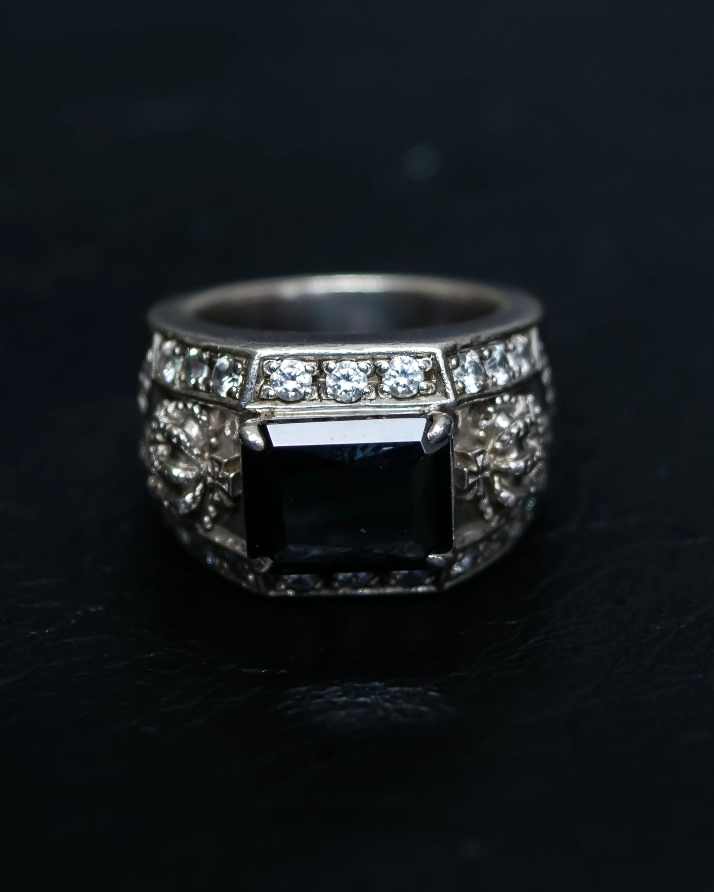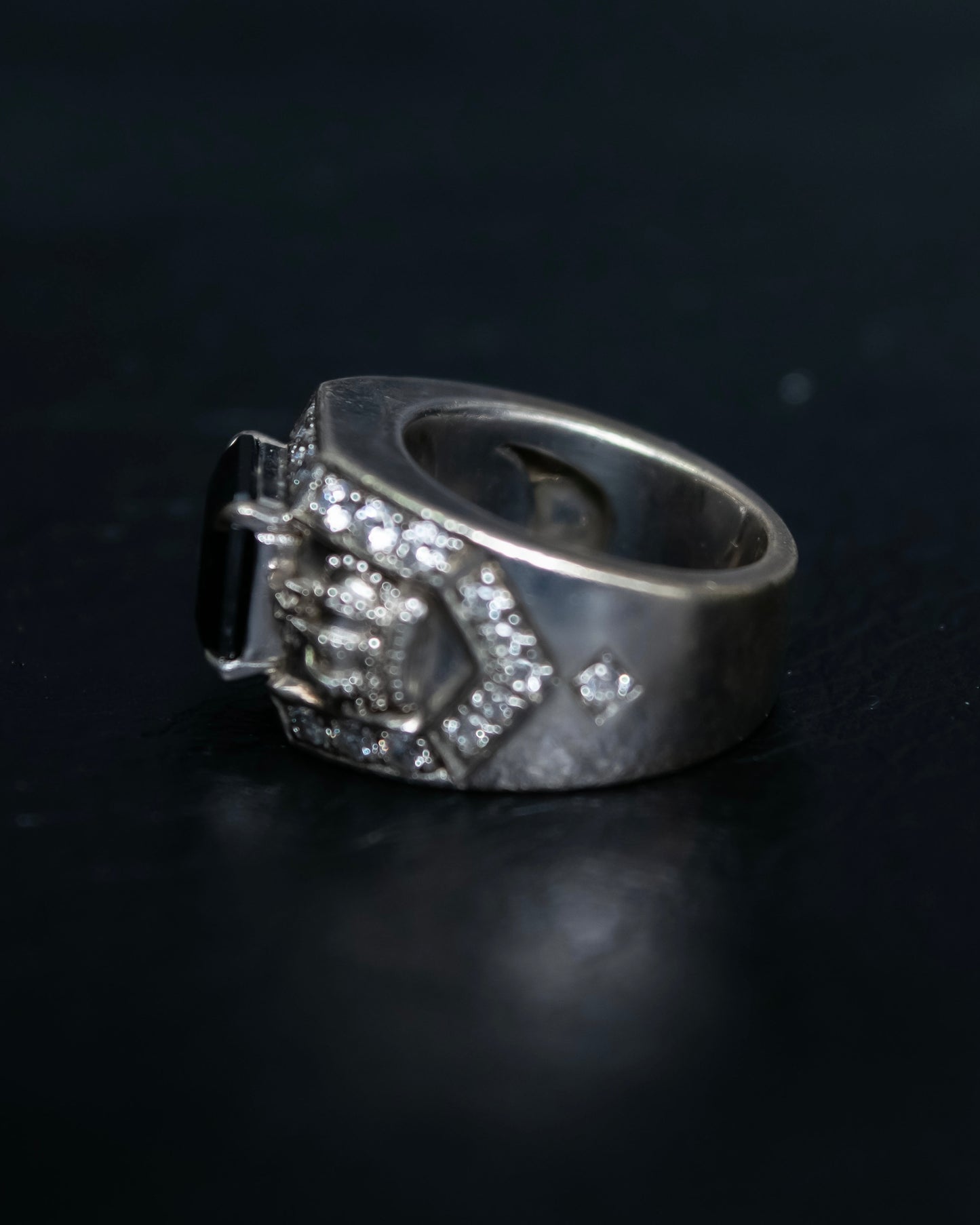 美しくスクエアにカットされたブラックジルコニアをデザインの核として、それらを取り囲む様にクリアージルコニアがあしらわれた逸品。
