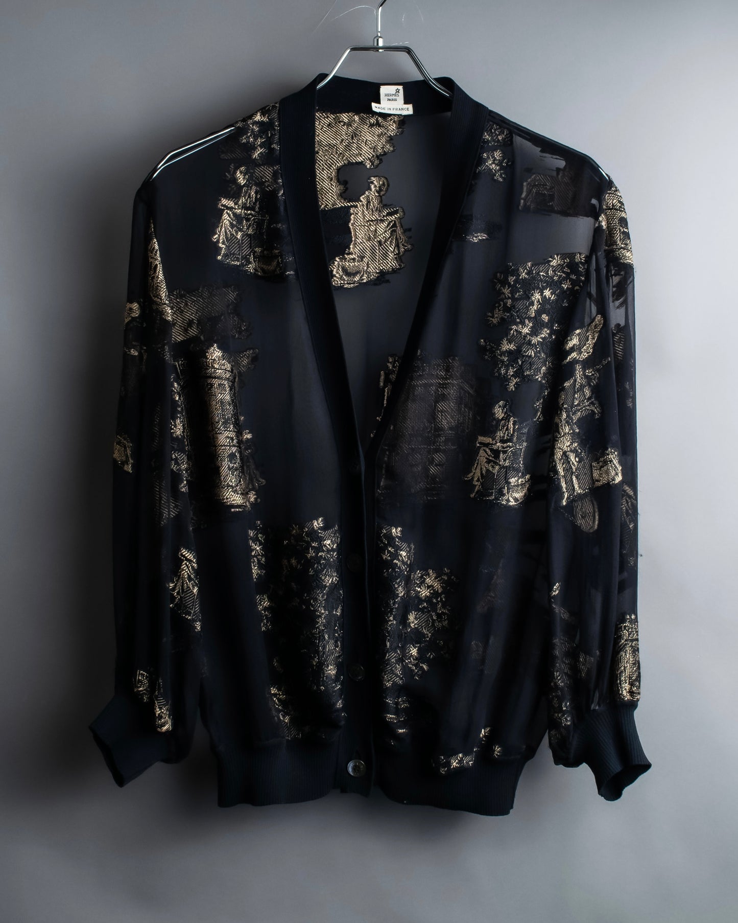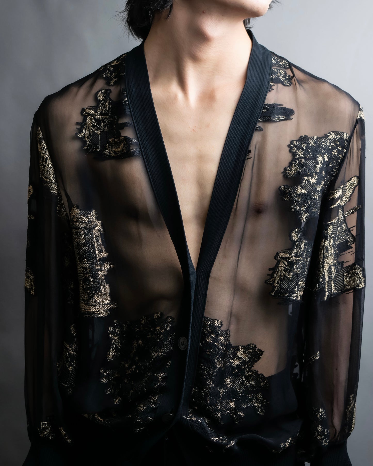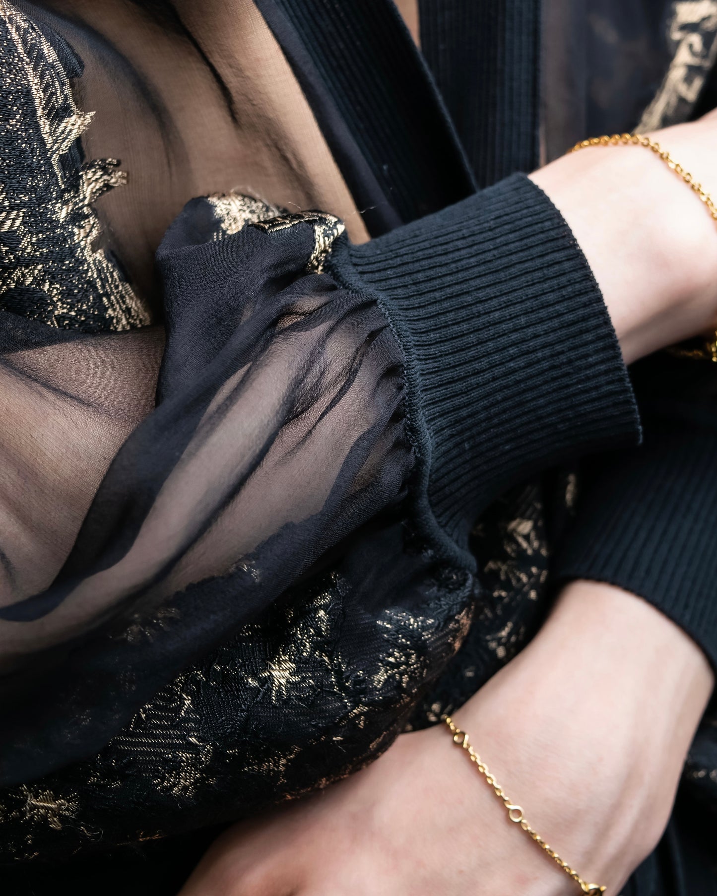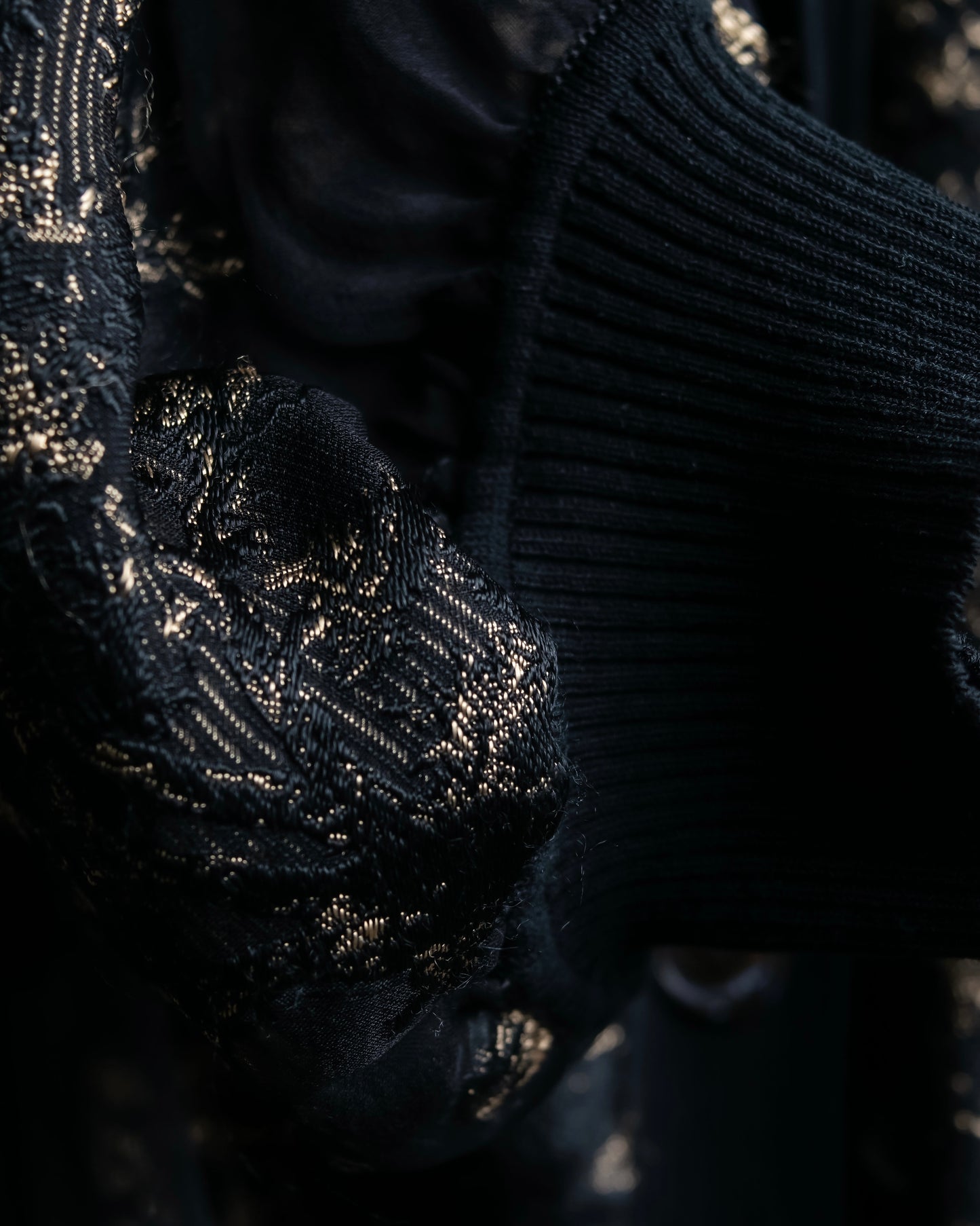 ブラックとゴールドという、高級感の色合わせとなっており、明度の対比が美しく、着用時に光が当たると光る刺繍の