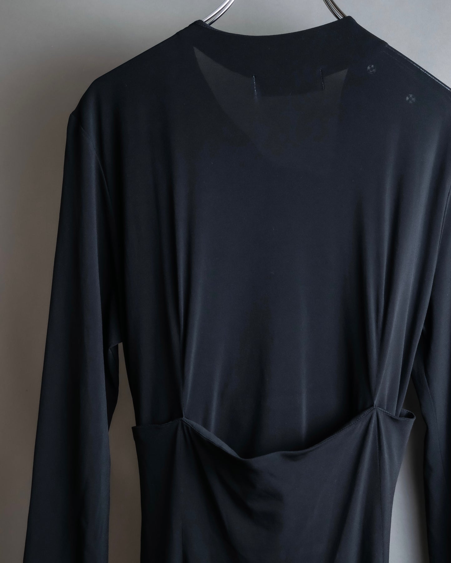 ベースのドレスの上に曲線を描いてレイヤードしたデザインを特徴としており、ウエスト部分のくびれを美しく魅せるように設計されている点や、裾にストライプのシアー生地を重ねデザイン性を高めた事でこちらのアイテム単体でスタイリングが成立する逸品となっております。