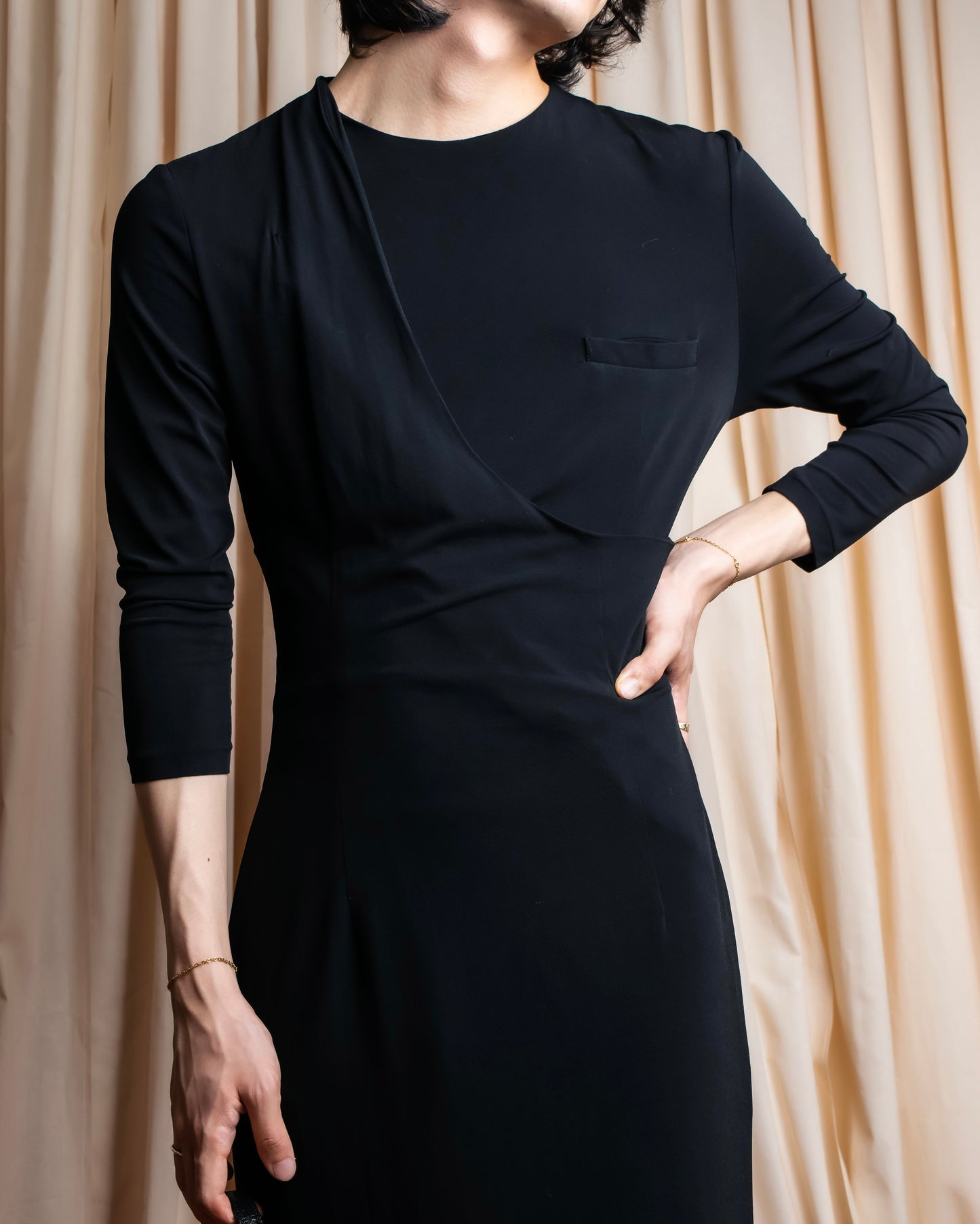 また、ポケットチーフを収納するディテールとしてスーツやフォーマルなアイテムに取り入れられている、胸ポケットのディテールを取り入れる事で本来フェミニンなカテゴリに位置するドレスをユニセックスのアイテムとして、昇華させている点も魅力的ですね。