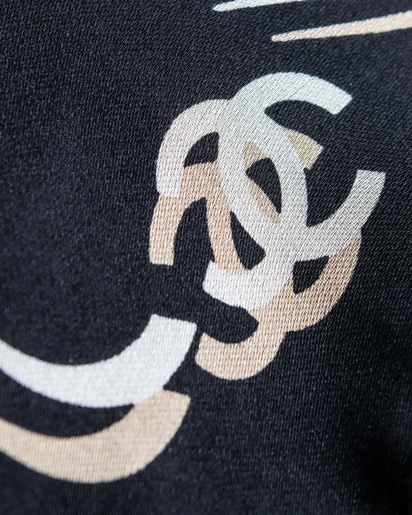 シックな印象を持つブラックの生地をベースに、フェミニンかつポップなタッチで、花やココマークをプリントしているアイコニックな柄使いが特徴のこちらの逸品。