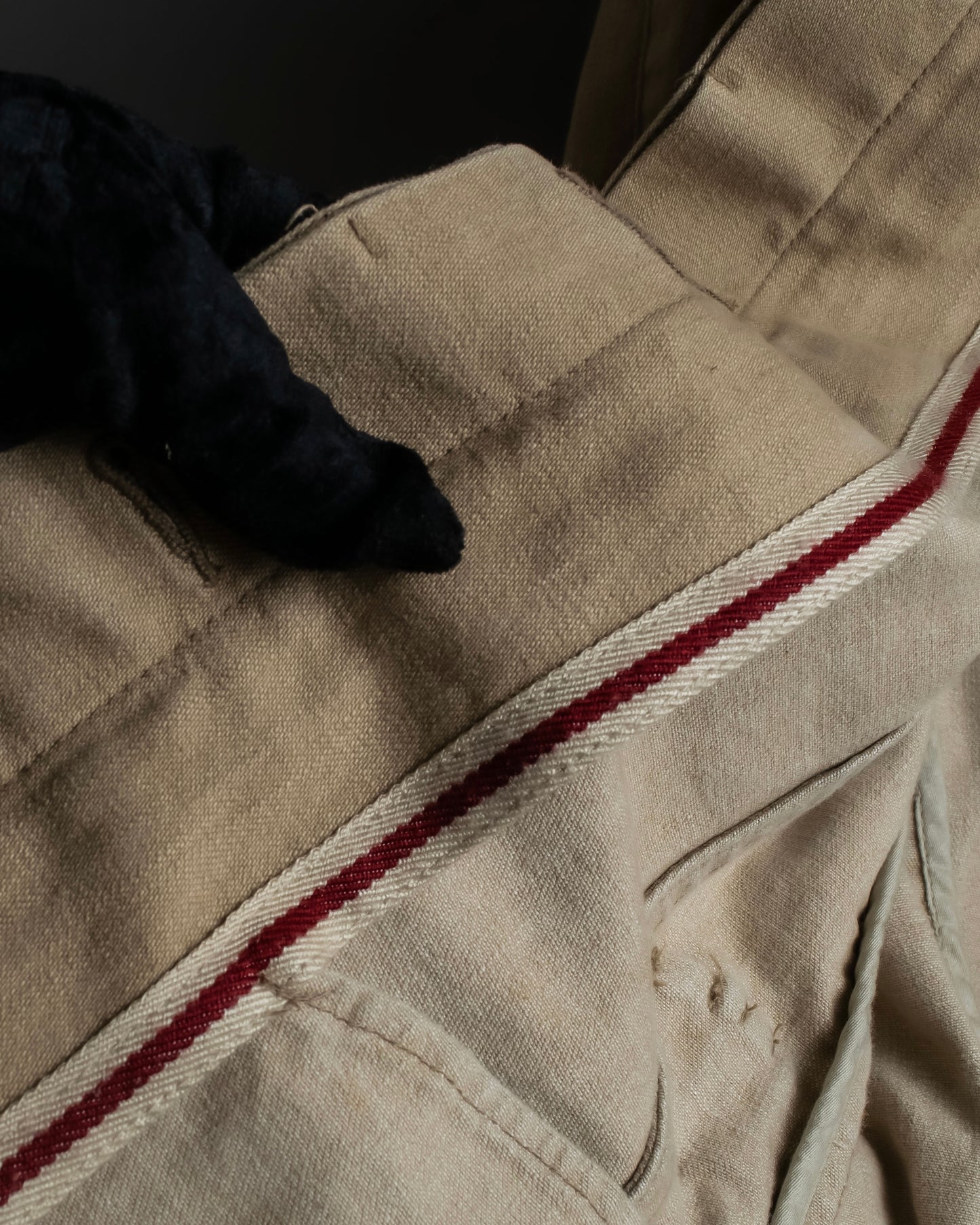 身頃にはほどよく厚みのあるデニム素材を採用し、カジュアルさを控えた滑らかな表面感と、BURBERRYらしい品格のあるベージュトーンが魅力で、裏面には赤耳のセルビッジ仕様があしらわれている為、ワーク由来の素材ながらも、素材そのものにクラシックな奥行きを感じていただけます。