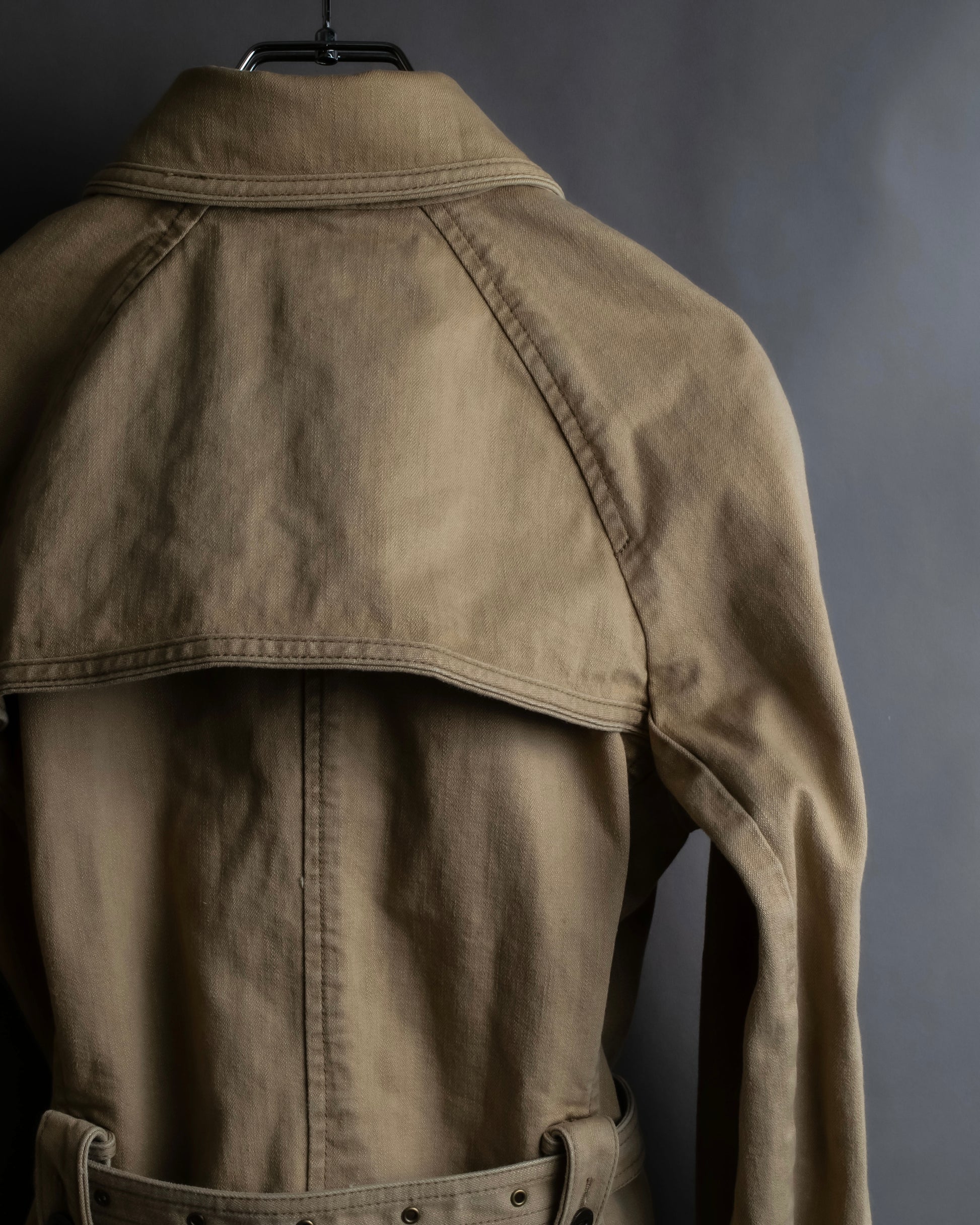 また、背面にはトレンチらしいアンブレラヨークが重ねられているため、後ろ姿にも抜かりなく構築的な印象を添えてくれます。裏地を排したライトウェイトな作りのため、シャツ感覚で羽織れる軽やかさもあり、気温差のある季節にも重宝していただけます。