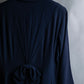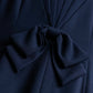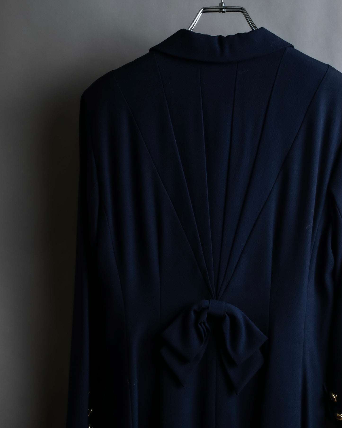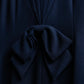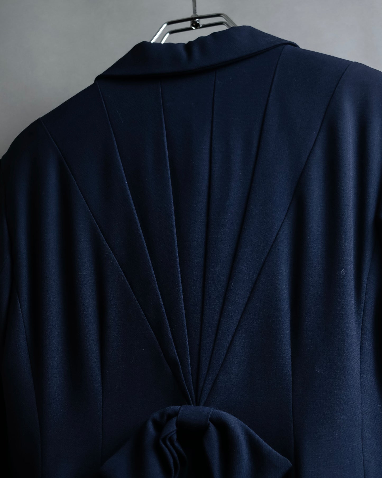 後ろ身頃には放射状にタックを取った構築的なシルエットが広がり、その中心に結ばれた共布のリボンが、フェミニンさと立体感をさりげなくプラスしており、後ろ姿にまで品格が宿っております。