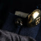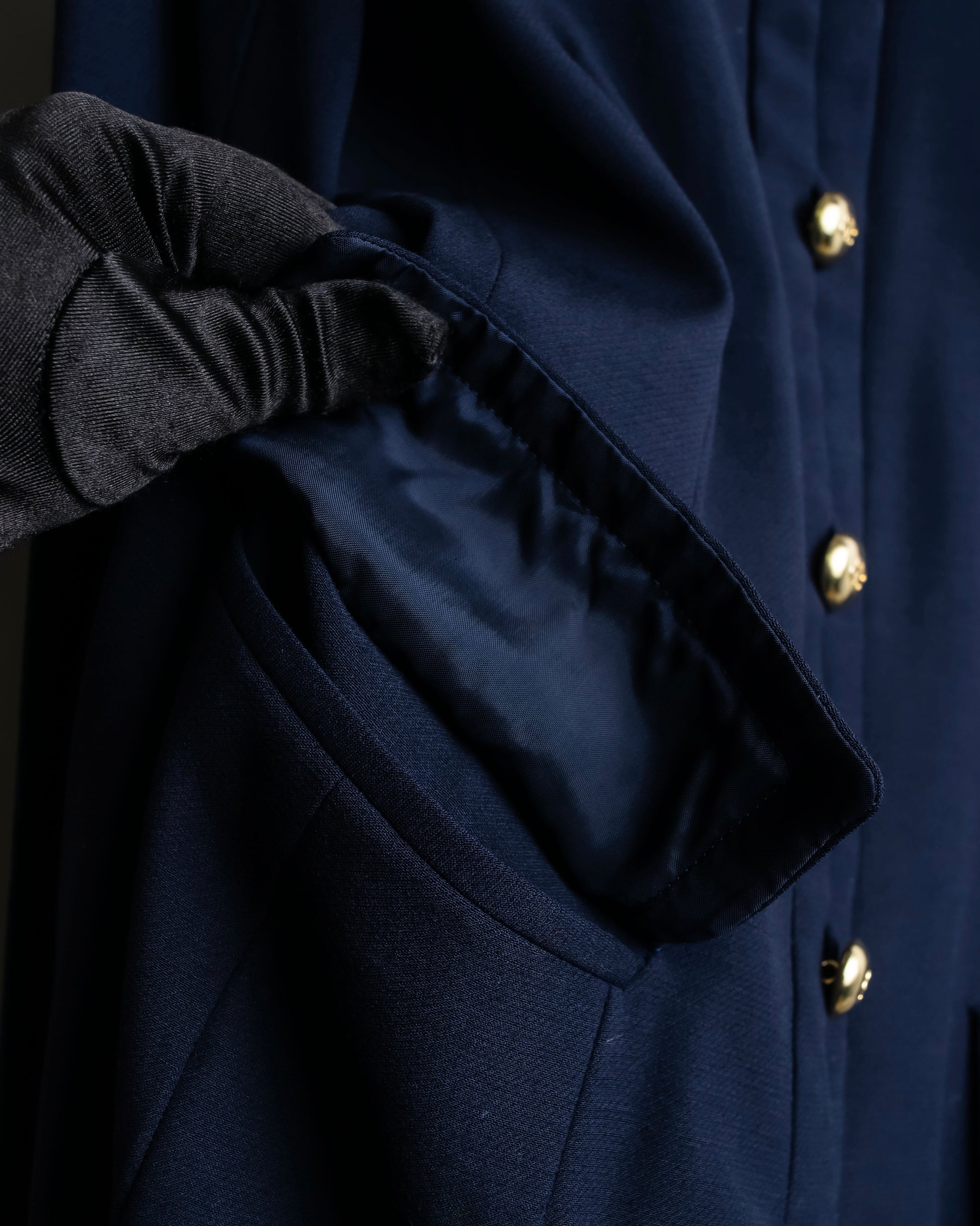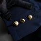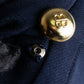 フロントに並ぶゴールドのロゴボタンが印象的で、それぞれにあしらわれた艶やかなメタルの輝きが、凛としたクラシカルさの中に華やぎを添えてくれます。また、袖口にも同じボタンが施されていることで、ディテールに統一感がありながら、動いた際にちらりと覗く美しさも計算されたデザインです。