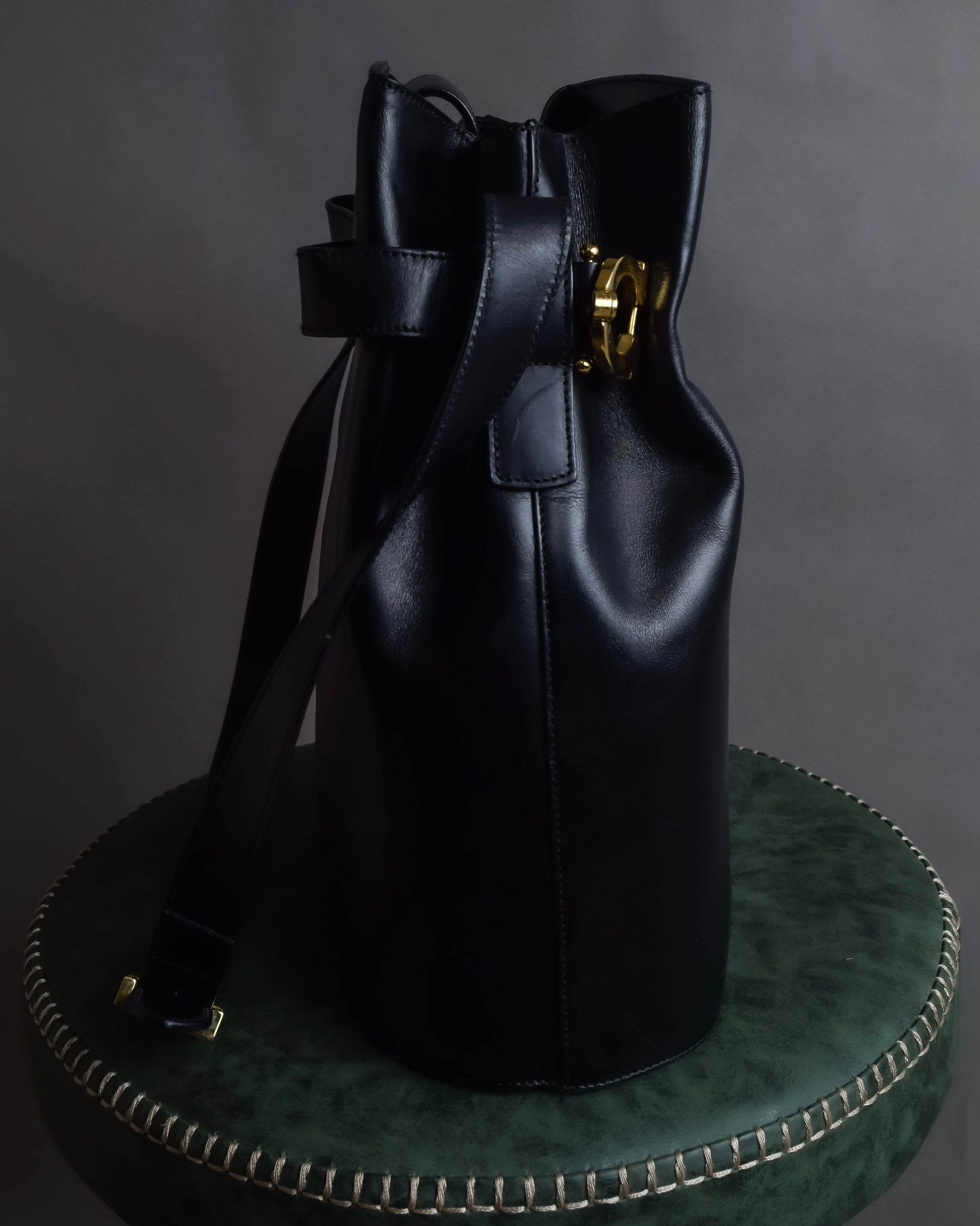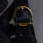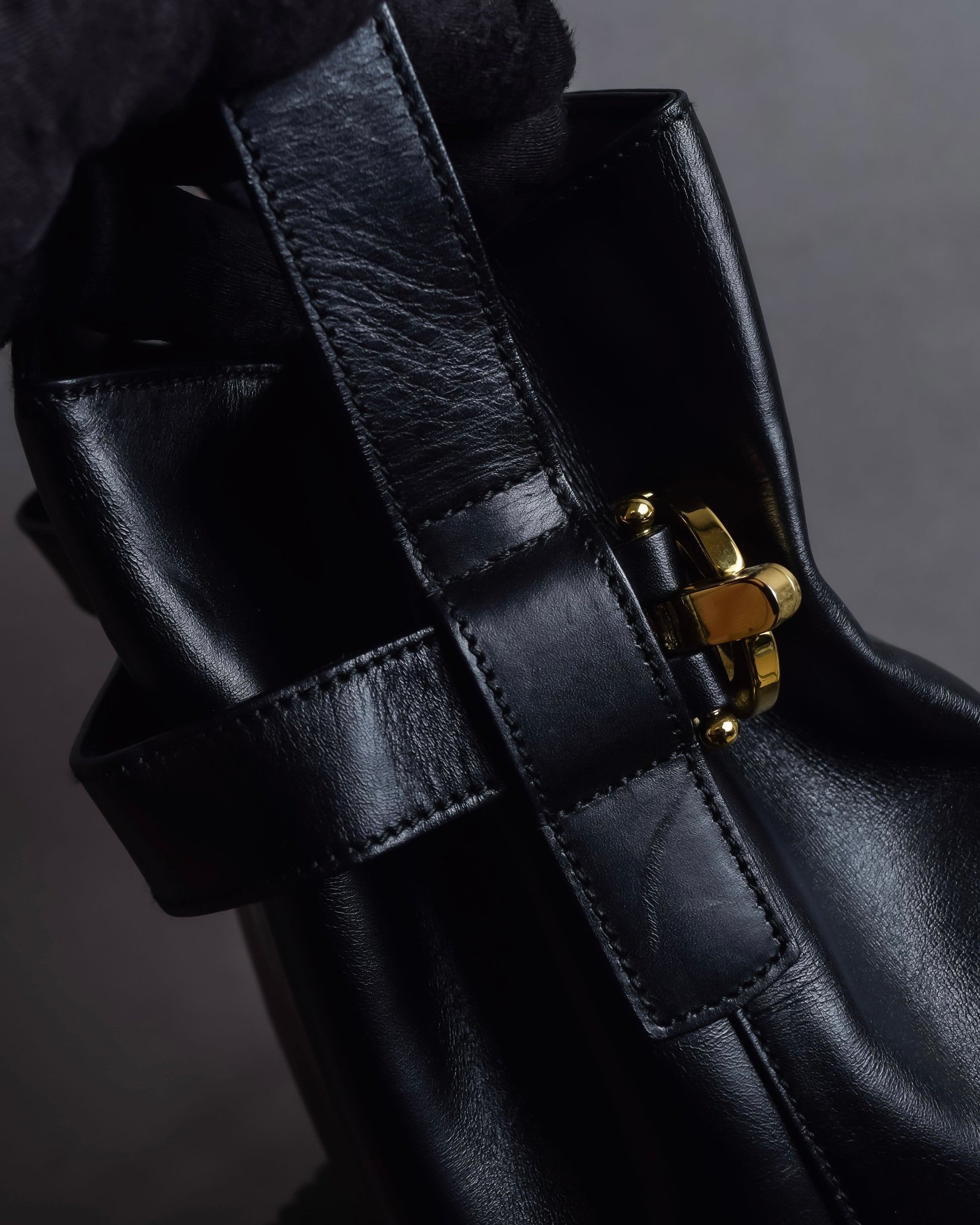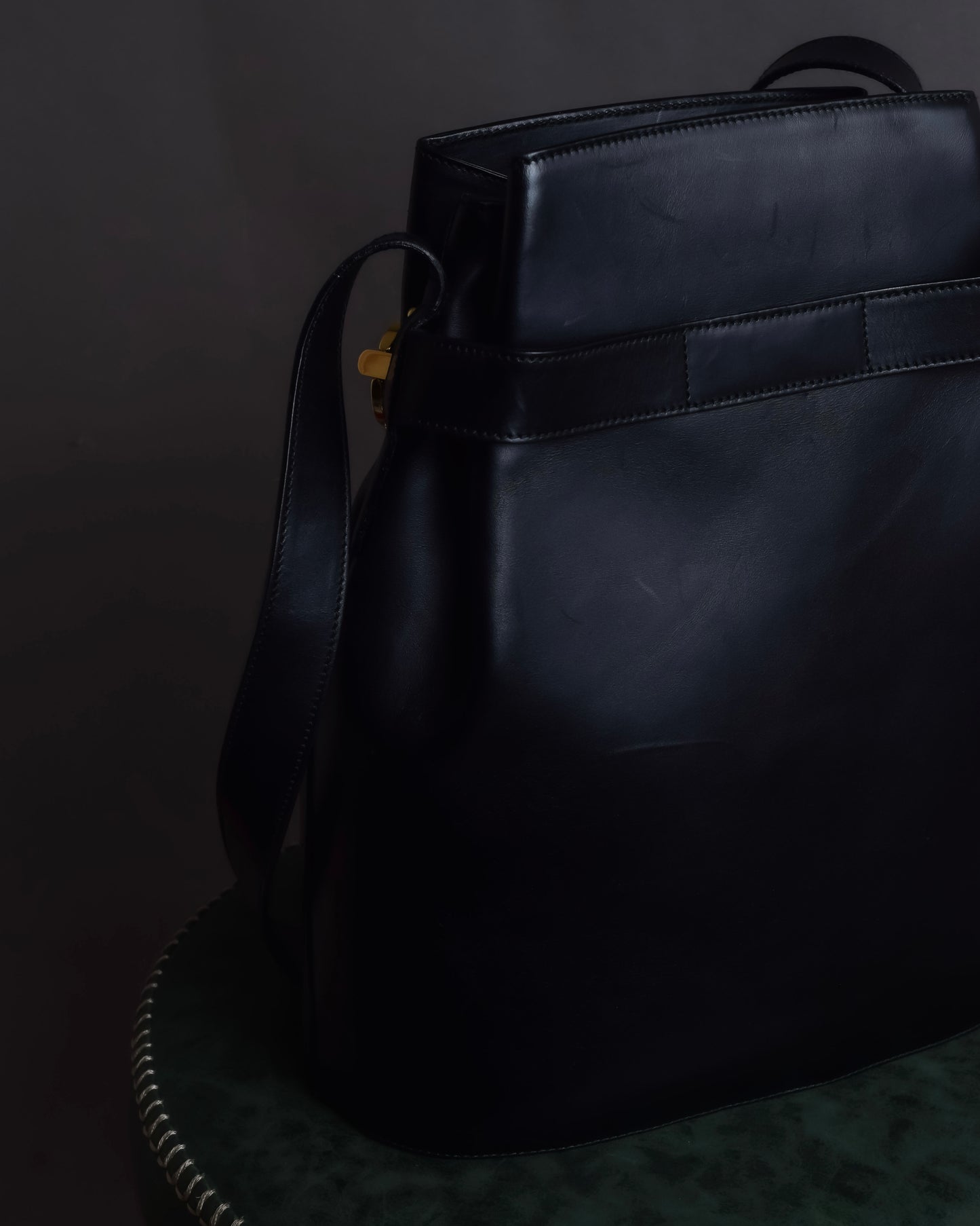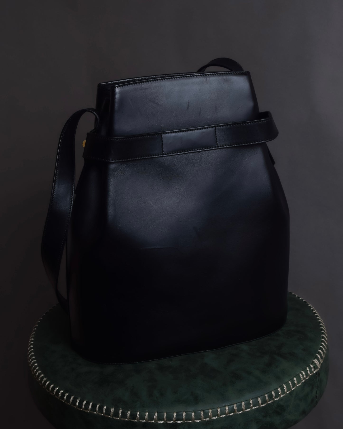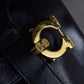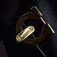 ガンチーニモチーフを配した滑らかなカーフレザーの質感が、静かに洗練された存在感を放つこちらの逸品。SALVATORE FERRAGAMOによるアイコニックなゴールドバックルは、構築的な台形フォルムに張り詰めた緊張感を与えつつ、モダンな造形の中に一筋のクラシカルな余韻を刻んでいます。