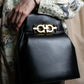 レザーの光沢は控えめでありながら奥行きを感じさせるもので、特に直線と曲線が交錯するフラップ部分の仕立てには、FERRAGAMOらしい緻密な技術と端正な美意識が凝縮されており、ミニマルであるがゆえに際立つ精度の高さが魅力です。また、ストラップの取り付け位置にも意匠が宿っており、サイドから垂れる金具がさりげなくもジュエリーのような輝きを添えてくれますね。