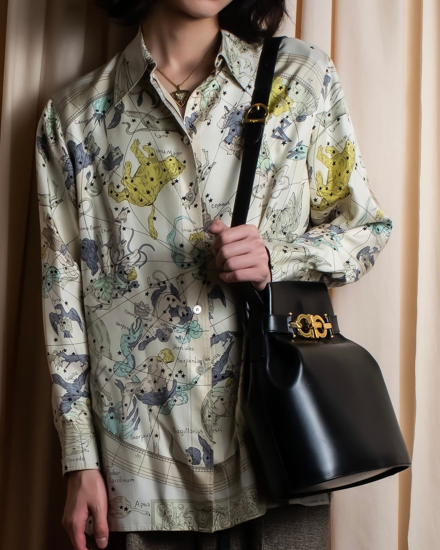 日常の中に軽やかに取り入れたい方にこそ、あえての凛としたレザーショルダーを選ぶという選択肢は非常に有効で、リネンやウールといった天然繊維のワードローブに一点、金属的な硬質さとレザーの静けさを差し込むことで、より芯のあるエレガンスが演出されます。ニットやフレアパンツなど流れのあるテクスチャと合わせていただくと、空気を含んだような柔らかさの中にFERRAGAMOらしい構築的な緊張感が宿り、性別を越えたモダンな佇まいに仕上がります。
