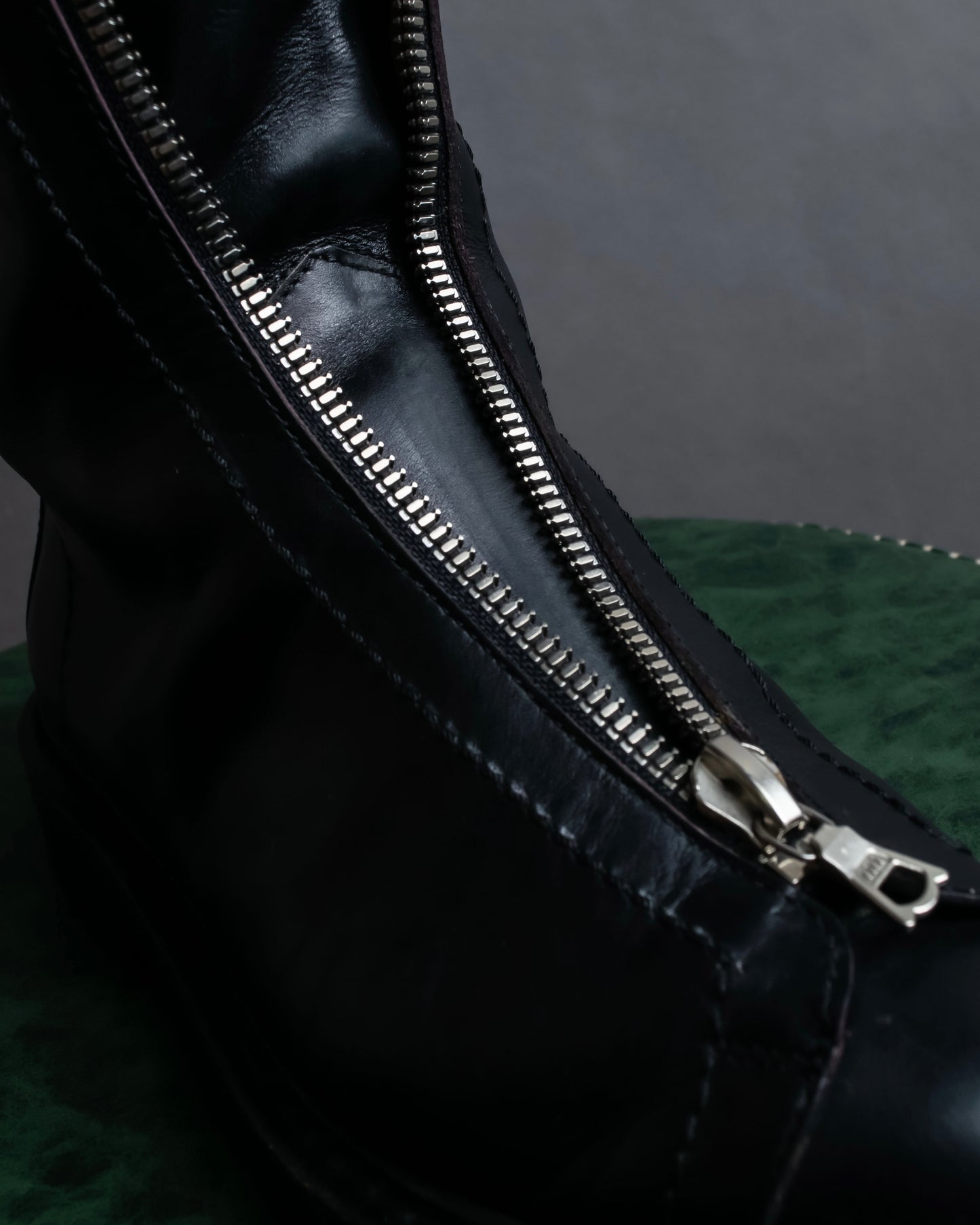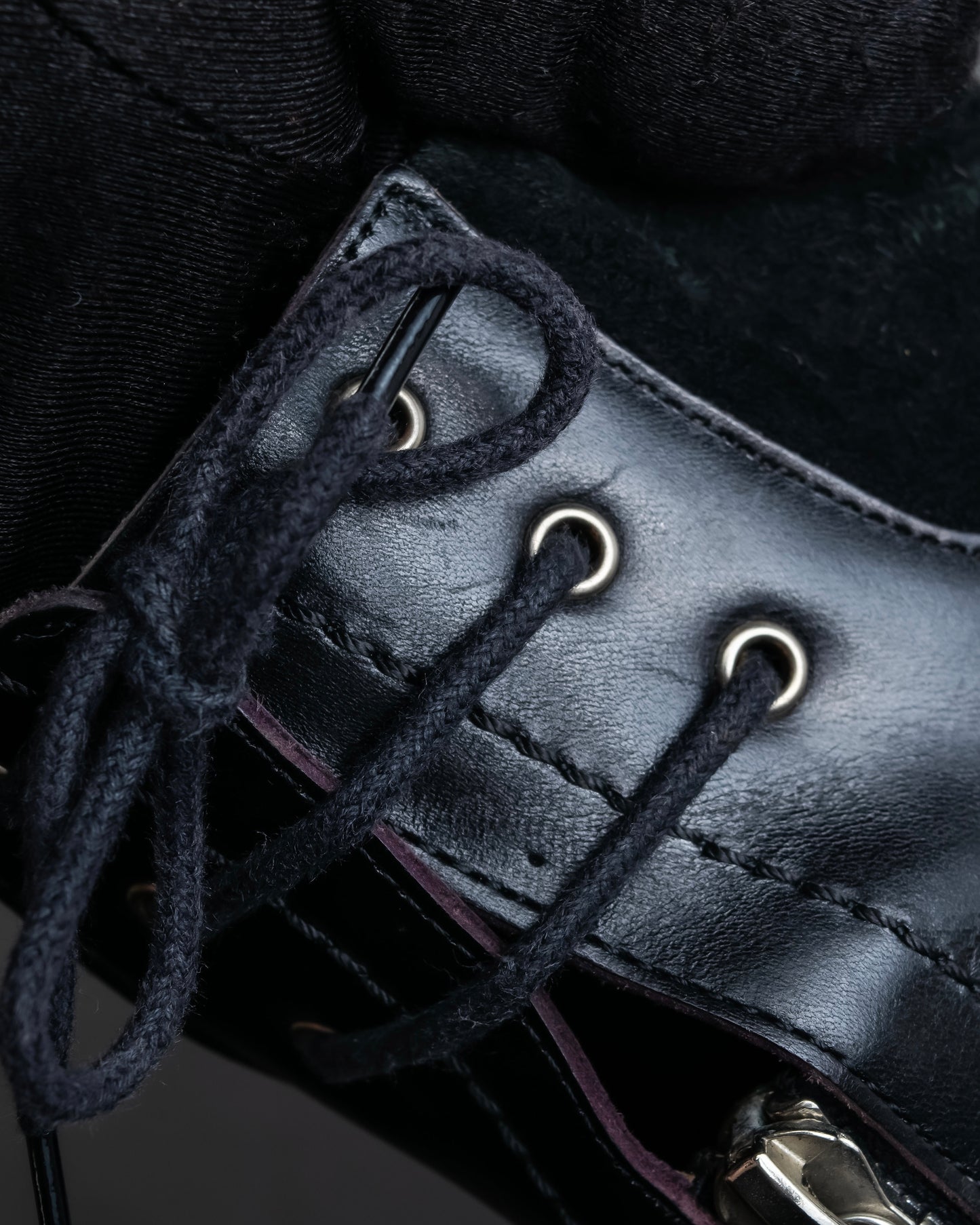 フロントに施された目立つジッパーは、ただのデザイン要素ではなく、実用性を追求したもので、簡単に脱ぎ履きできる利便性を提供しつつ、視覚的にも洗練された印象を与えています。また、レースアップのデザインは、クラシックさを演出し、足首をしっかりとサポートしながら、個々のフィット感を調整できるのが魅力的なポイントですね。