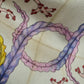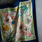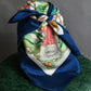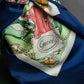 ベースとなるシルク素材は滑らかでしっとりとした肌触りを備えており、首元に一巻きするだけで装い全体に上品な光沢が加わるため、さりげなくラグジュアリーな印象を演出してくれるのも魅力のひとつです。また、深いネイビーで縁取られた構成により、パステルトーンの絵柄が引き締まり、甘すぎず、大人のバランス感覚を保ったデザインに仕上がっています。