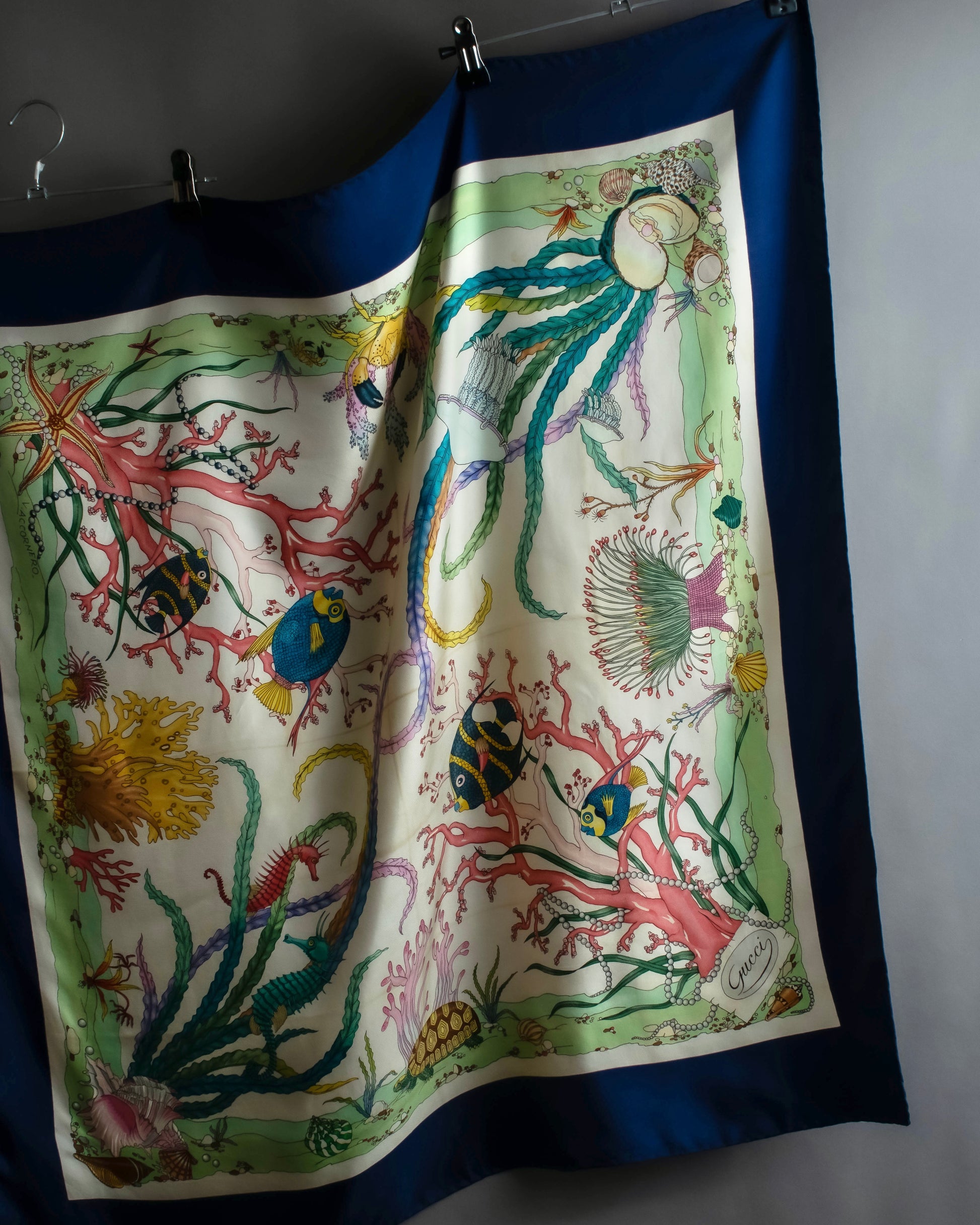 GUCCIらしい繊細かつ遊び心あるタッチで表現された、海中植物や珊瑚、魚たちが優雅に広がる風景は、単なる装飾に留まらず、どこか詩的な奥行きを感じさせてくれますね。