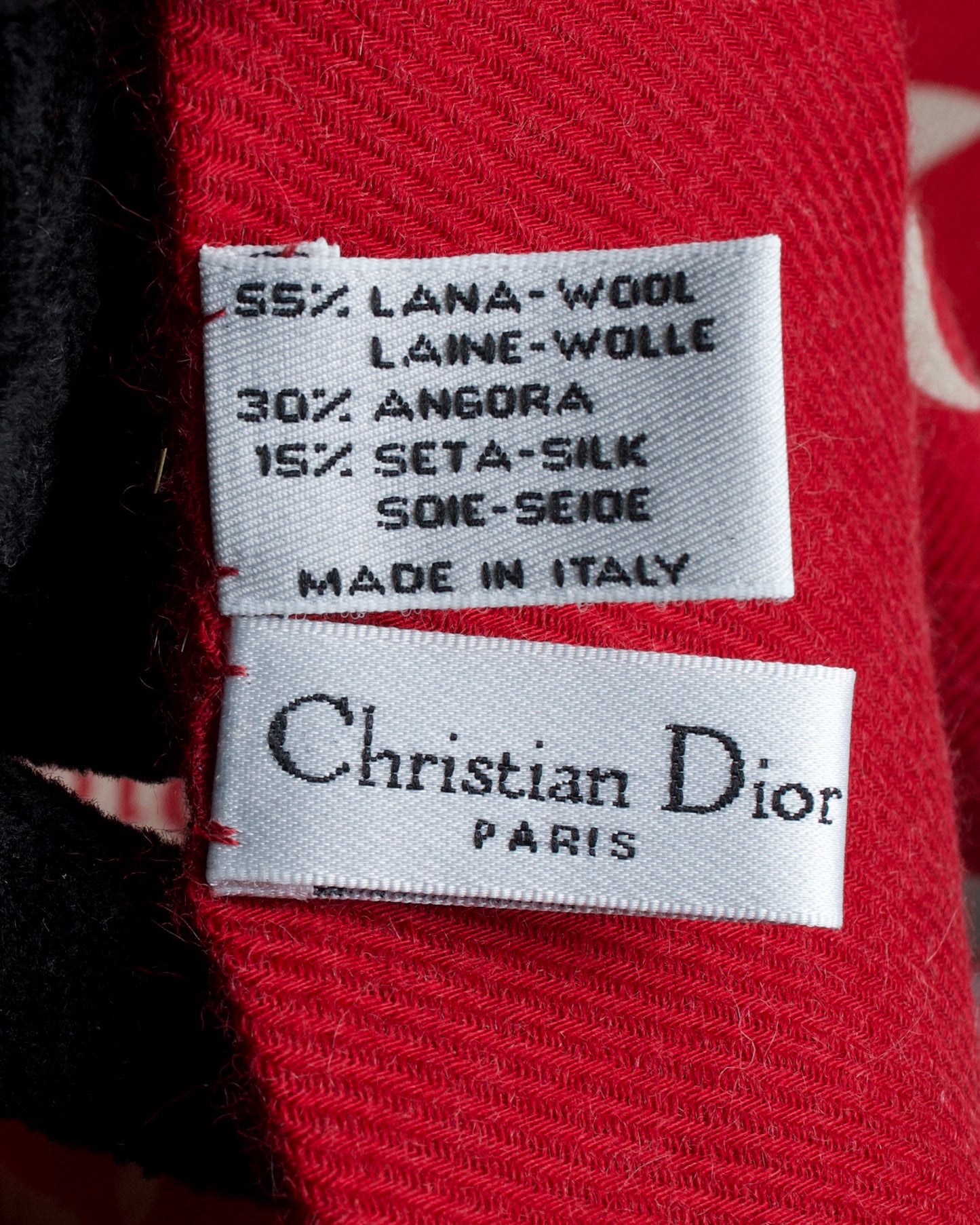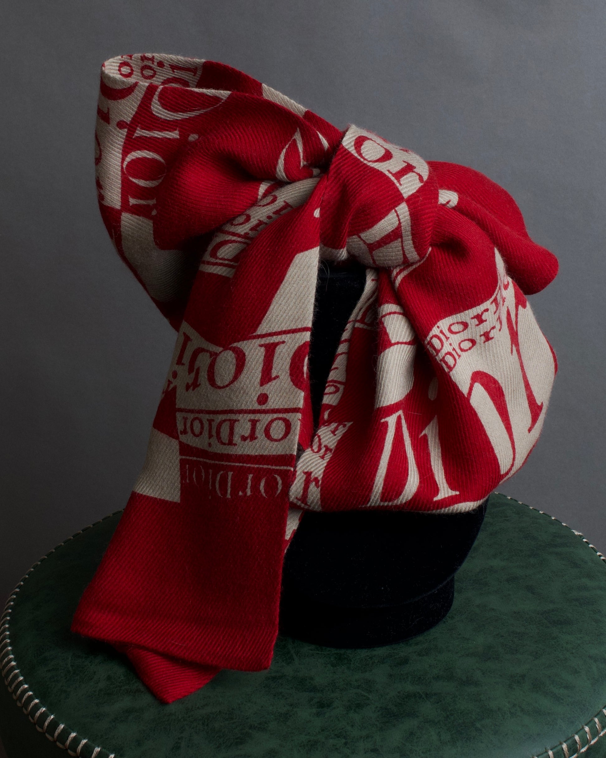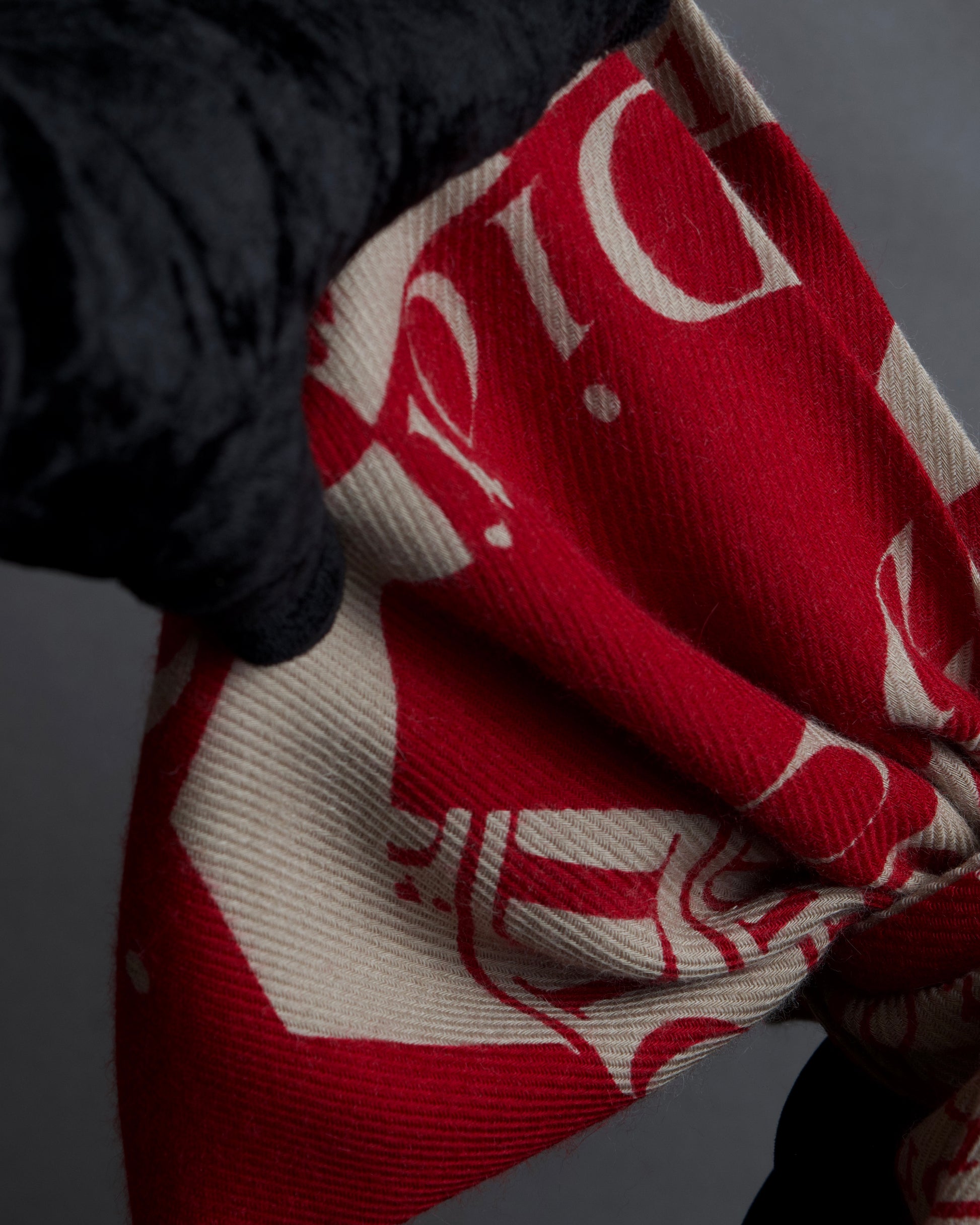 深紅のエネルギーとアイボリーの静けさが交差するように織り上げられ、ディオールらしい華やかさと知的な遊び心を内包しているこちらの逸品。全面に配された大胆なロゴパターンは、あえて整列させず、ずらしながら構成されている為、クラシカルなブランドアーカイブへのオマージュでありながら、どこか現代的な軽快さも感じさせますね。