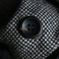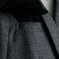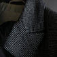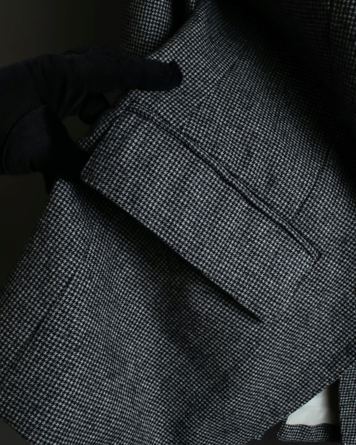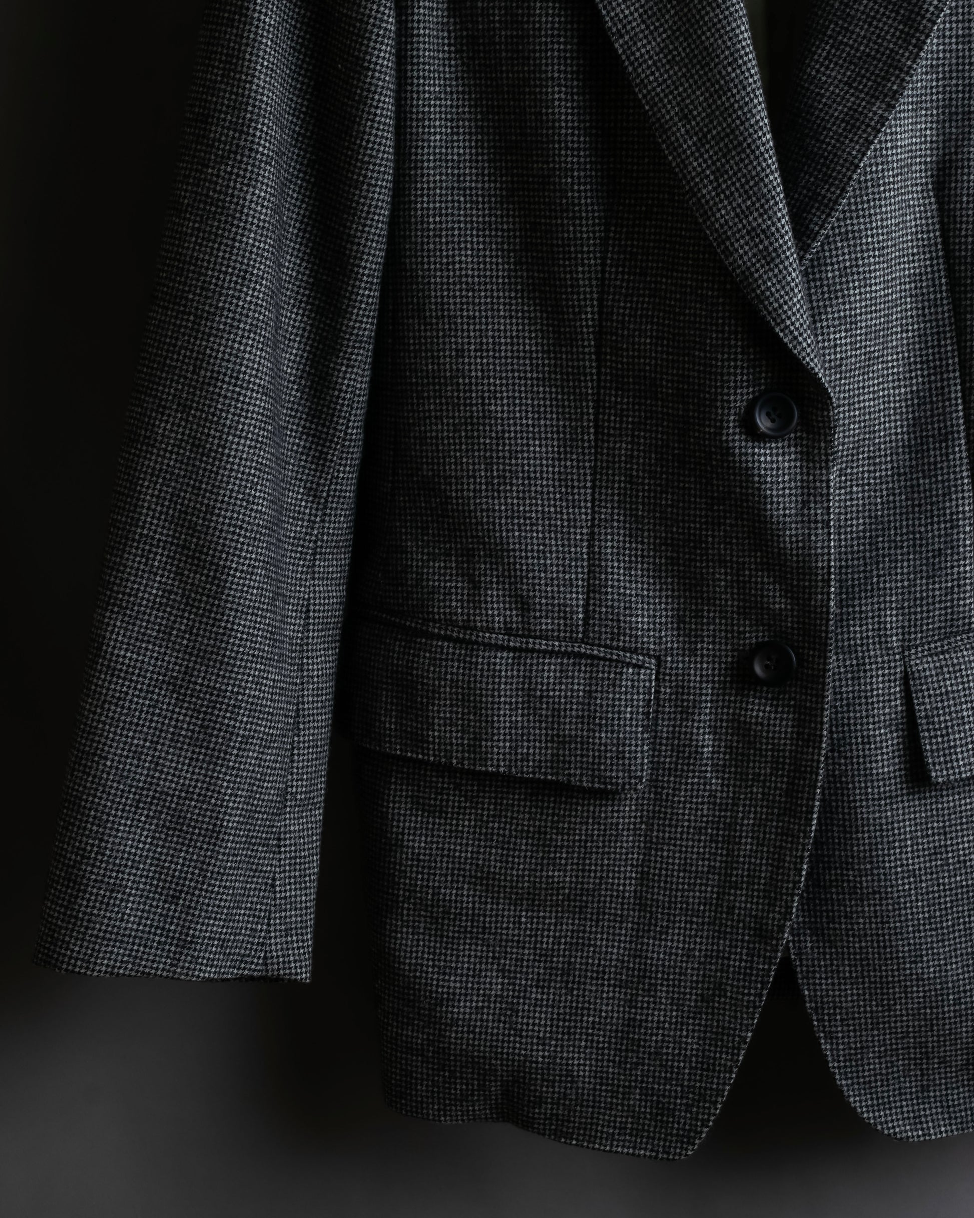 しっかりと芯の通ったテーラードシルエットは、ウエストにかけて程よく絞りが効いており、クラシカルなバランスを保ちながらも、肩から裾に向かって流れるような直線が凛とした空気感をまとわせています。また、フロントの2つボタンやフラップポケットといった伝統的な意匠が、装飾を抑えたミニマルな表情の中で程よいアクセントとなっており、ハウンドトゥース特有の視覚的リズムと相まって、知的な立ち姿をより印象的に映し出しますね。