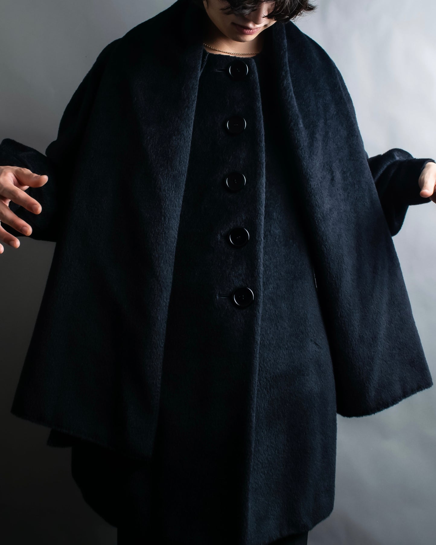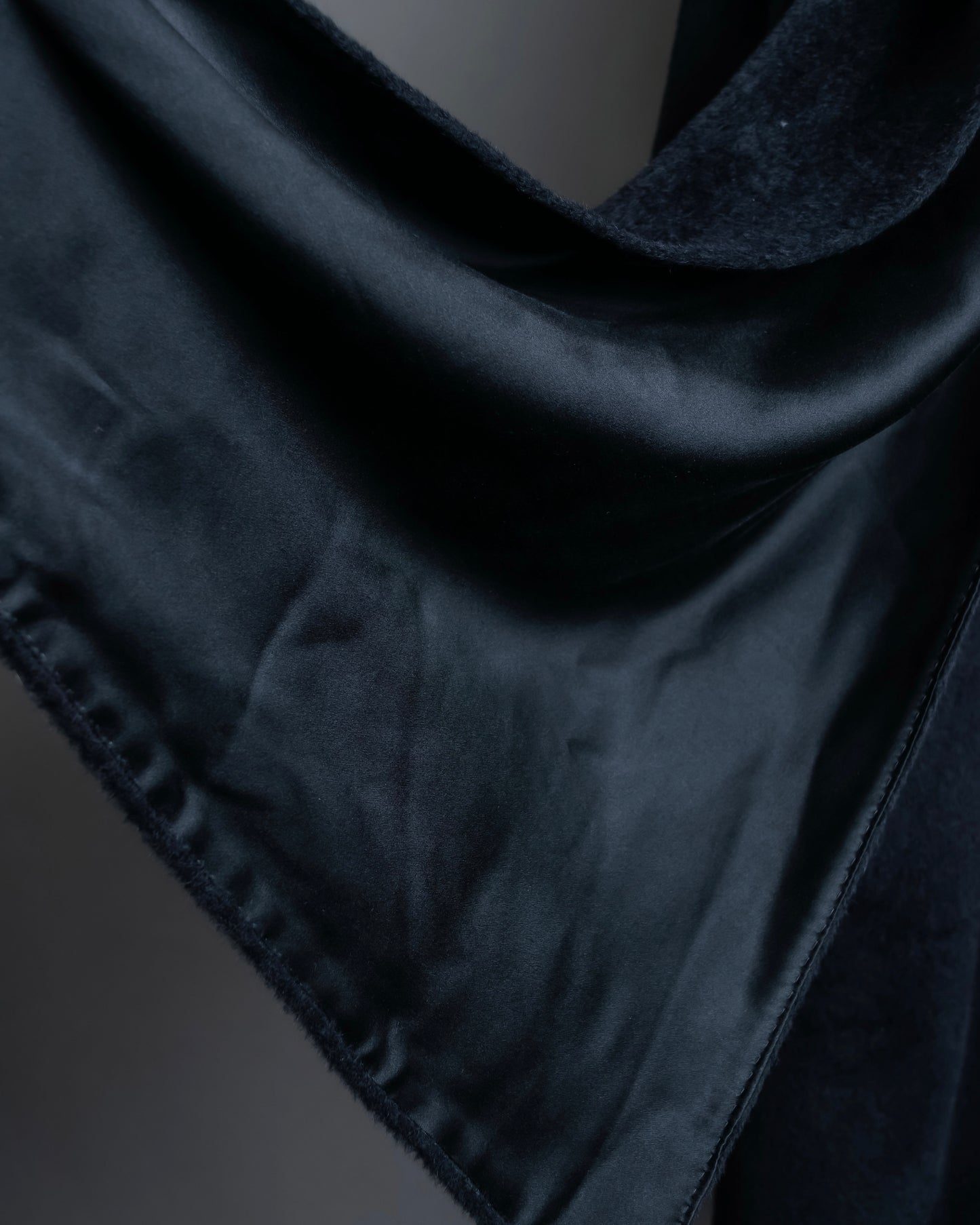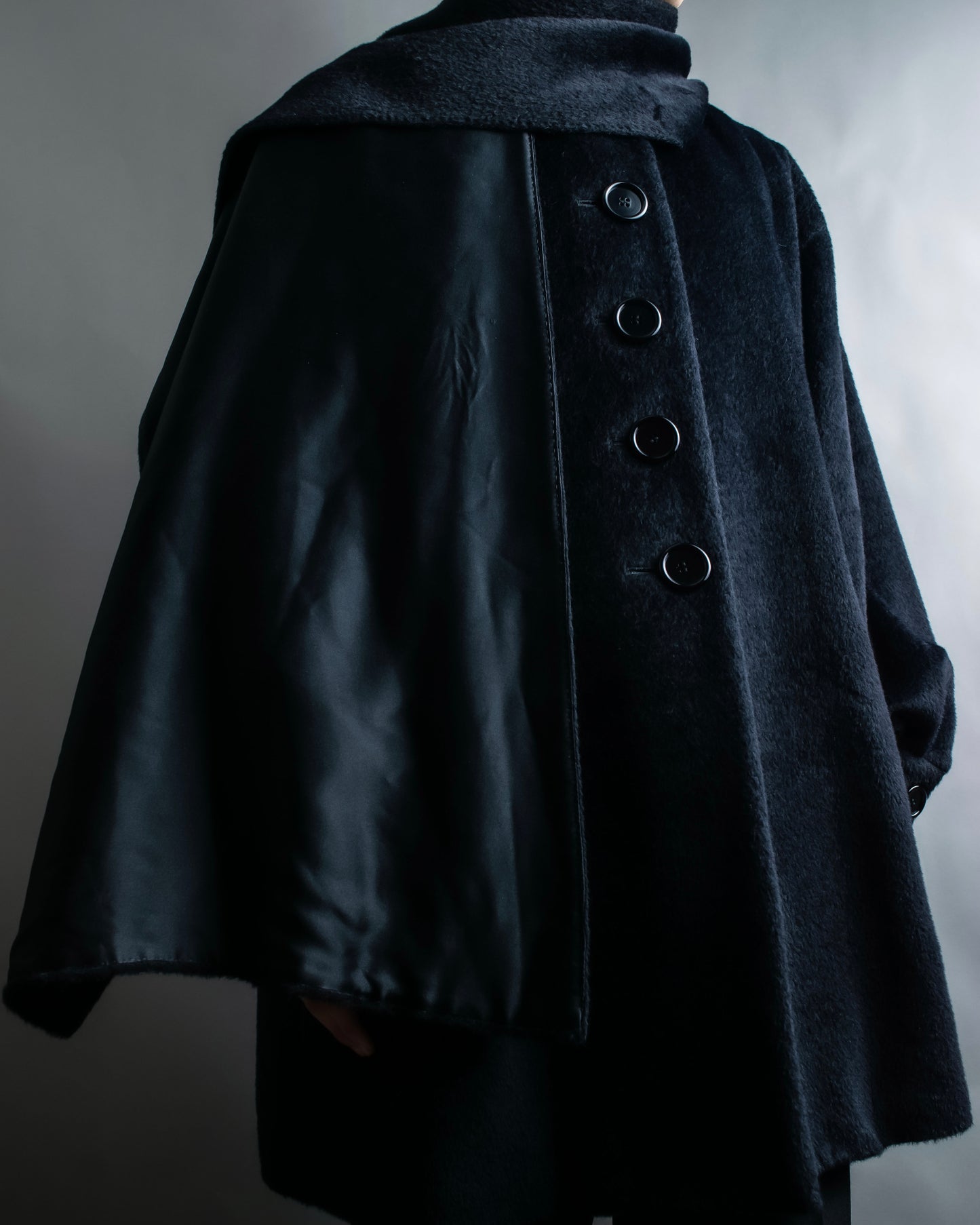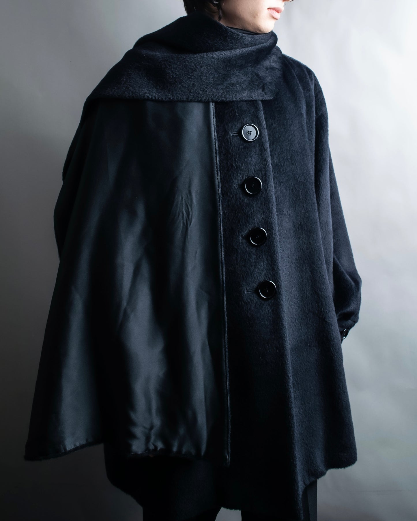 ショールの様に無造作に垂らして頂いたりと、様々なスタイルでお楽しみ頂けるケープデザインで、表地だとよりエレガントに、裏地を持ってくるとモードな印象に仕上げることが出来る大変万能性のあるデザインとなっております。