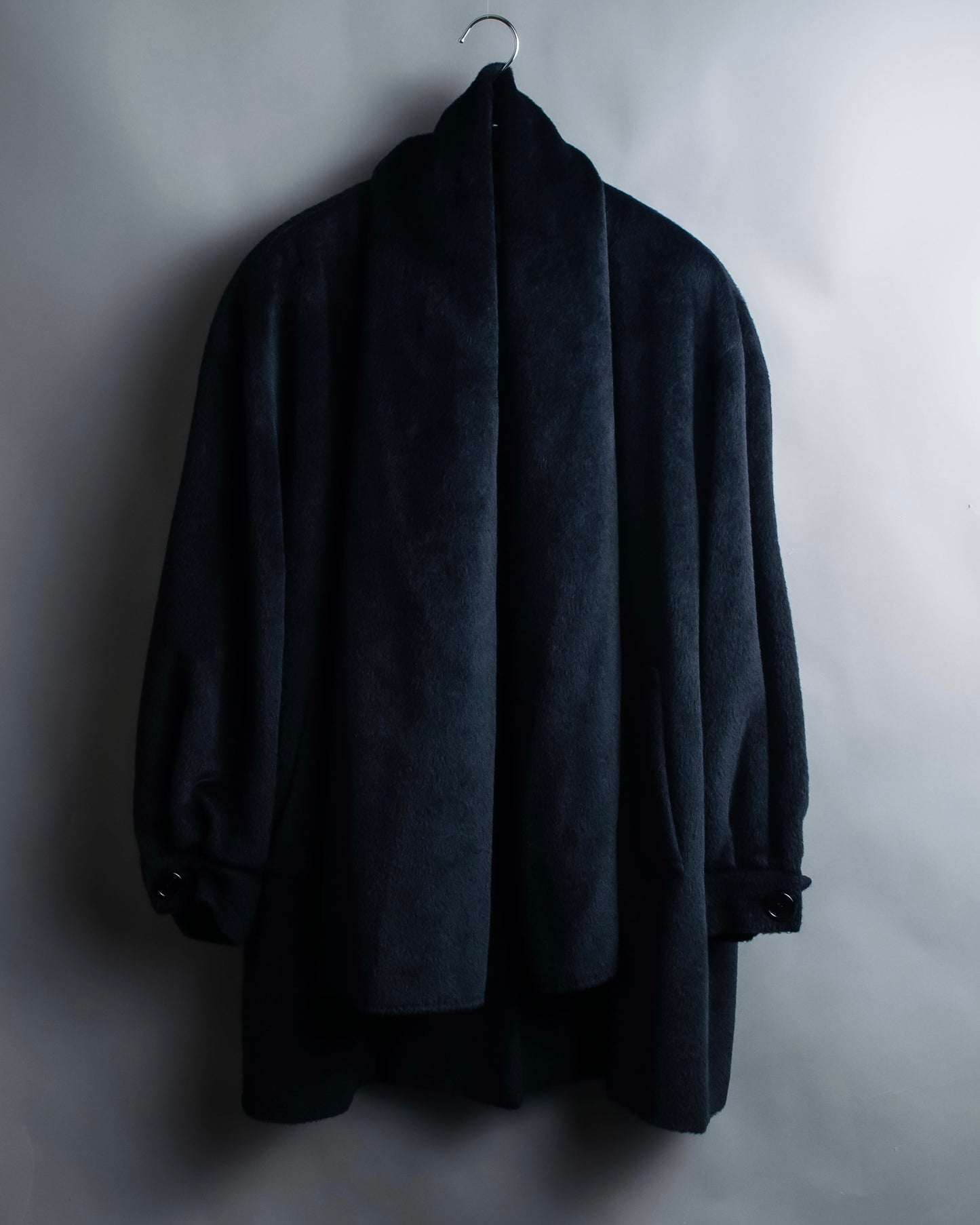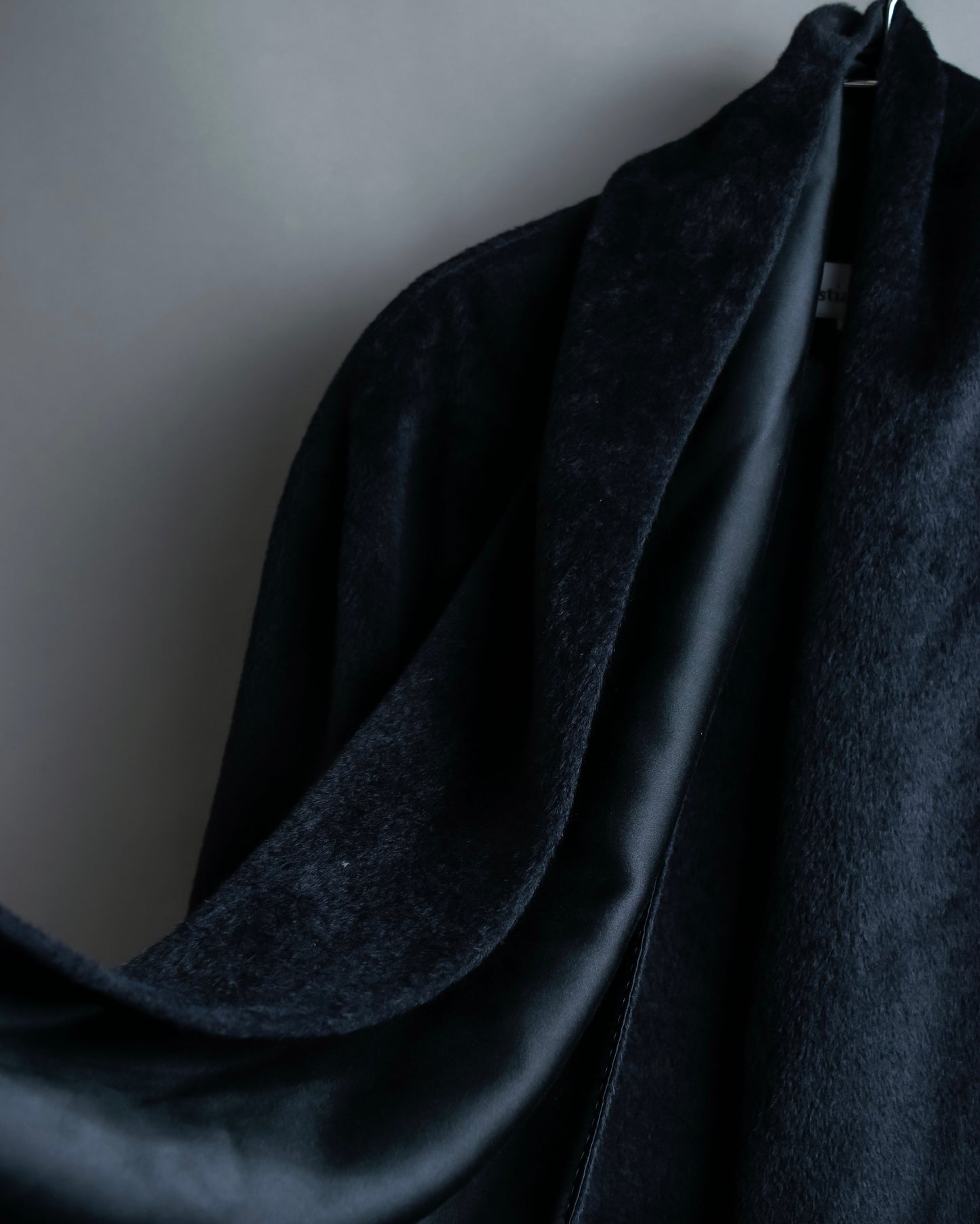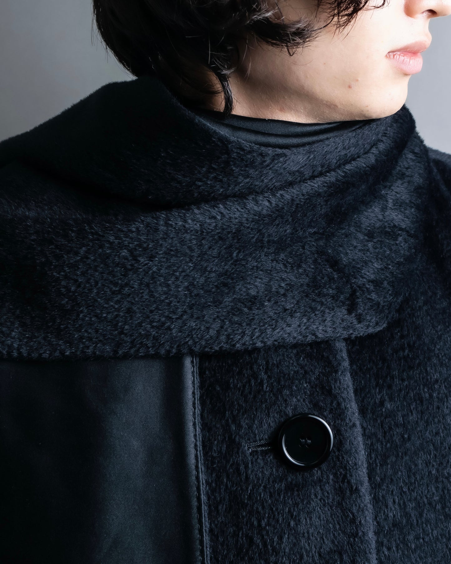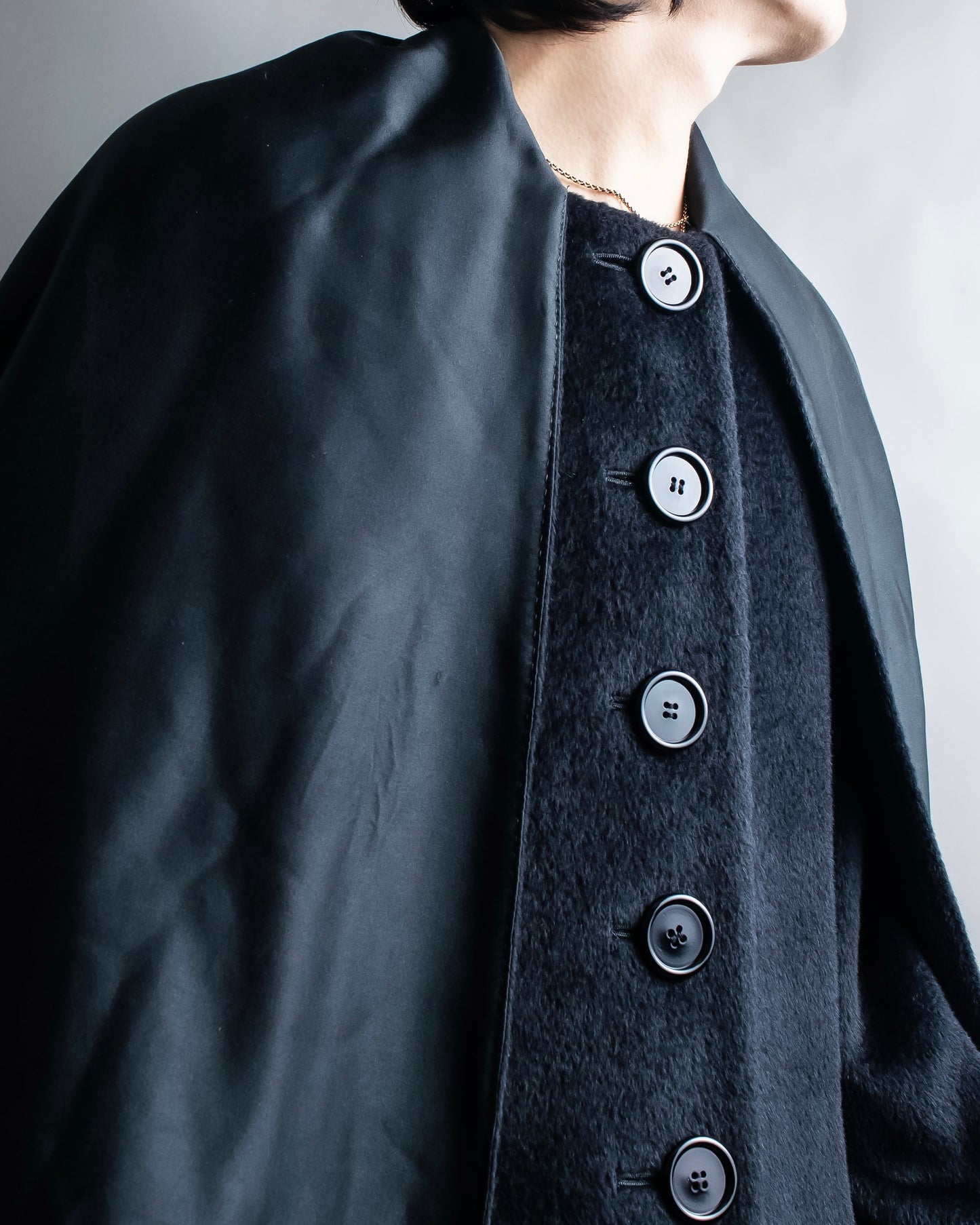 ショールの様に無造作に垂らして頂いたりと、様々なスタイルでお楽しみ頂けるケープデザインで、表地だとよりエレガントに、裏地を持ってくるとモードな印象に仕上げることが出来る大変万能性のあるデザインとなっております。
