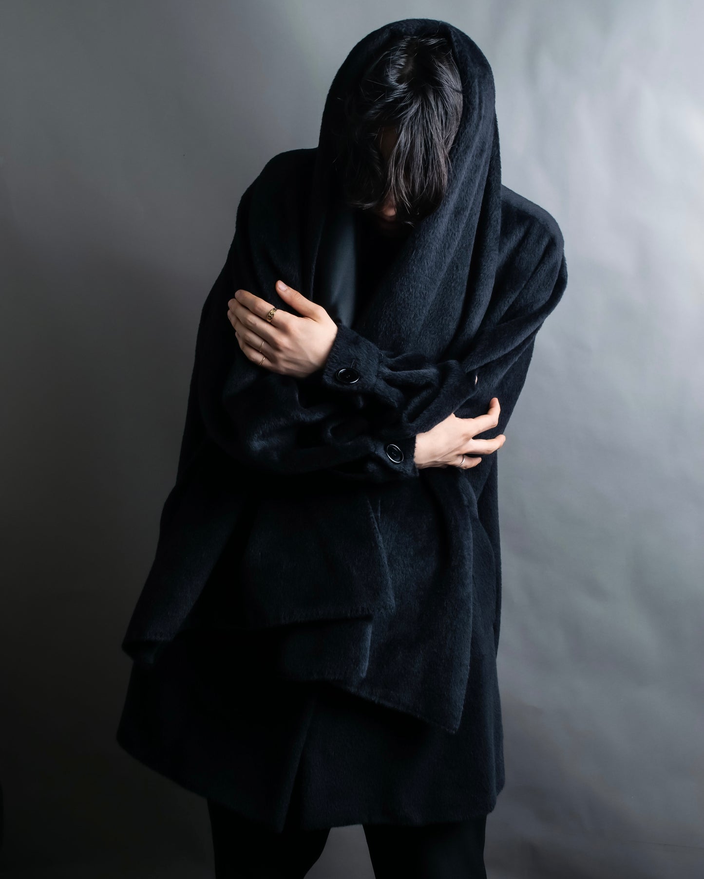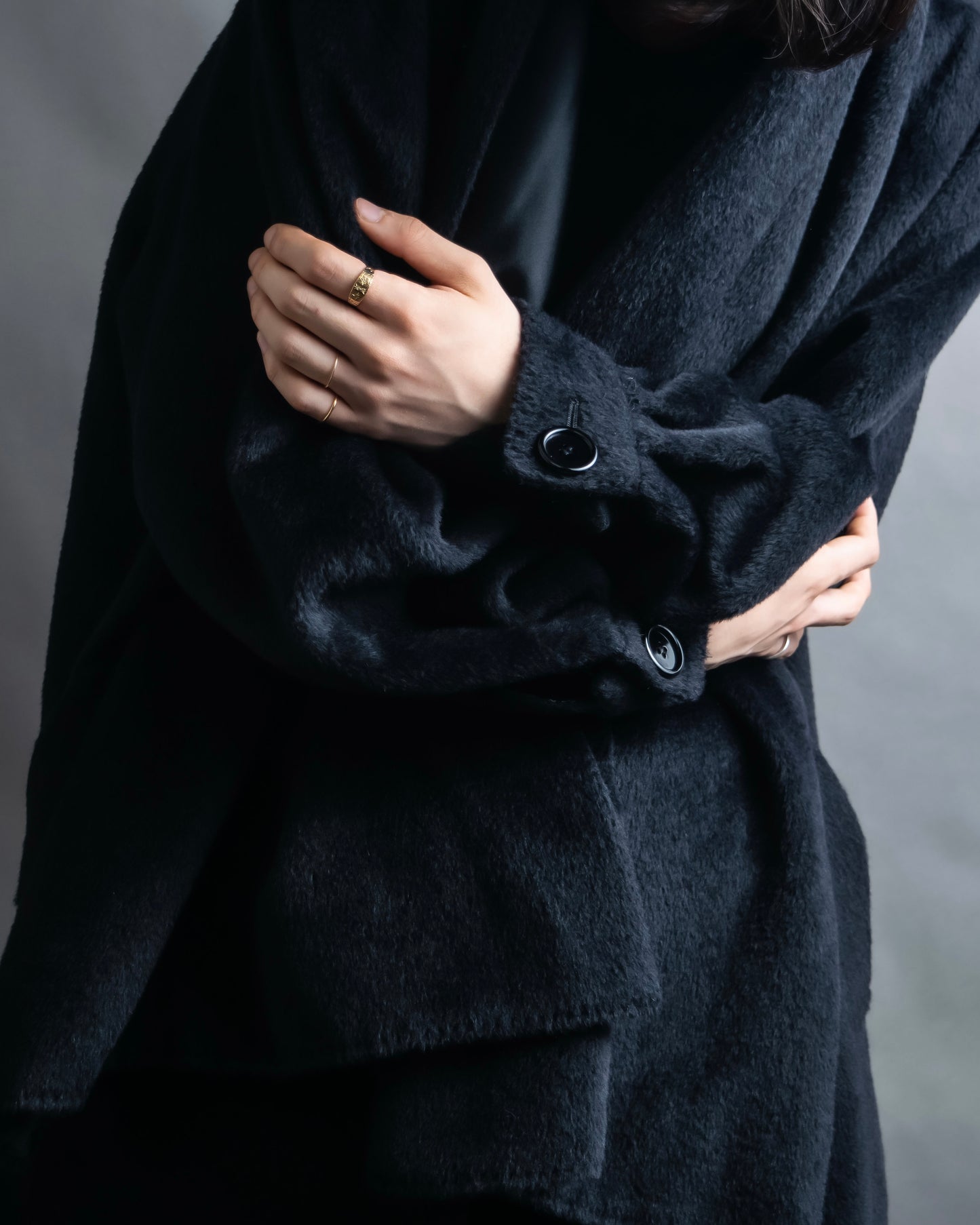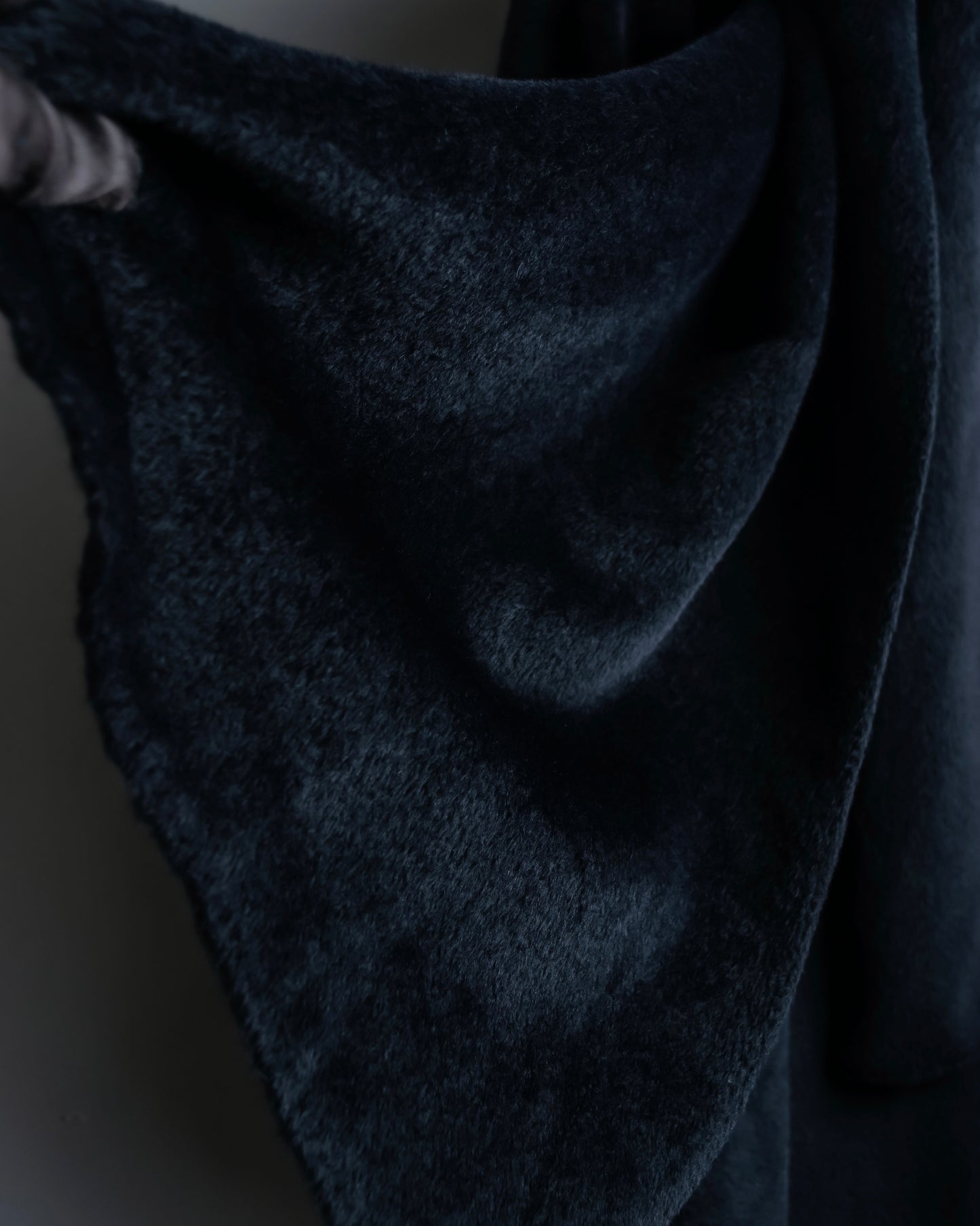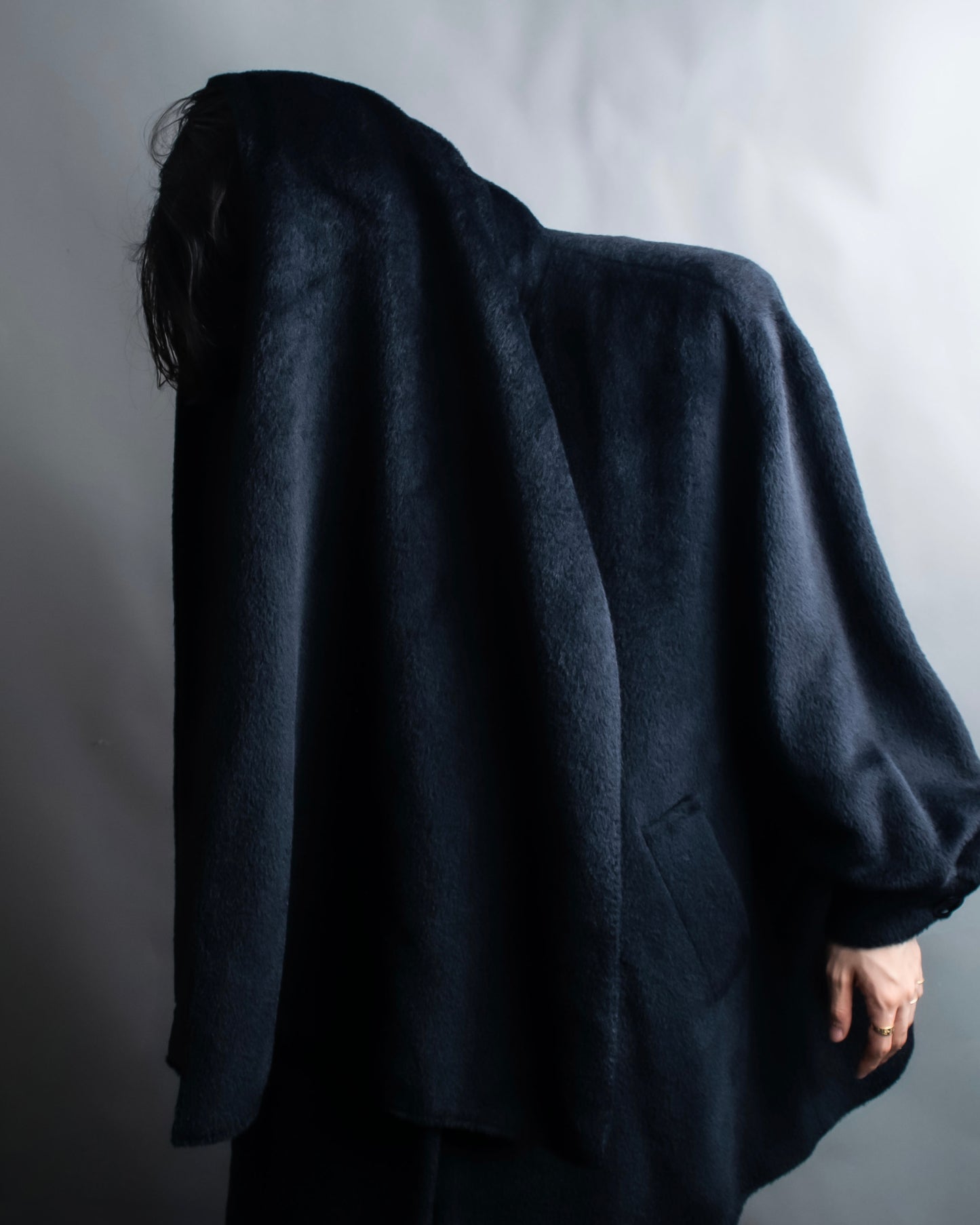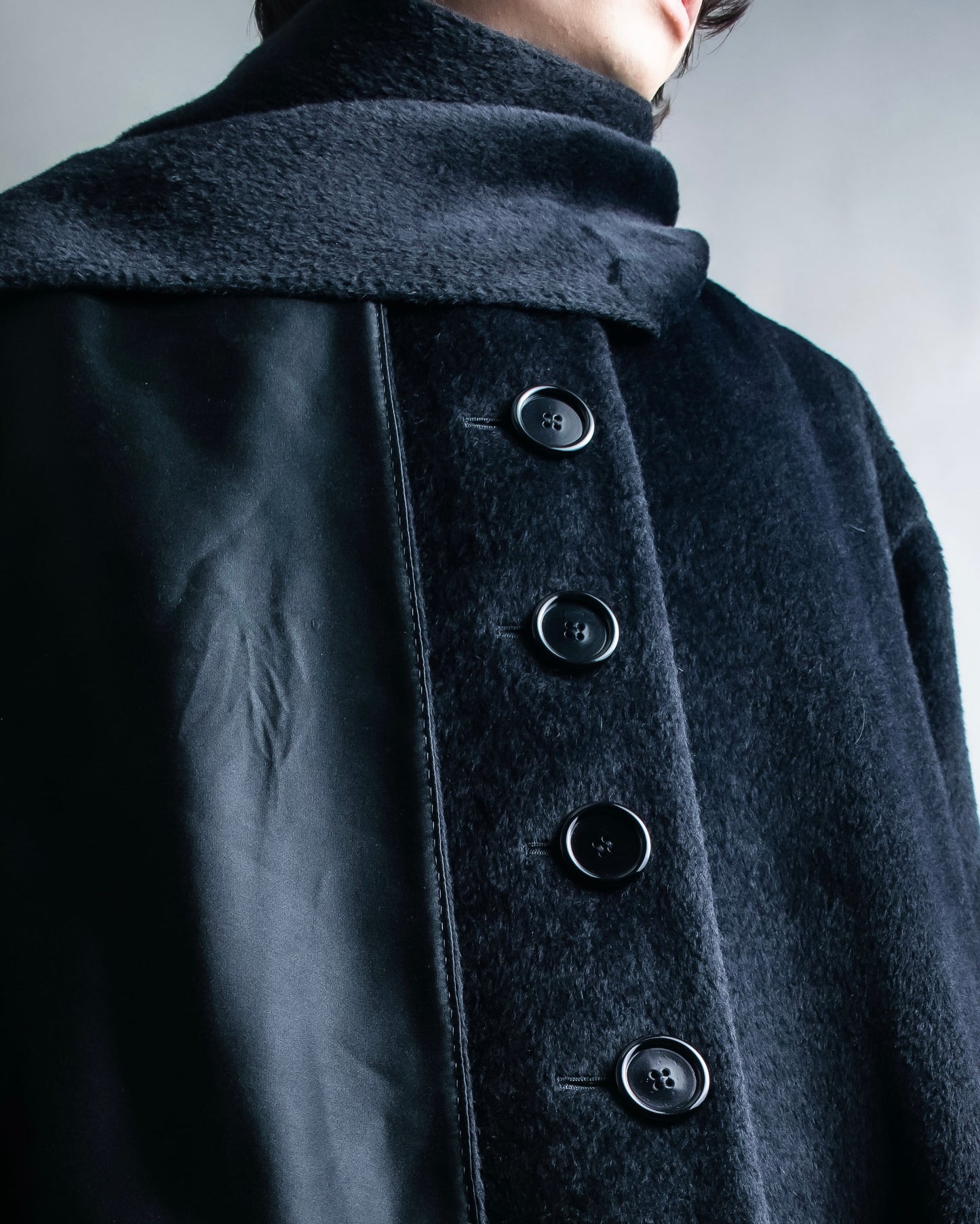 ショールの様に無造作に垂らして頂いたりと、様々なスタイルでお楽しみ頂けるケープデザインで、表地だとよりエレガントに、裏地を持ってくるとモードな印象に仕上げることが出来る大変万能性のあるデザインとなっております。