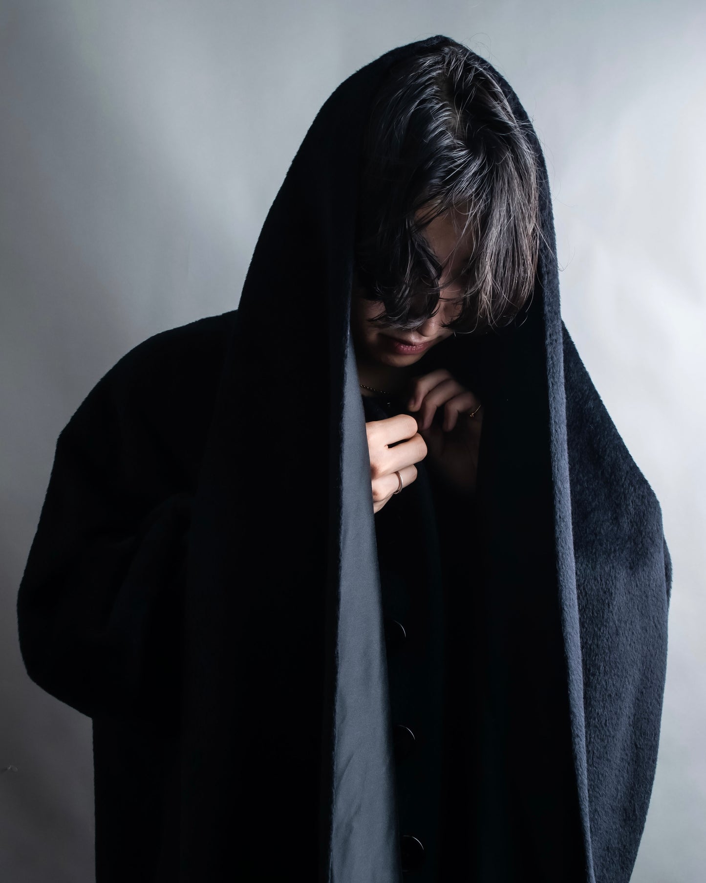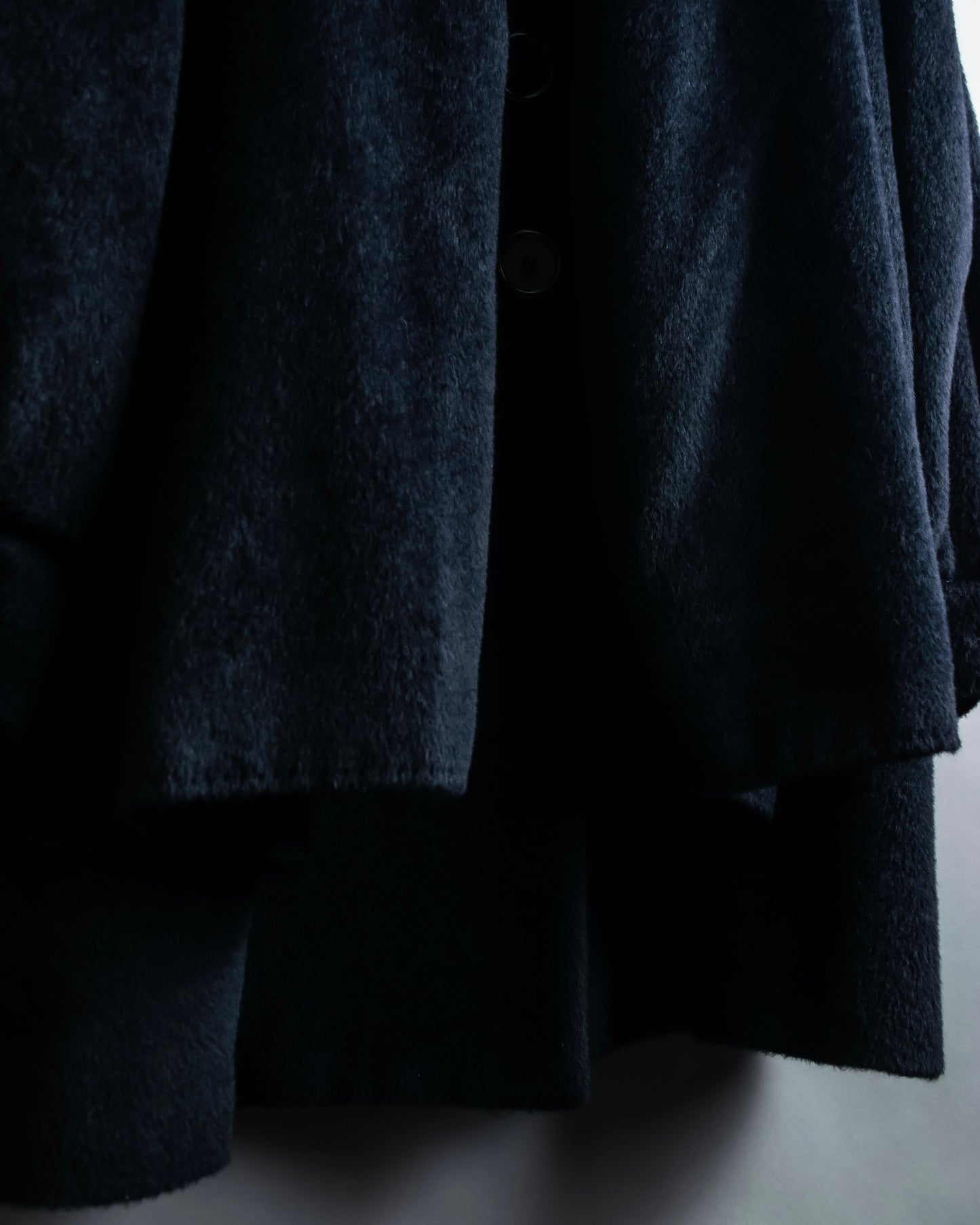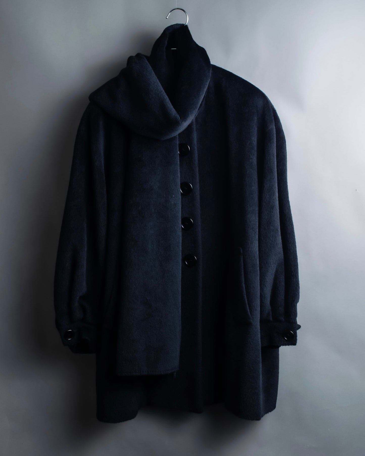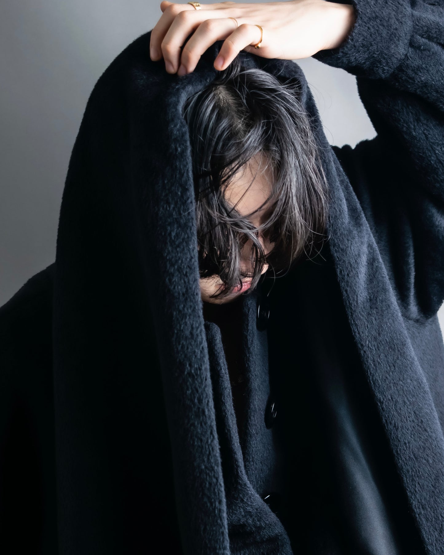 ショールの様に無造作に垂らして頂いたりと、様々なスタイルでお楽しみ頂けるケープデザインで、表地だとよりエレガントに、裏地を持ってくるとモードな印象に仕上げることが出来る大変万能性のあるデザインとなっております。