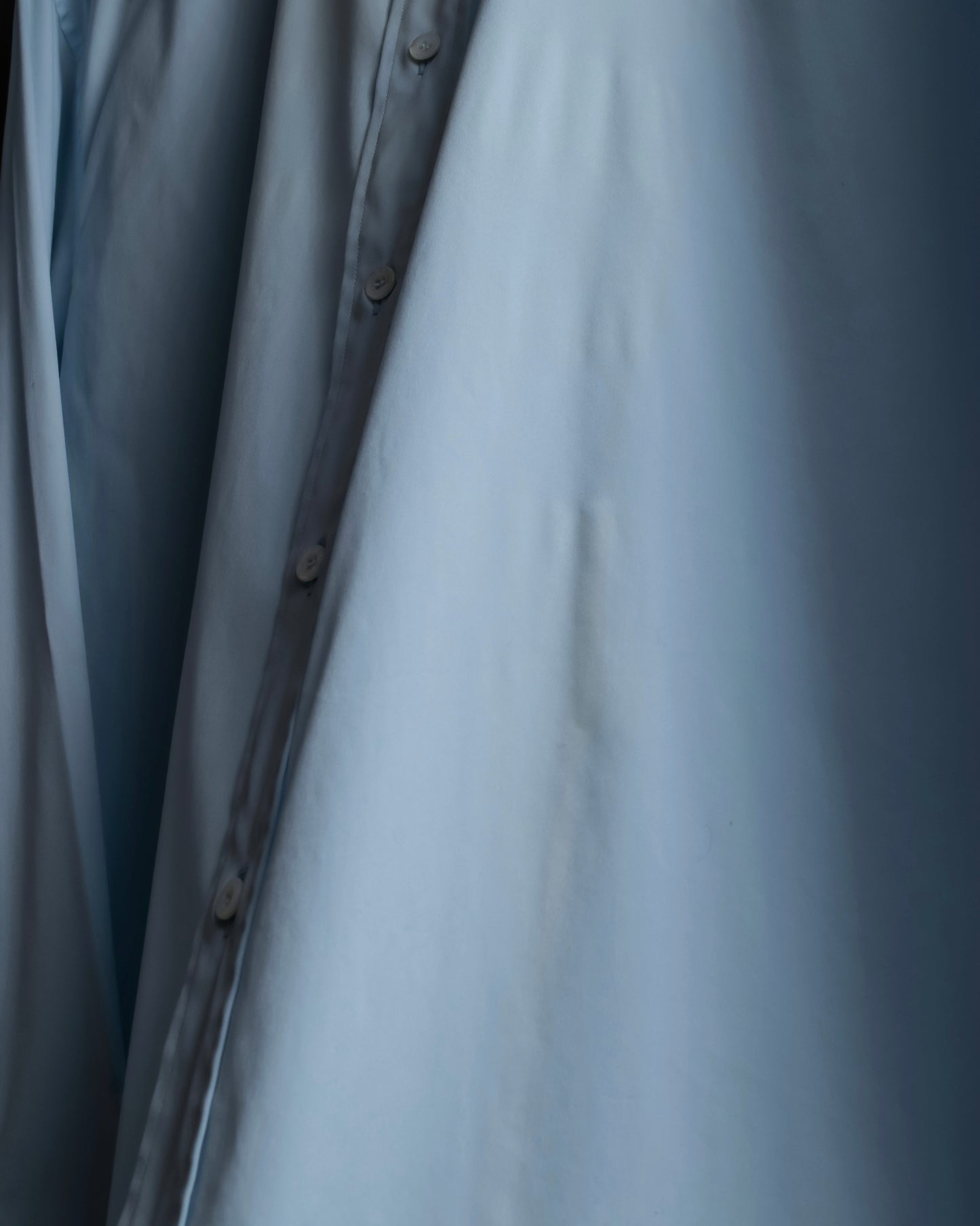 クラシックなシャツフォルムを踏襲しつつも、襟元のラインはややラウンドを効かせることで、どこか柔らかな空気感が生まれており、ボディ全体はゆったりとしたシルエットで設計されているため、ジェンダーに縛られない自由な着こなしを楽しんでいただけますね。