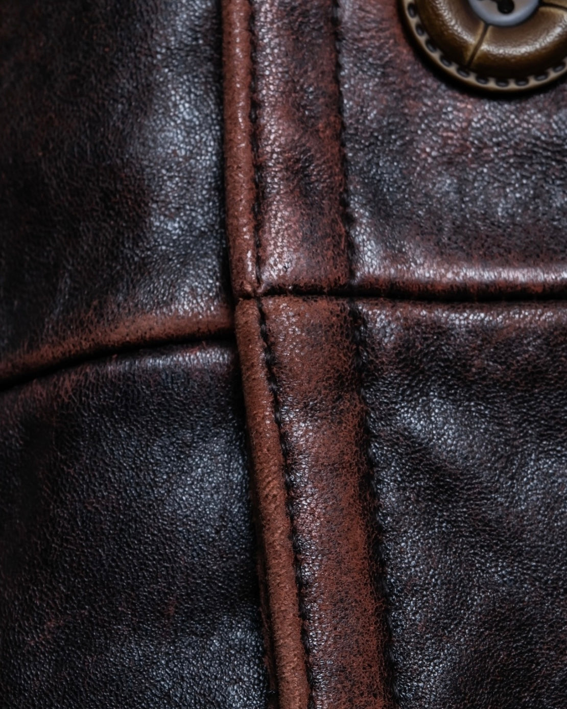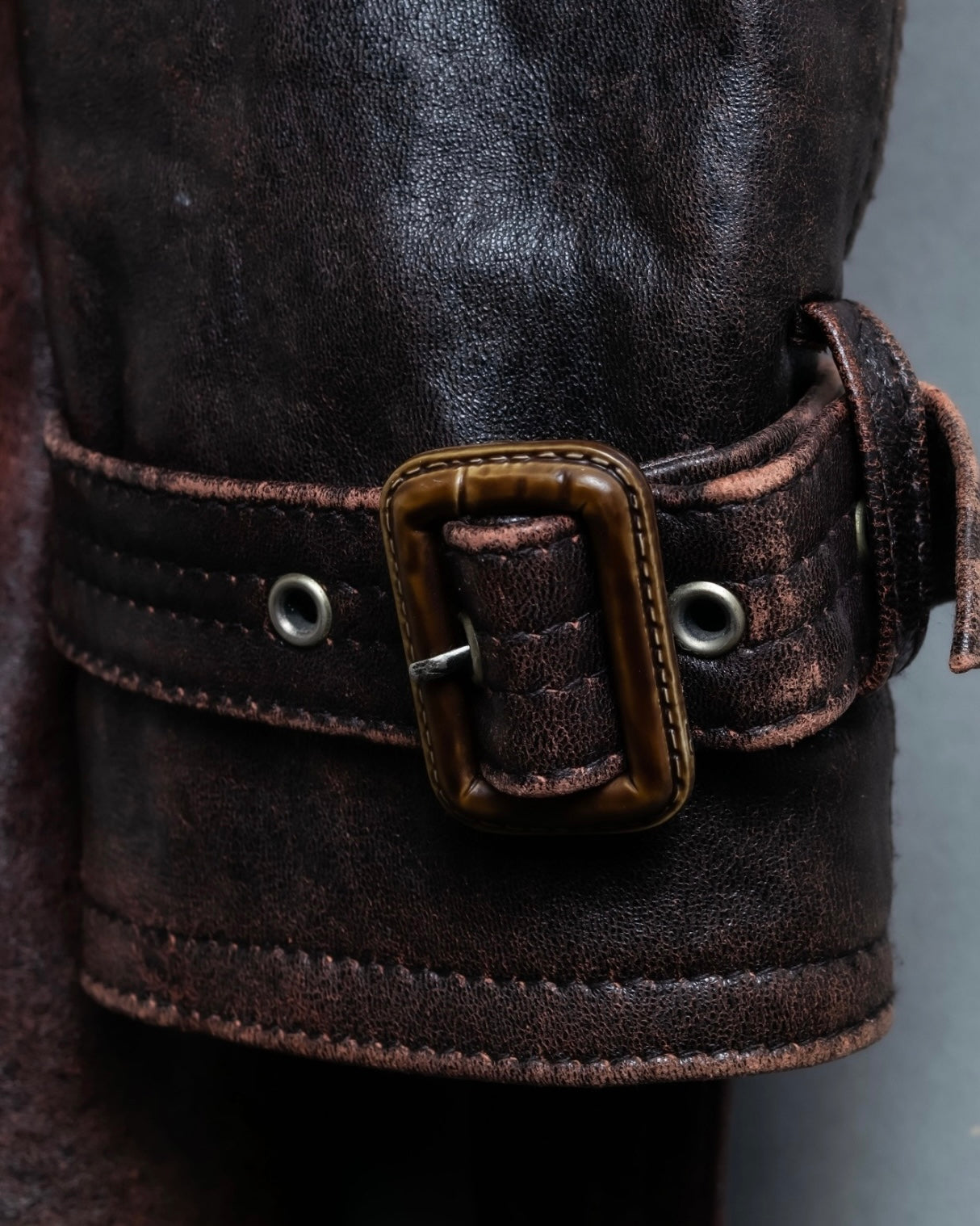 MOODでは基本的に滑らかなシルエットを持つマキシ丈のレザーコートを取り扱う事が多いですが、今回はエイジングの効いたダークワインレッドカラーのヴィンテージ要素を感じさせる逸品をセレクト。